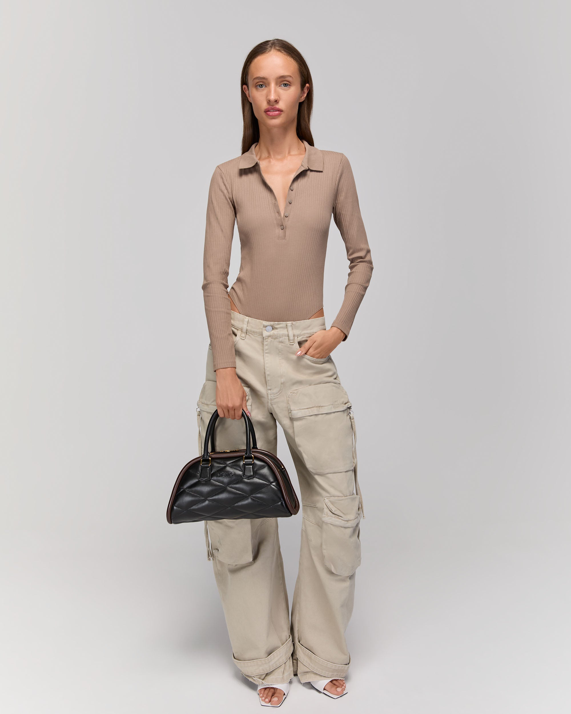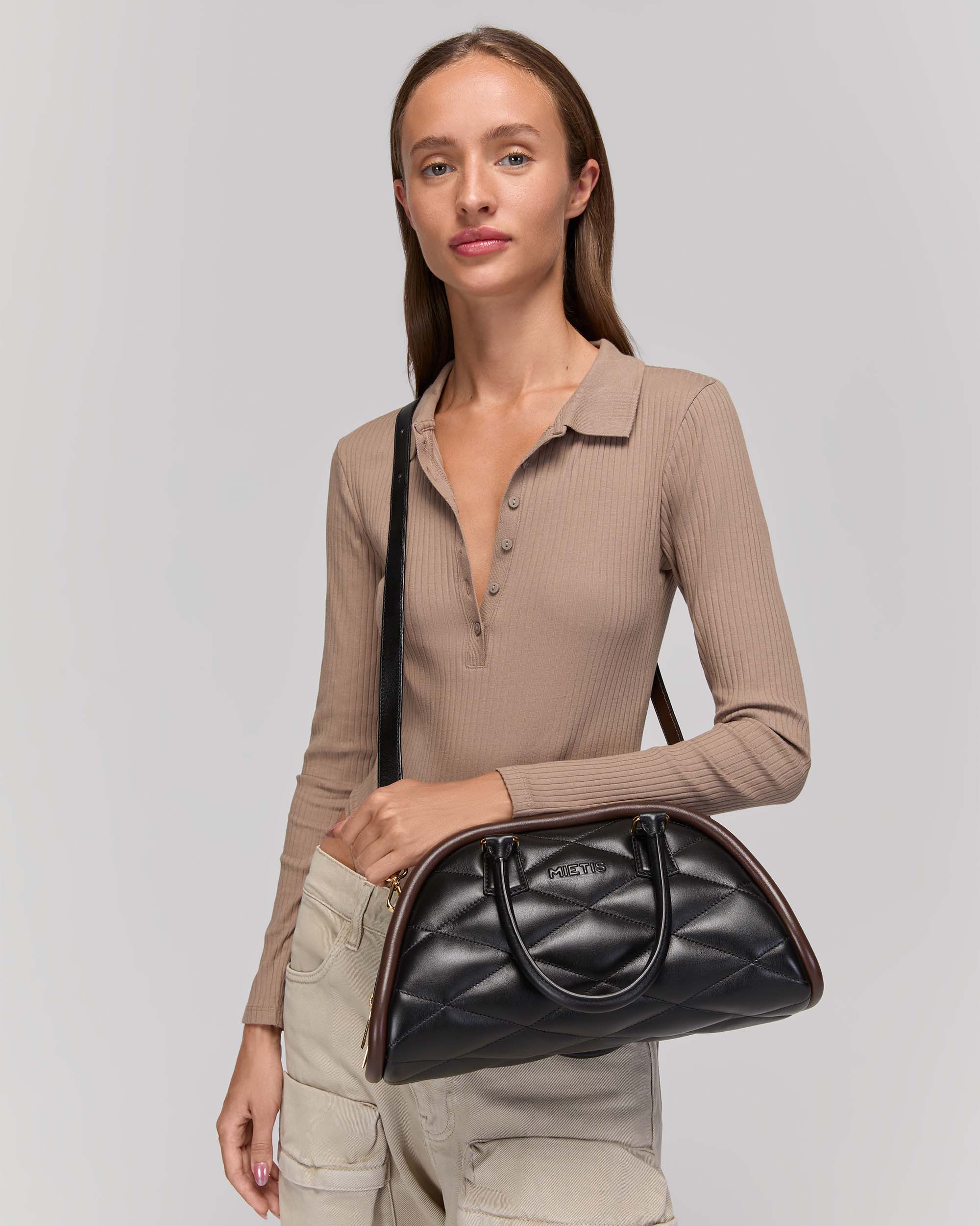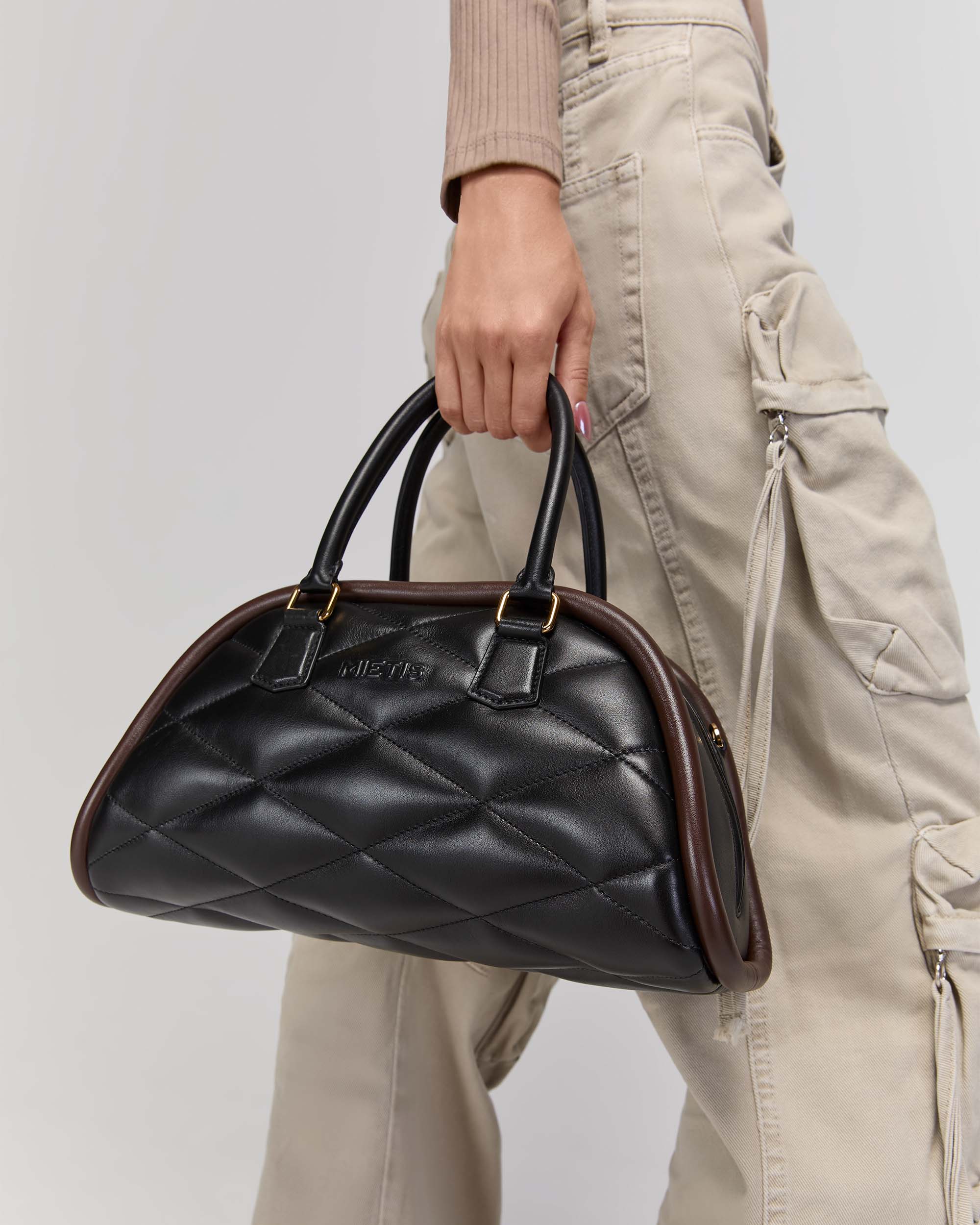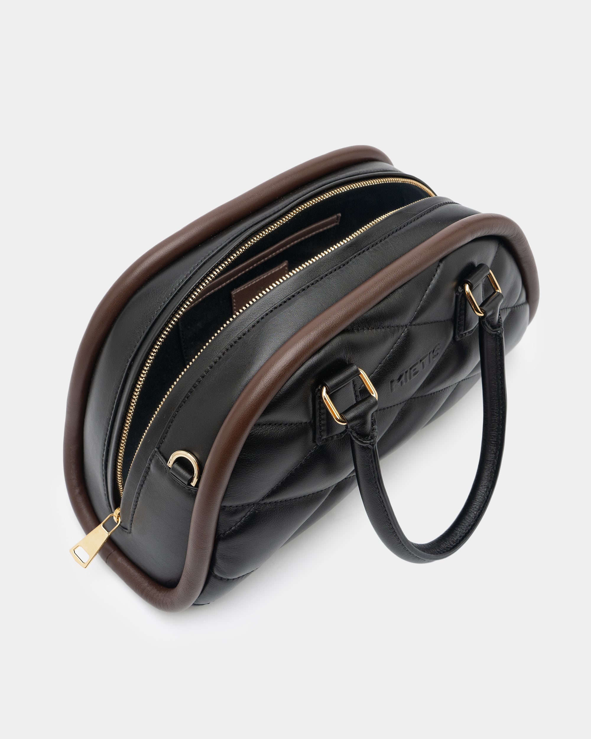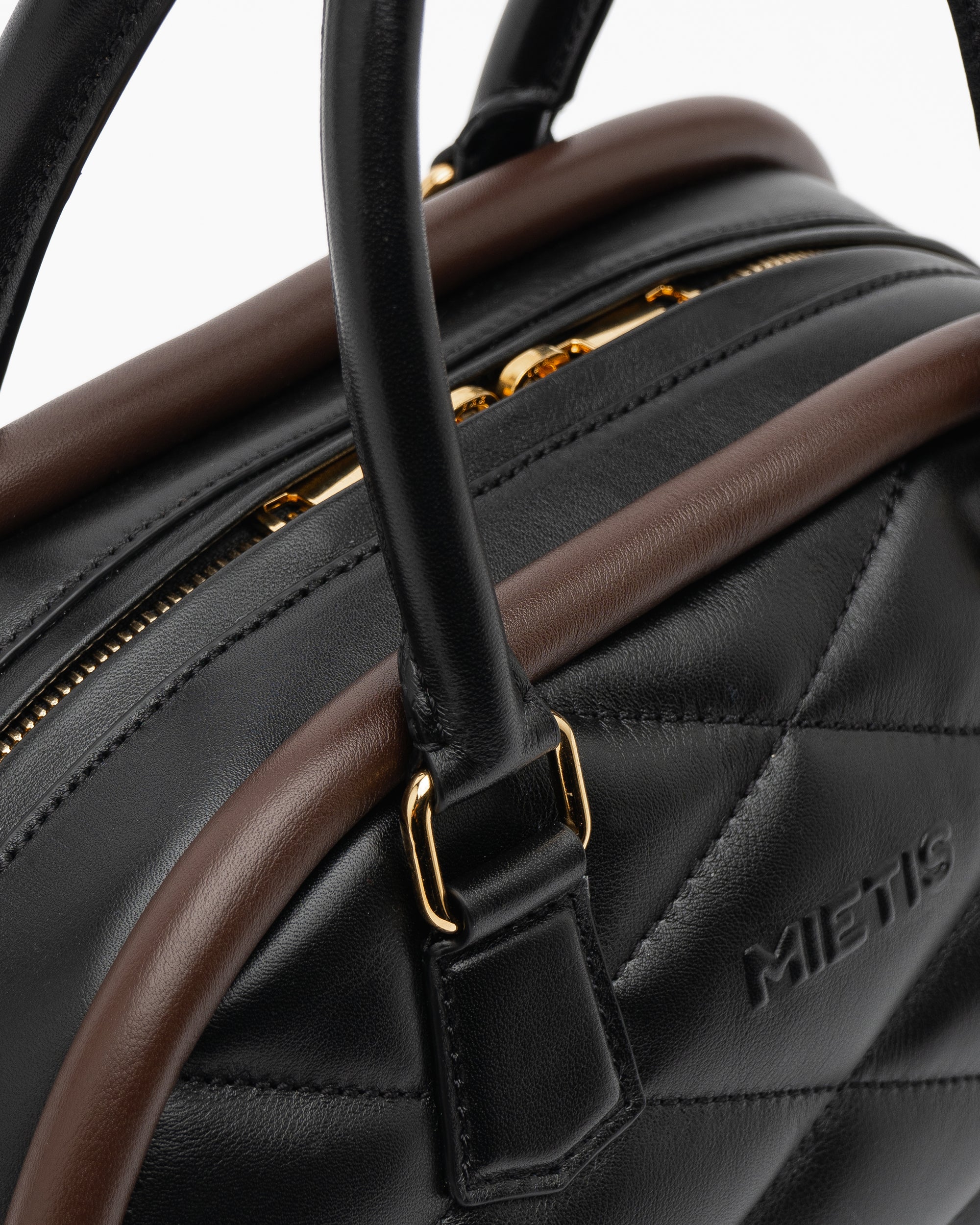 Its evolving shape, highlighted by a bold distinctive trim, creates an appealing play of colors. Crafted in Mia leather for a luxurious tactile experience, it features a padded body with slightly flattened diamonds and the MIETIS logo in relief.