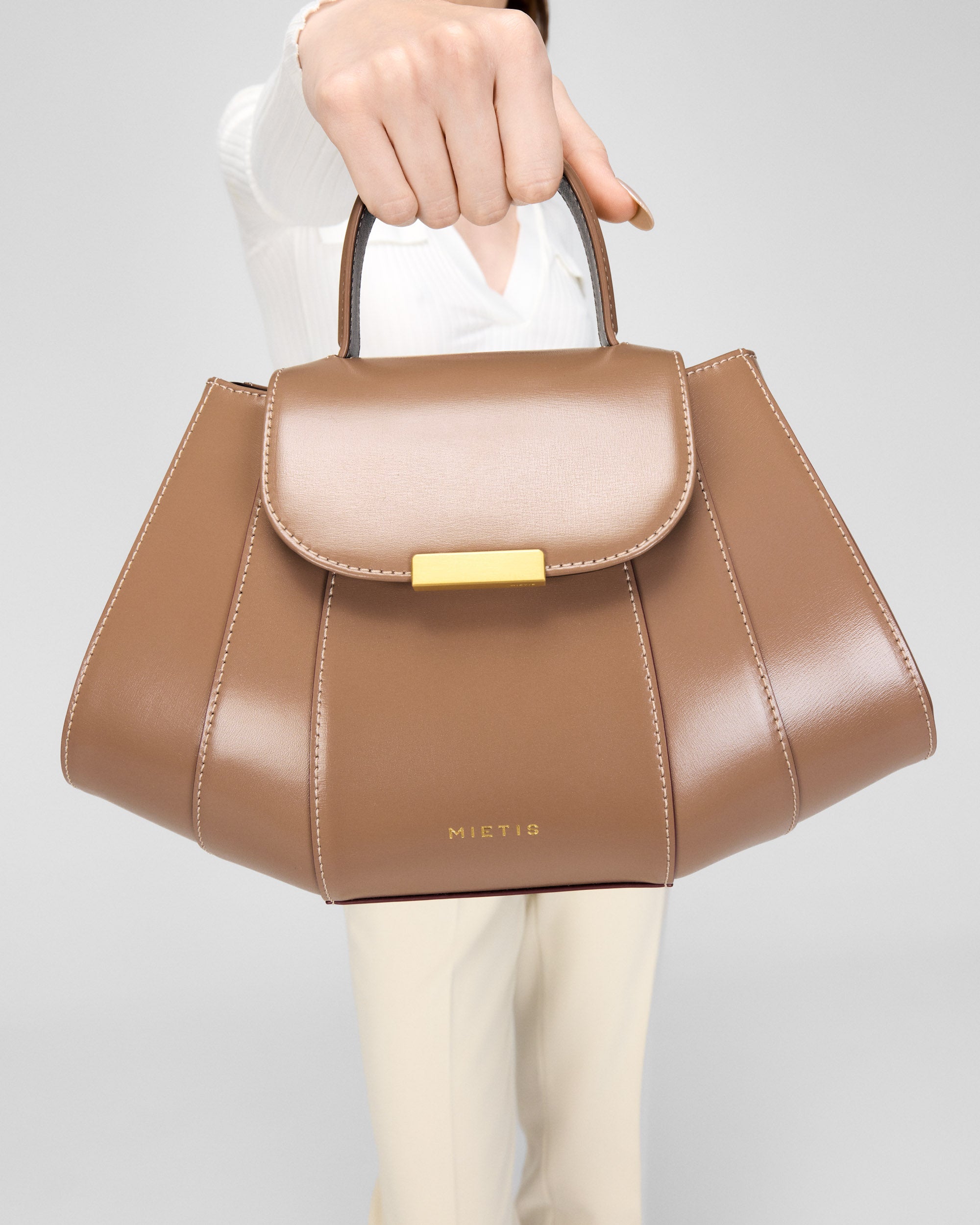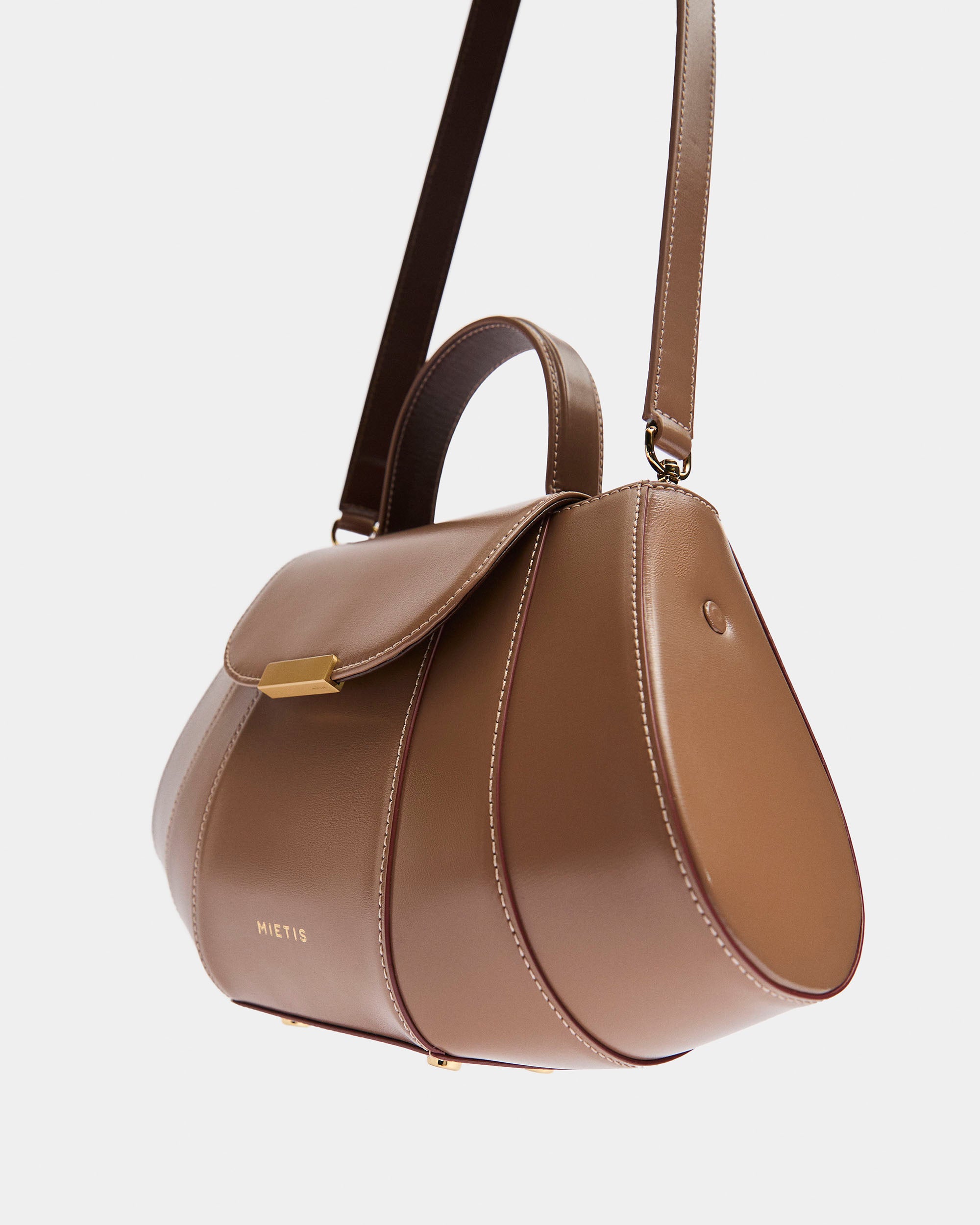 The Tatito bag is a bold expression of Mietis' signature craftsmanship, defined by its sculptural silhouette and impeccable structure. Crafted from smooth, stiff calf leather, its clean geometric lines create a refined yet distinctive presence. Designed for versatility, it can be elegantly carried by its top ergonomic handle or worn crossbody with its adjustable leather strap. The polished buckle detail adds a striking finishing touch, ensuring this piece stands out as a true statement of contemporary luxury.