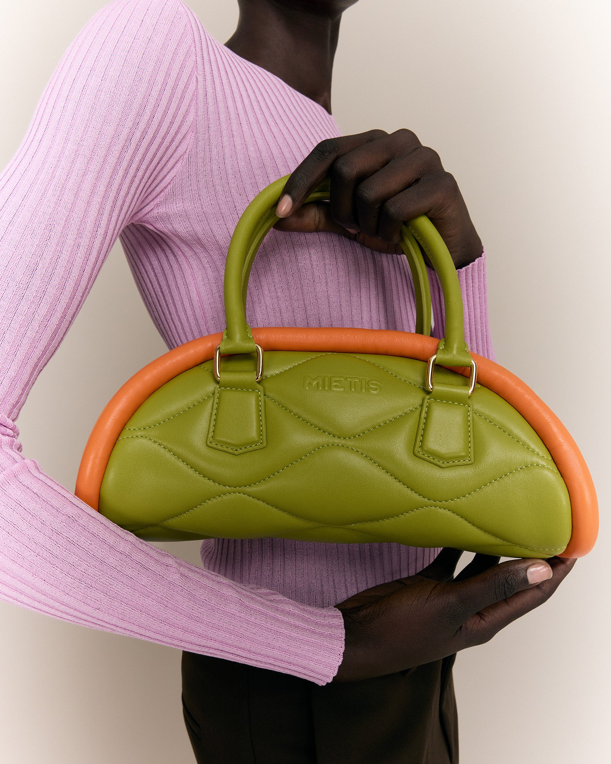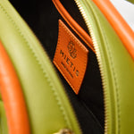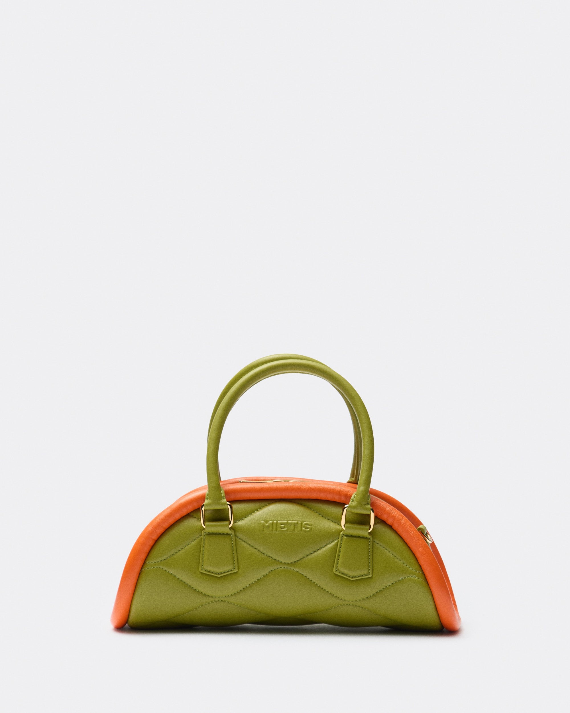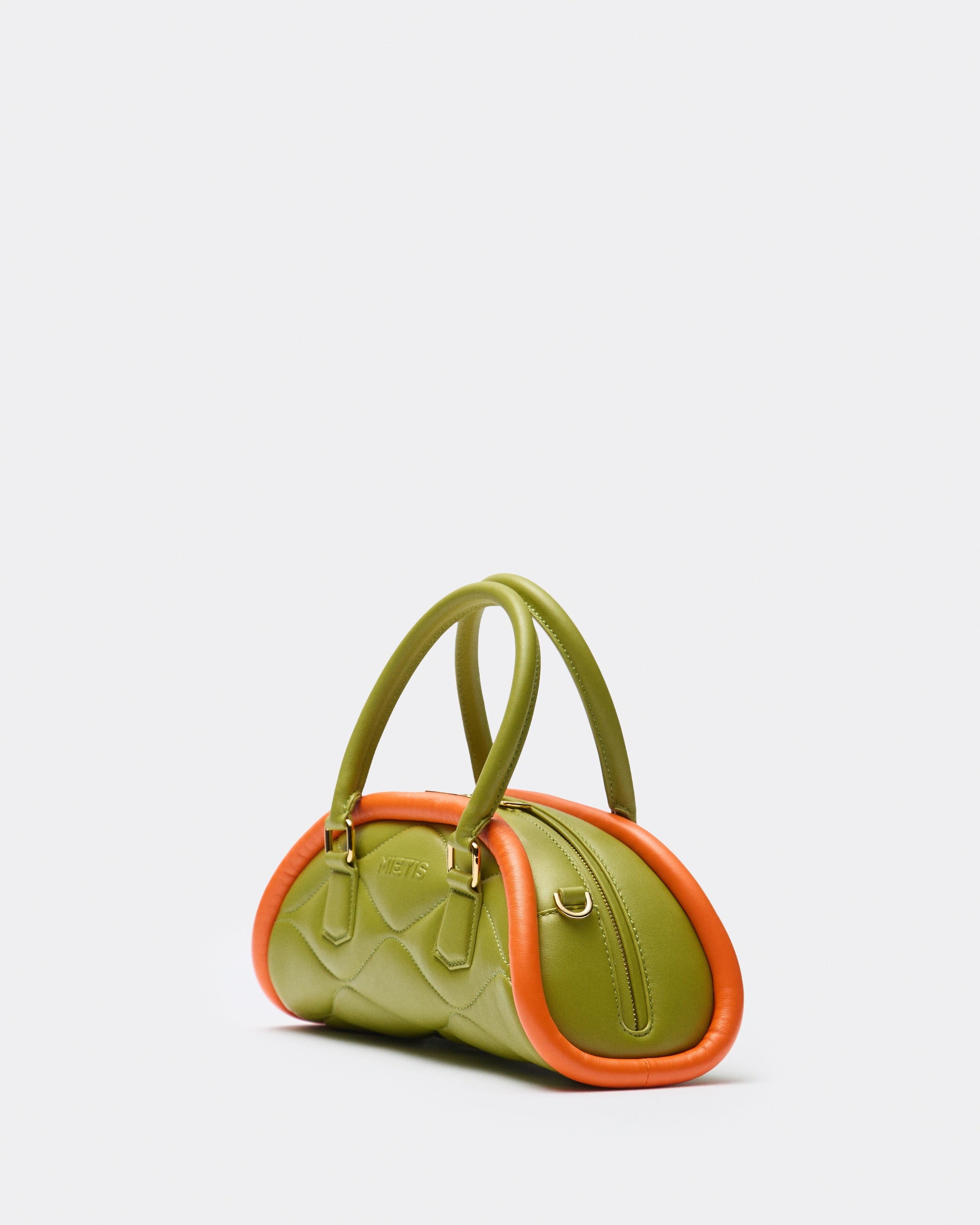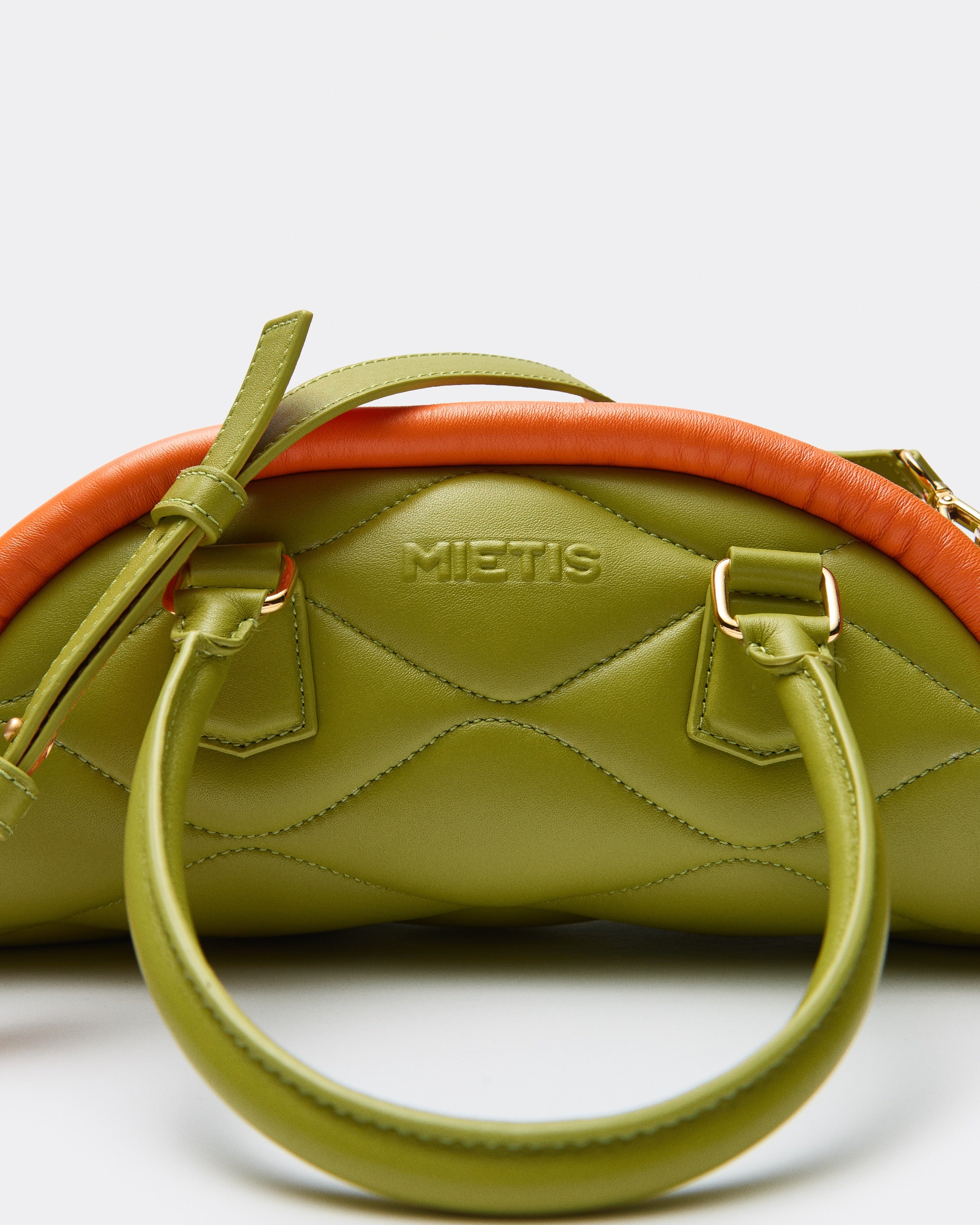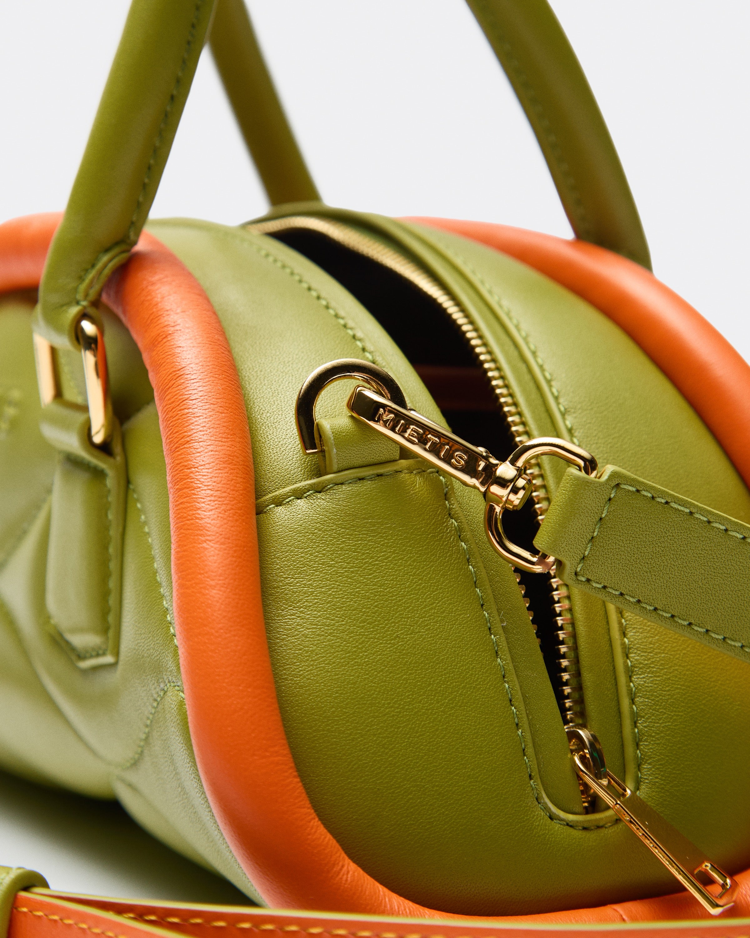 The Plutito Matcha reinterprets the classic bowling bag through MIETIS’ playful and distinctive lens. As our first soft bag, it stands out for its padded body, curved silhouette and bold contrast between fresh matcha green leather and vibrant orange piping.