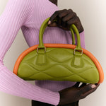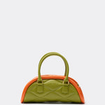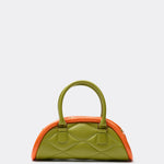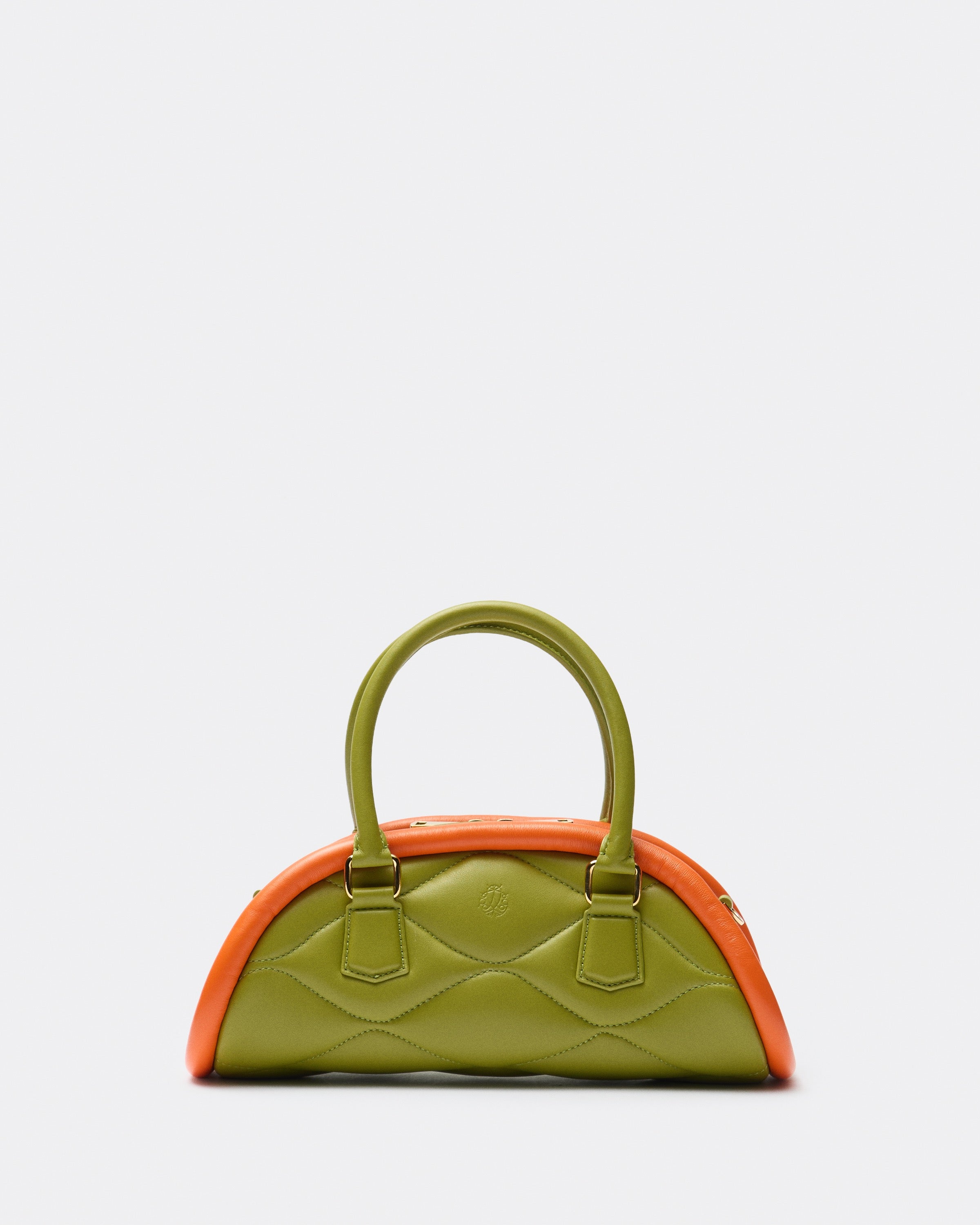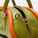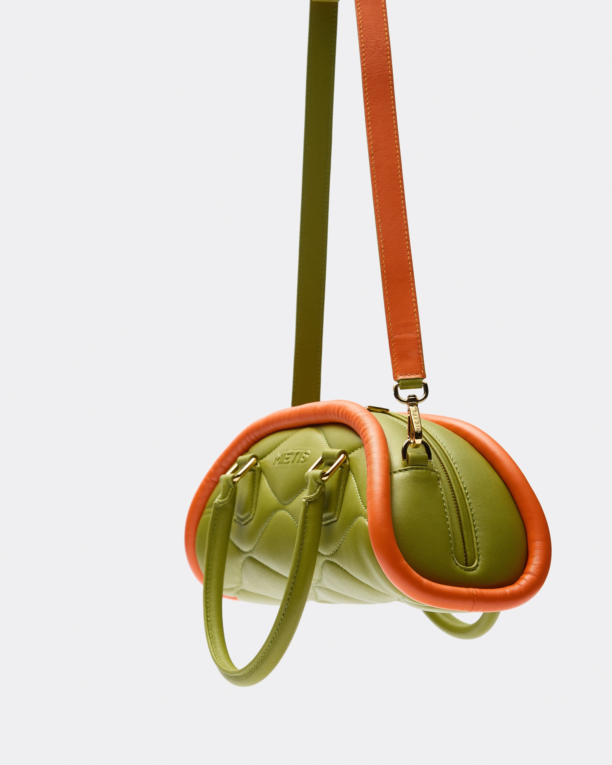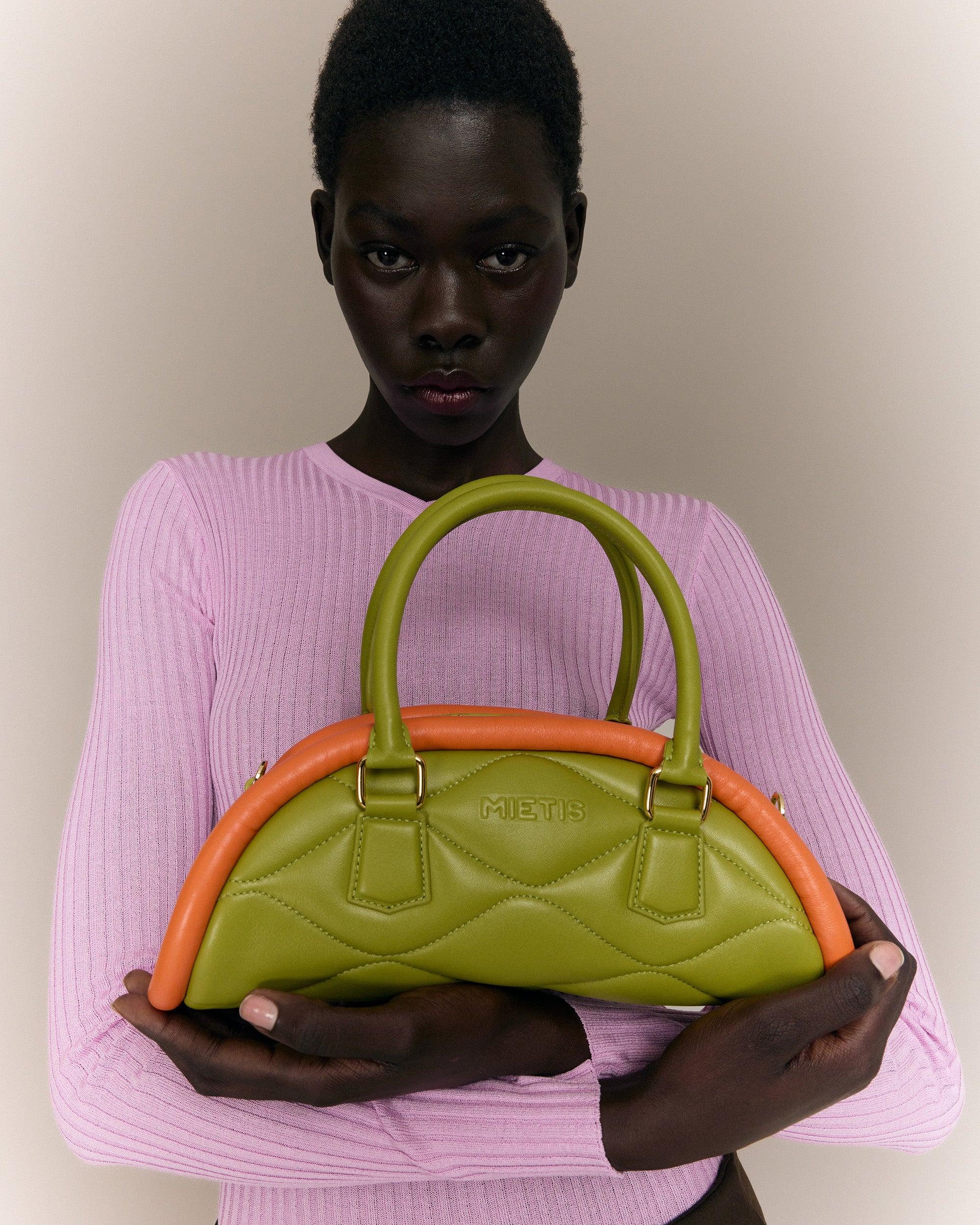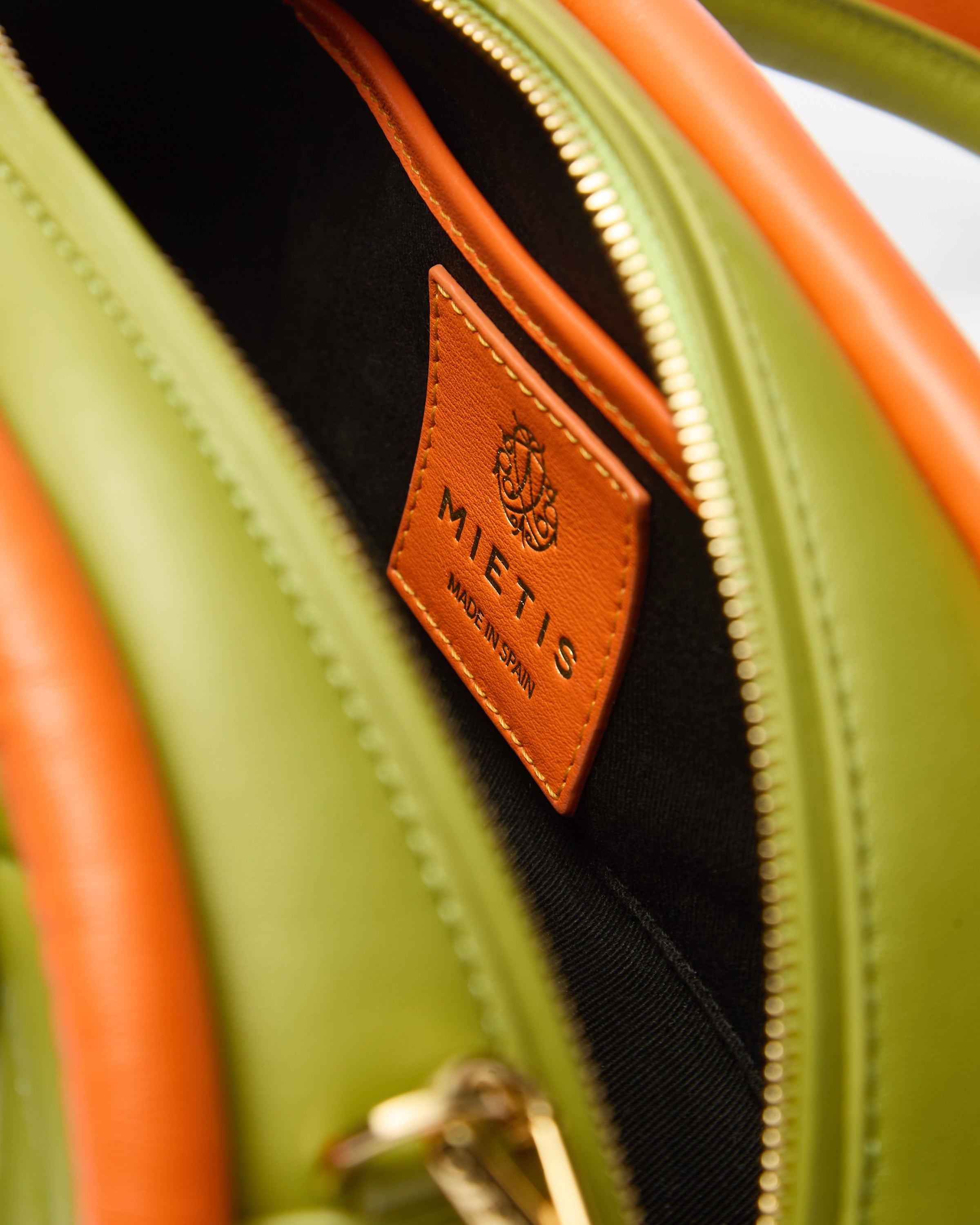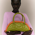 The Plutito Matcha reinterprets the classic bowling bag through MIETIS’ playful and distinctive lens. As our first soft bag, it stands out for its padded body, curved silhouette and bold contrast between fresh matcha green leather and vibrant orange piping.