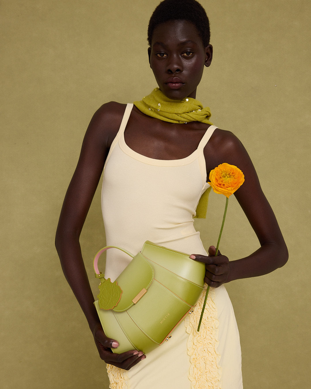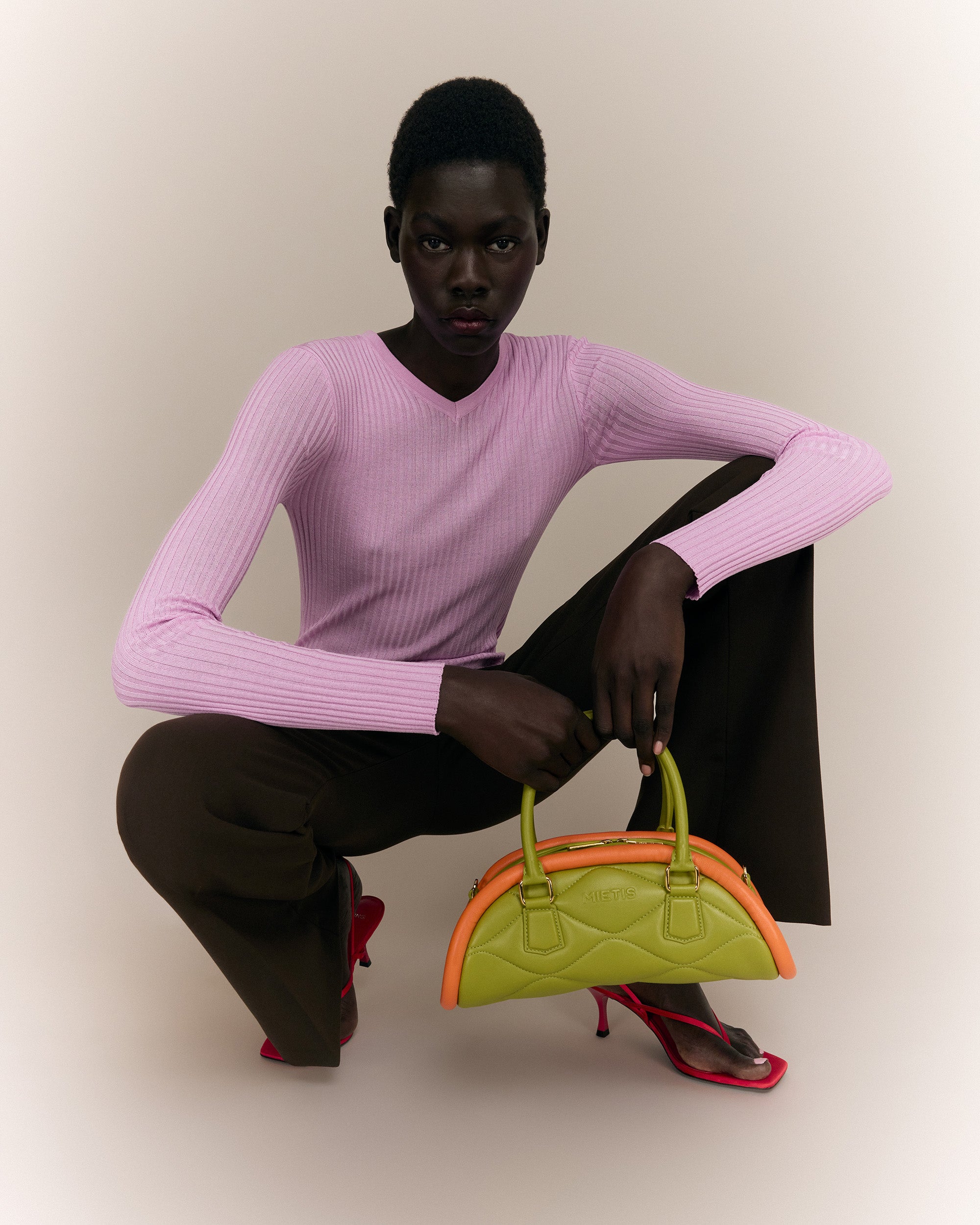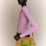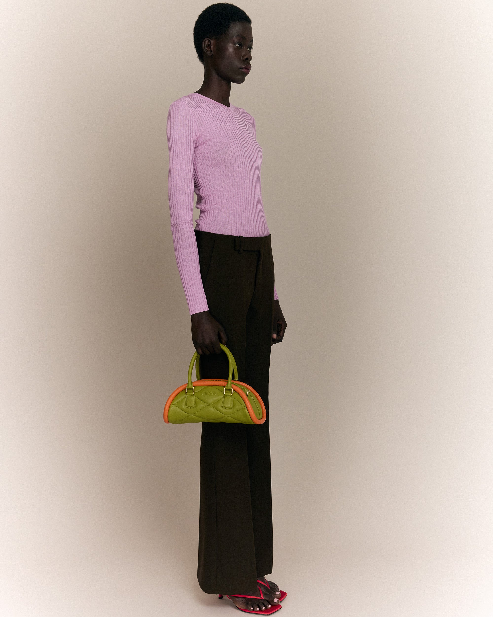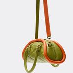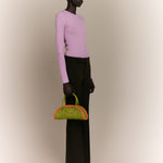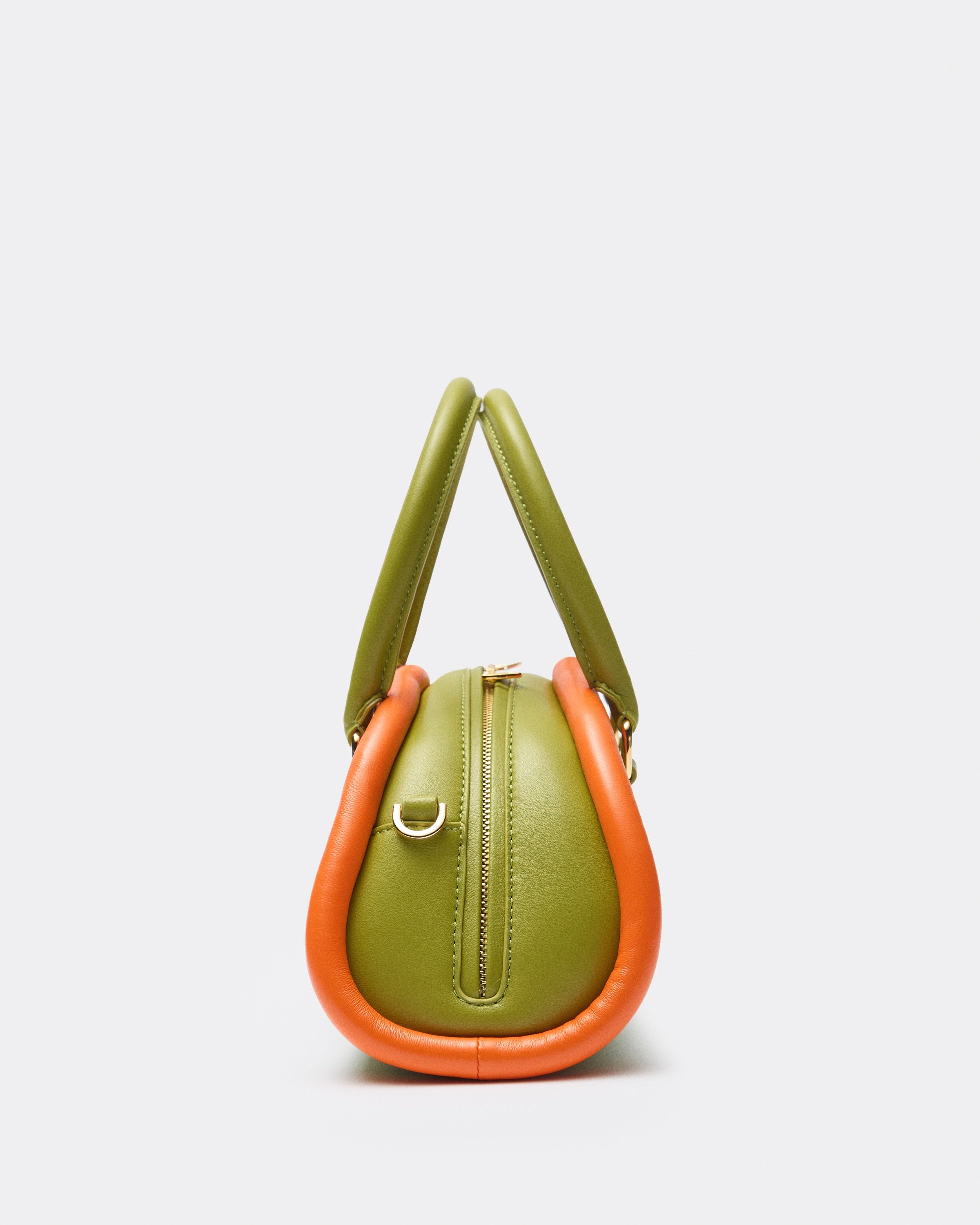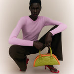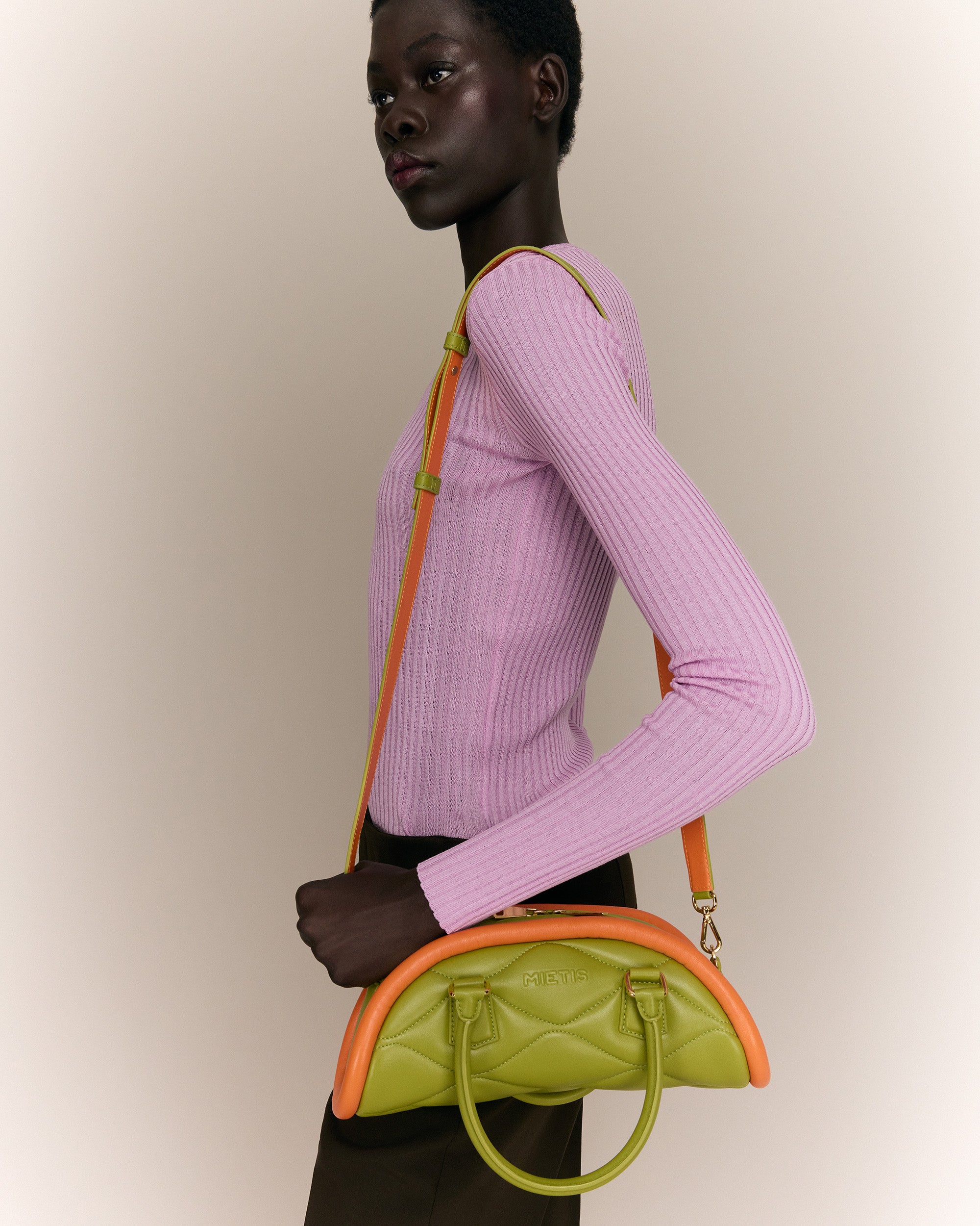 The Plutito Matcha reinterprets the classic bowling bag through MIETIS’ playful and distinctive lens. As our first soft bag, it stands out for its padded body, curved silhouette and bold contrast between fresh matcha green leather and vibrant orange piping.