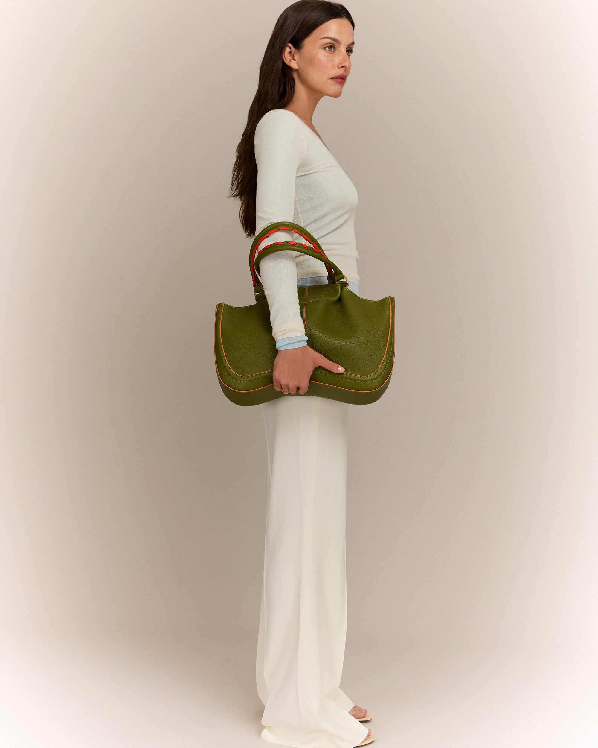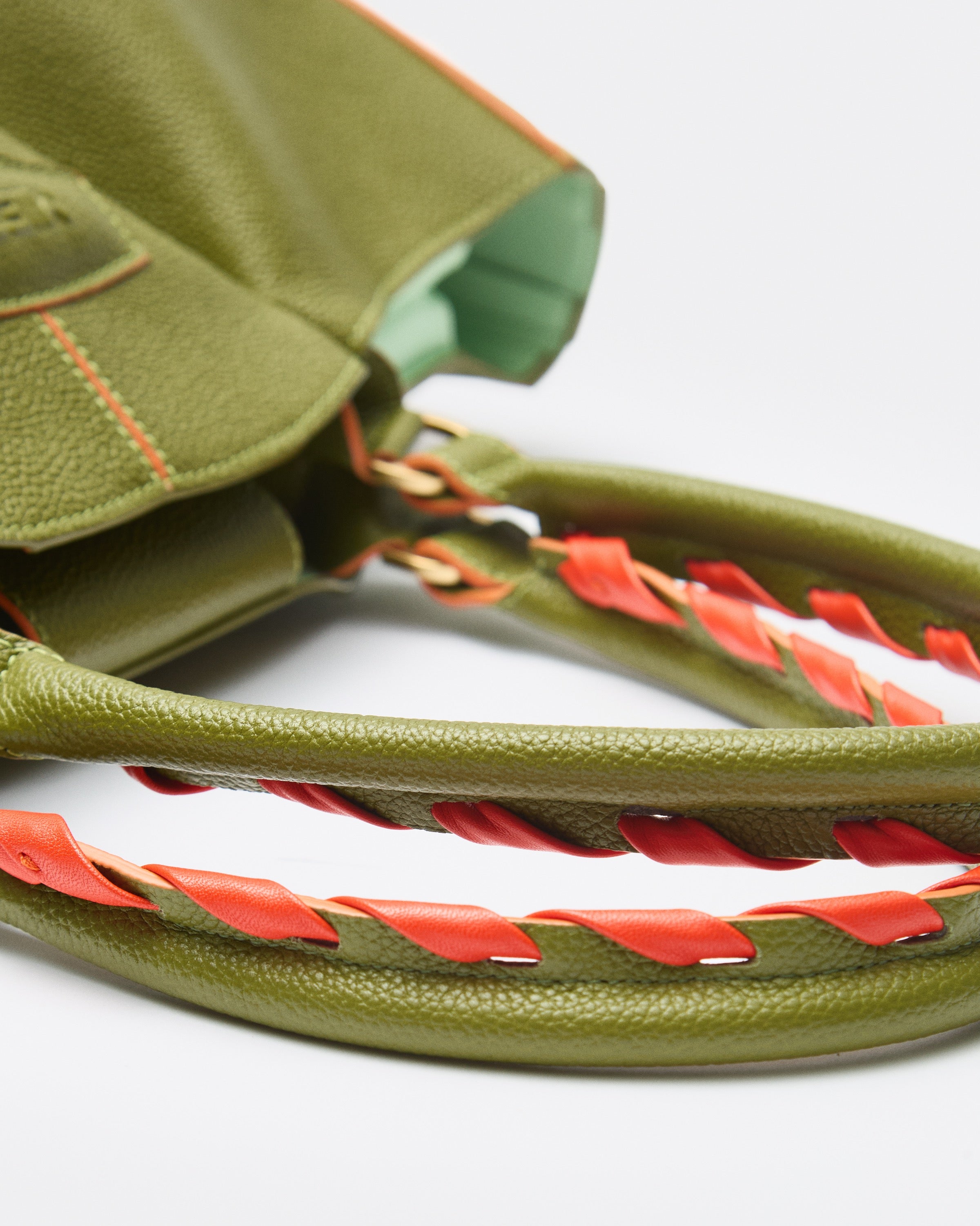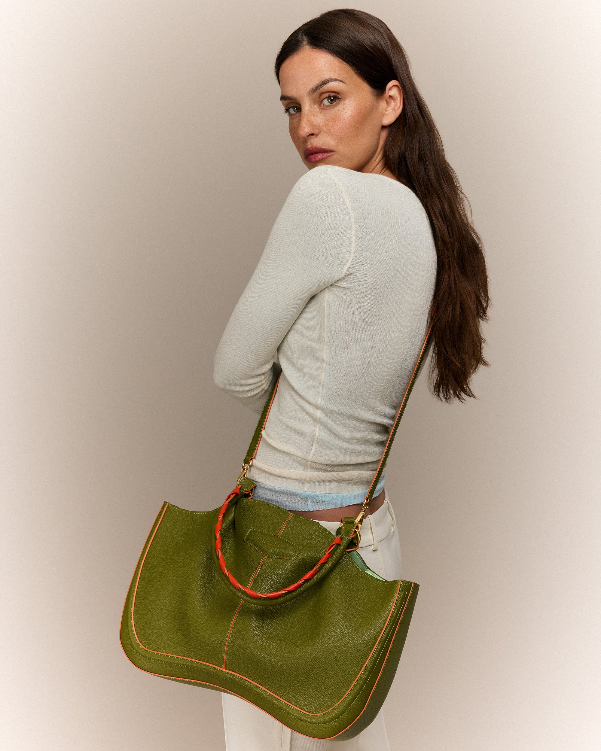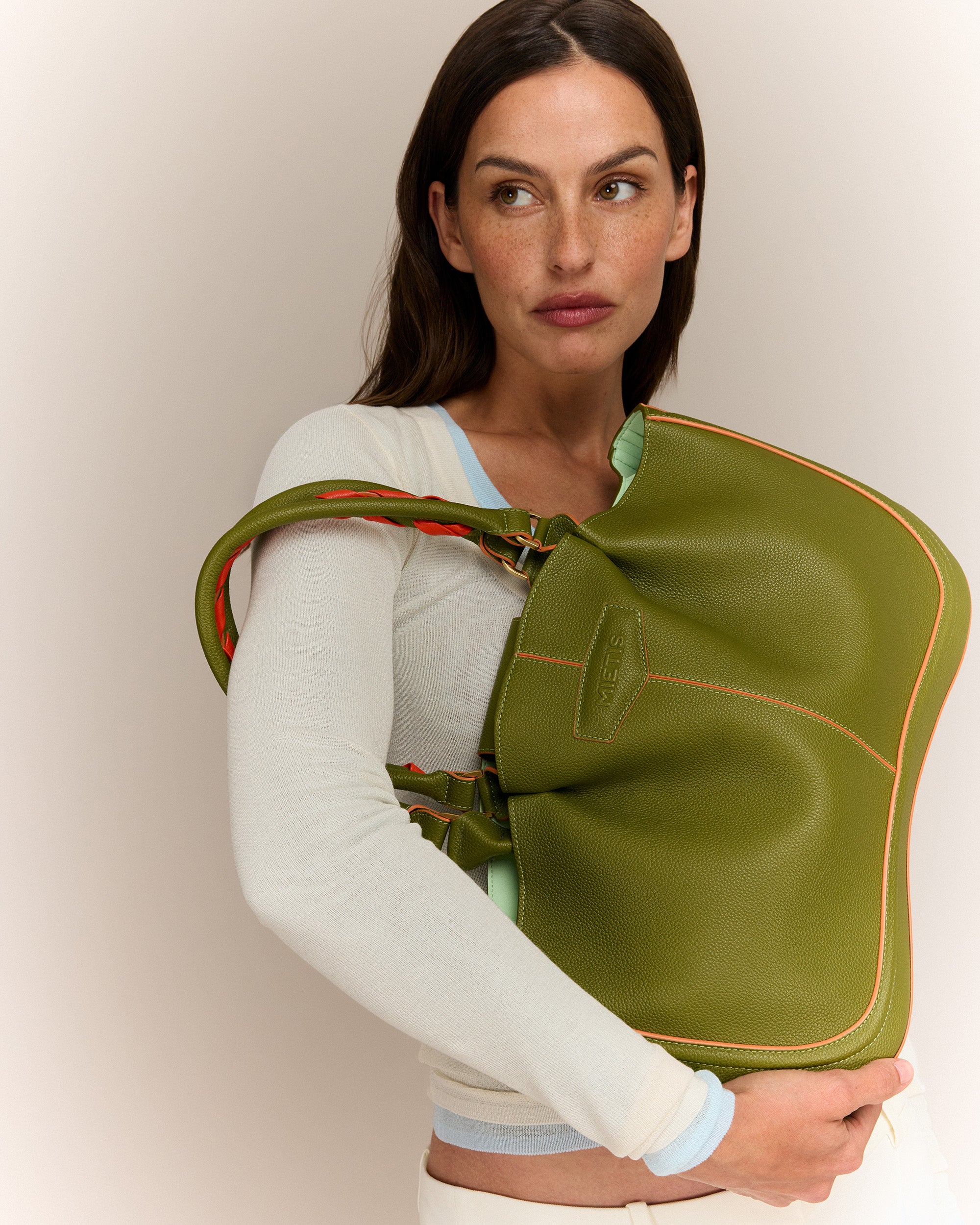 The Max Mid Matcha brings the sculptural presence of our Max Tote into a lighter, more compact format. Crafted in premium grained cow leather, it stands out for its fresh matcha green tone, contrasting orange edges and braided shoulder strap.