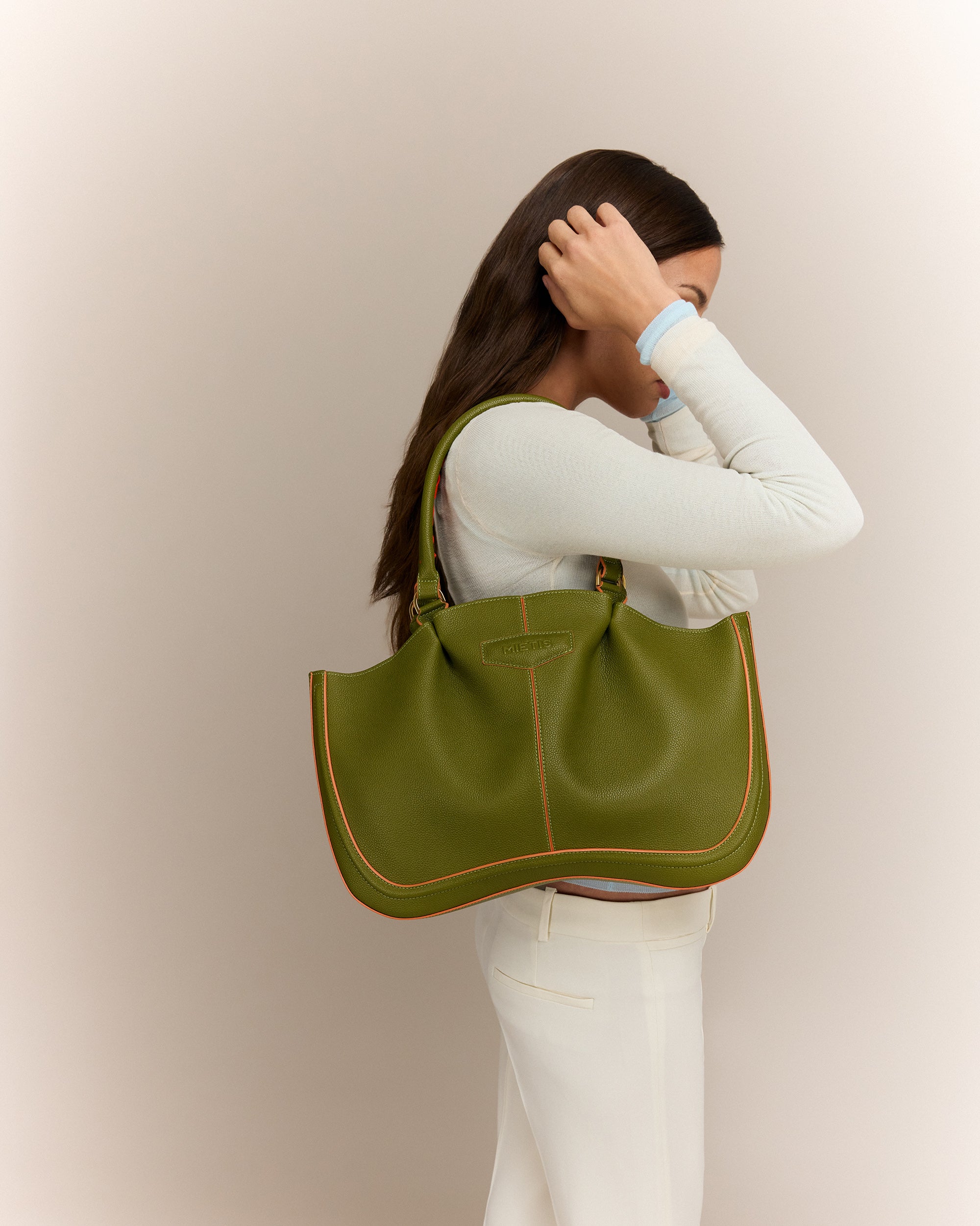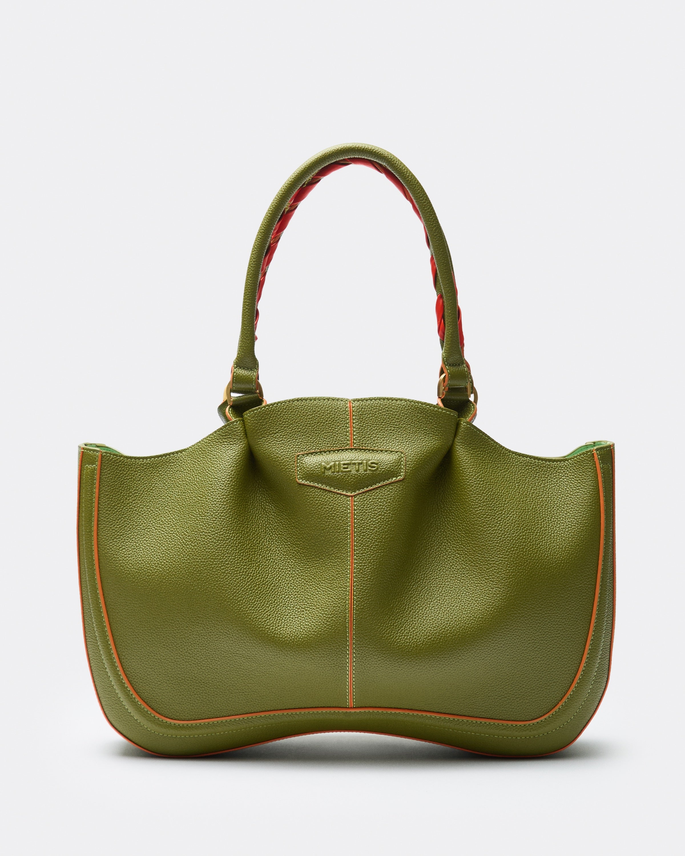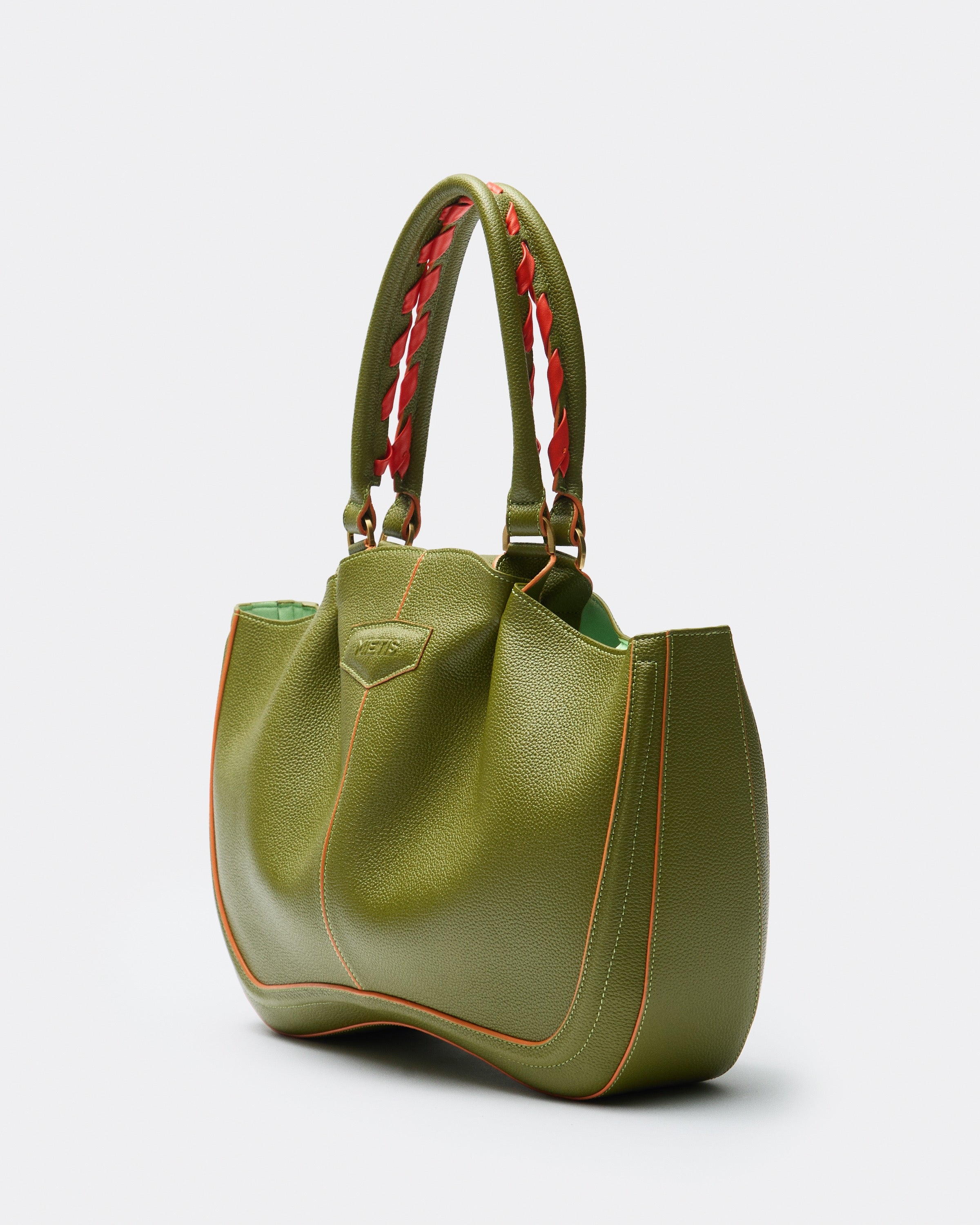 The Max Mid Matcha brings the sculptural presence of our Max Tote into a lighter, more compact format. Crafted in premium grained cow leather, it stands out for its fresh matcha green tone, contrasting orange edges and braided shoulder strap.