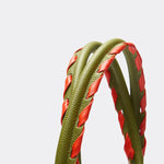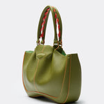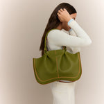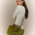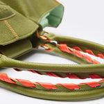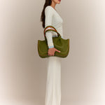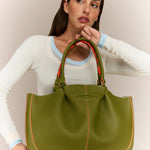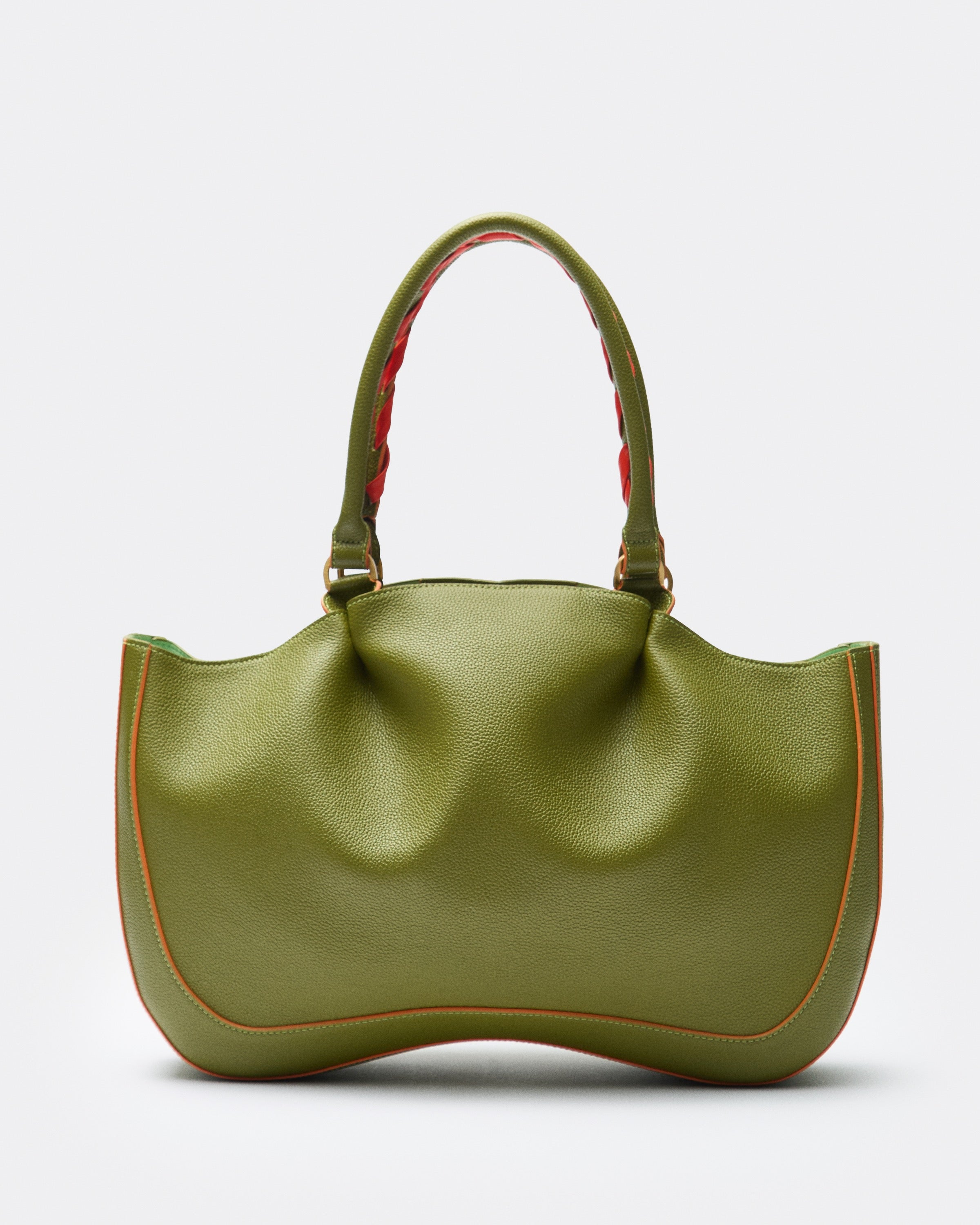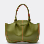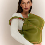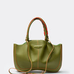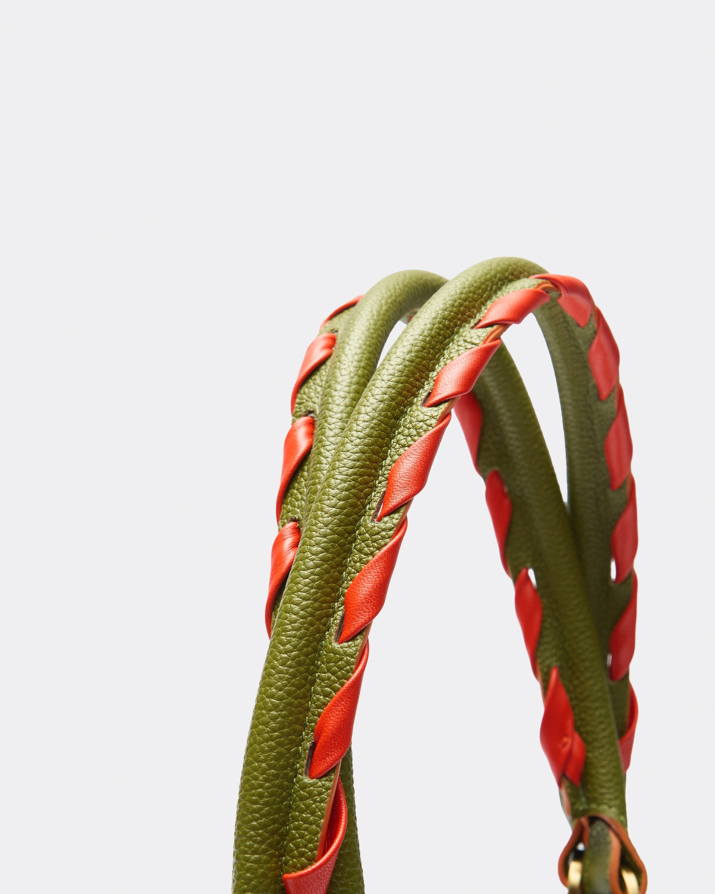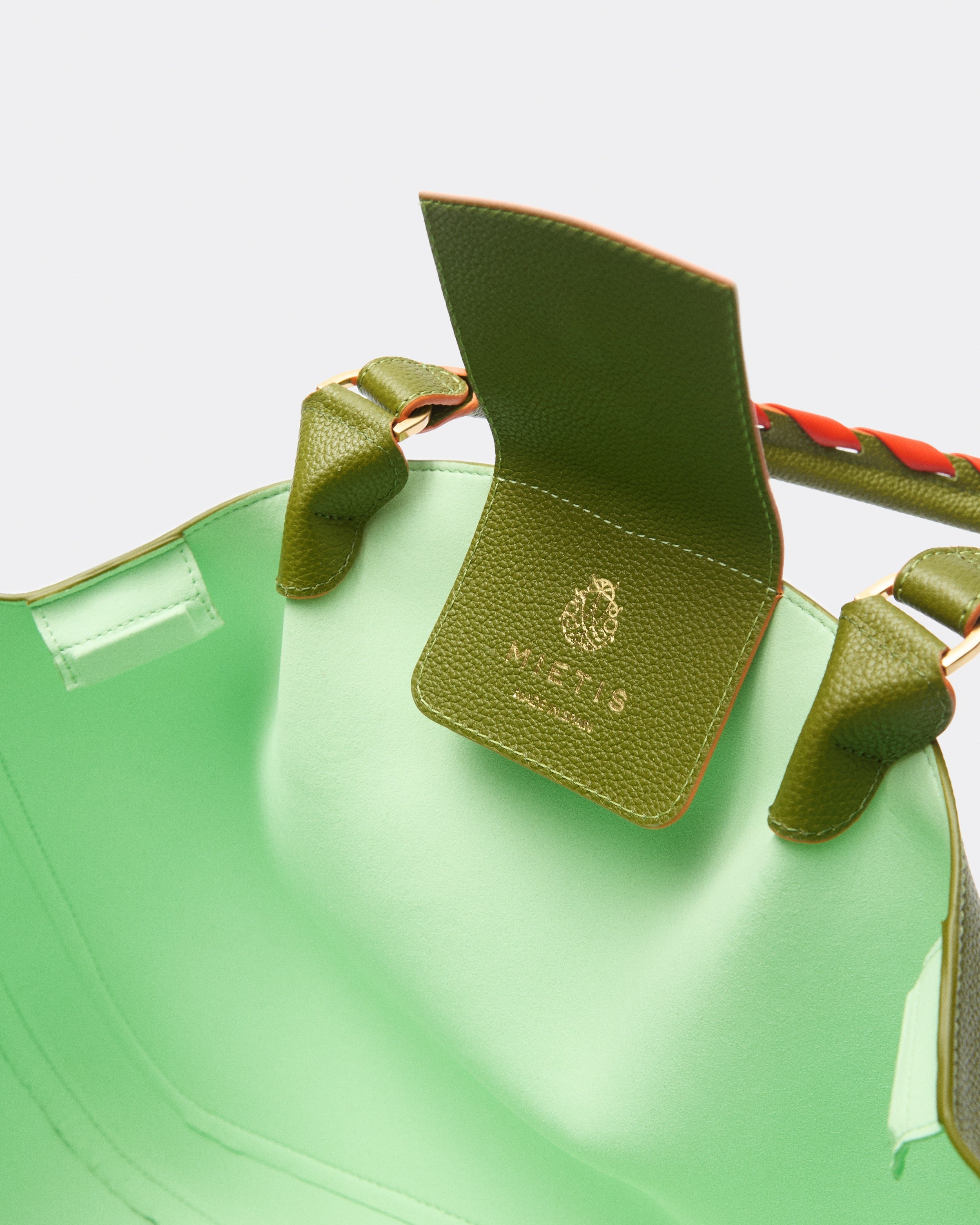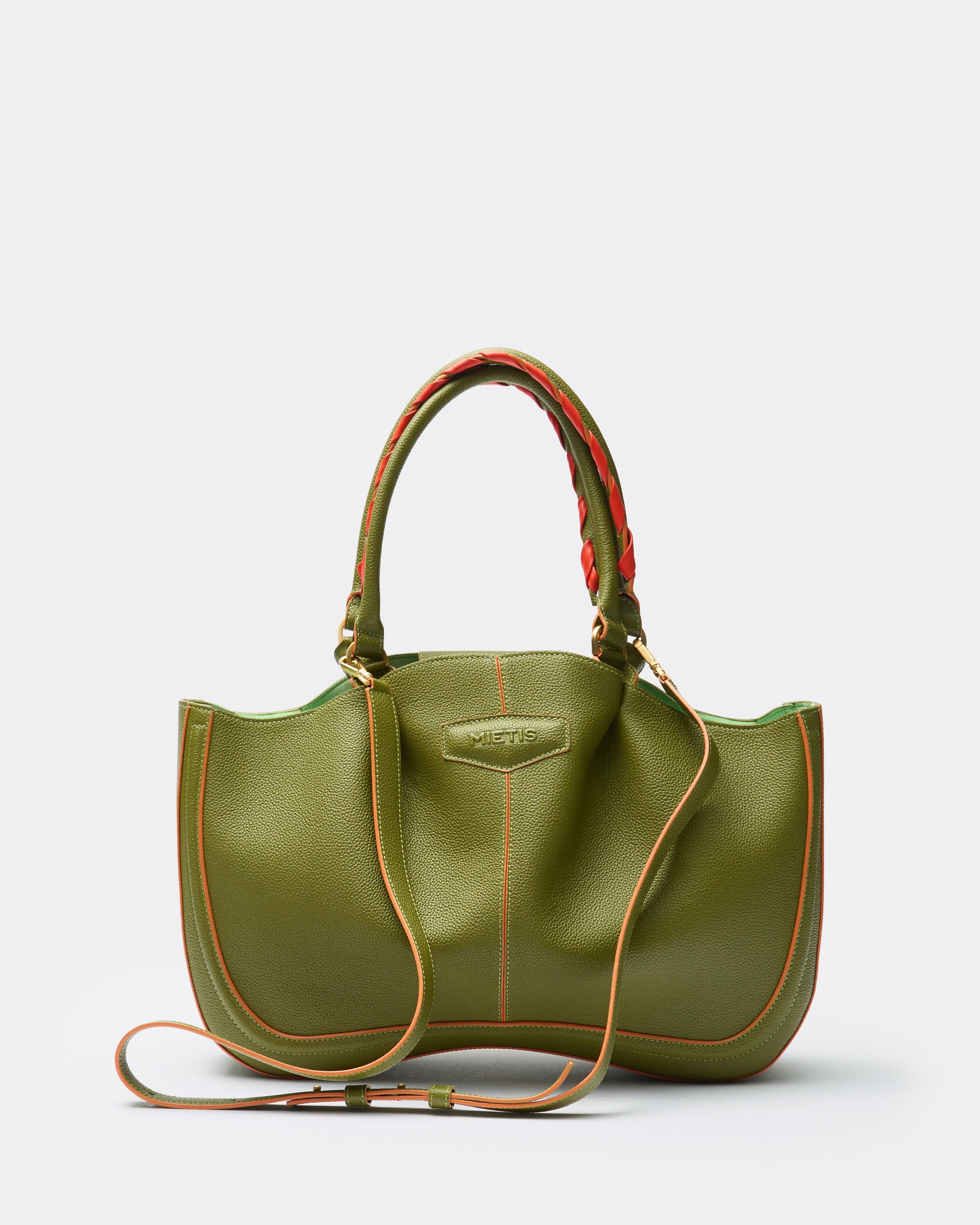 The Max Mid Matcha brings the sculptural presence of our Max Tote into a lighter, more compact format. Crafted in premium grained cow leather, it stands out for its fresh matcha green tone, contrasting orange edges and braided shoulder strap.