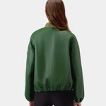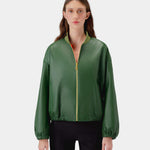 The Oversized Bomber is made from smooth calf leather and viscose lining. The piece features a gold metallic zipper front closure. The design of this garment includes a knitted Bomber collar, as well as gathers with elastic on the sleeves and hem for volume.