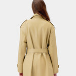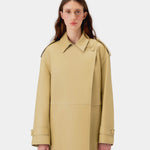 The Robinson Gabardine is crafted from smooth calf leather and viscose lining. The piece features a front closure with a single leather button and a belt that allows it to be cinched at the waist.