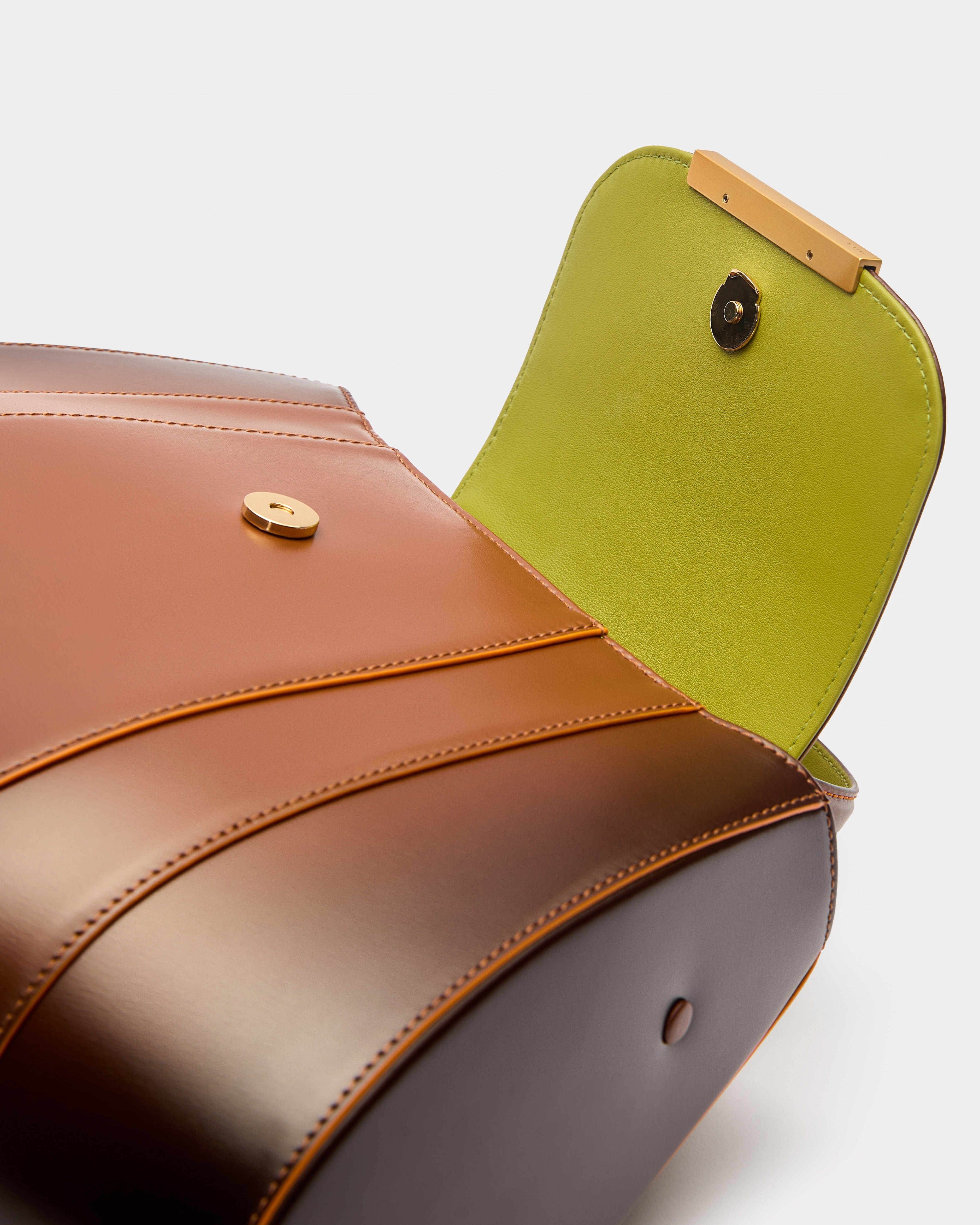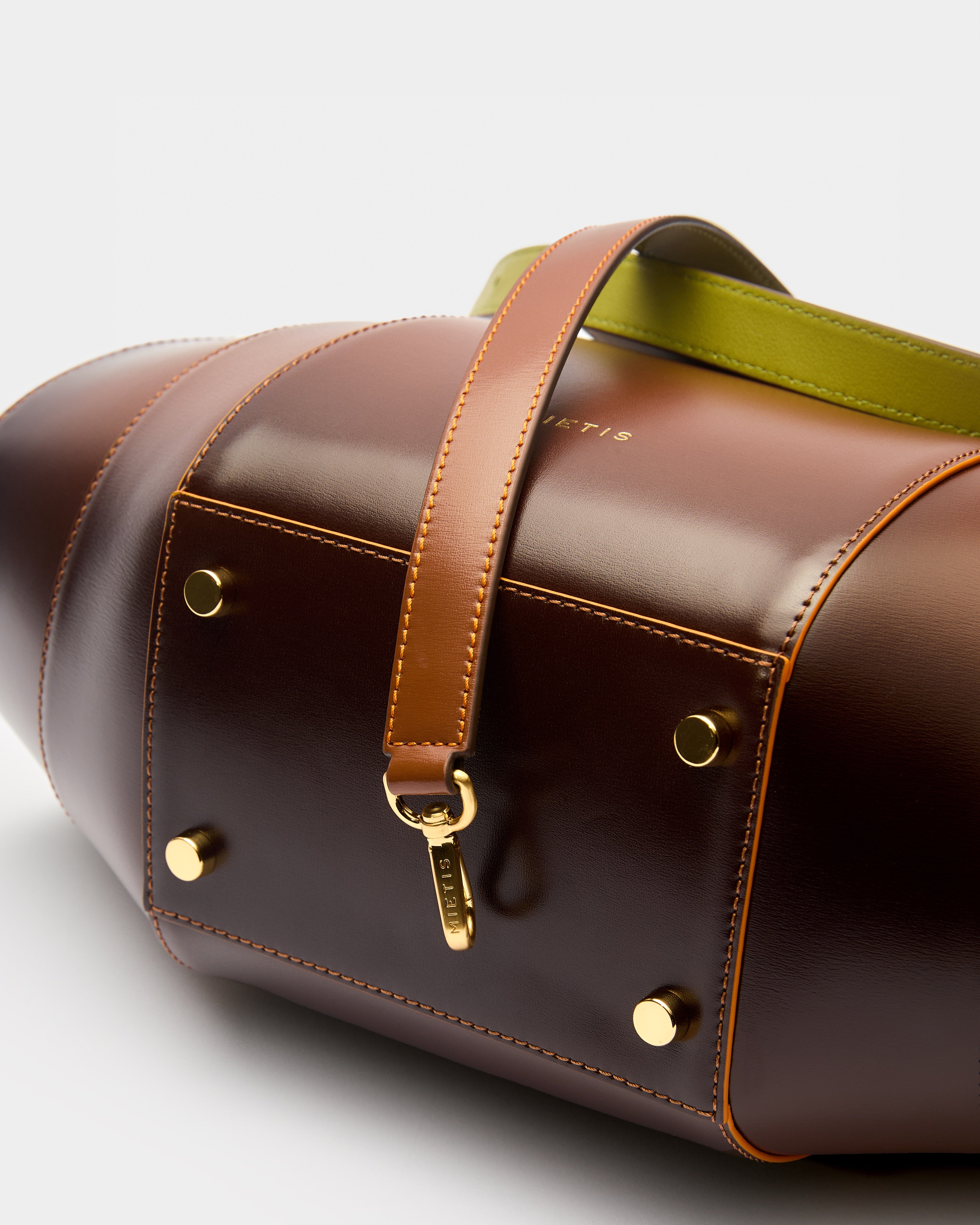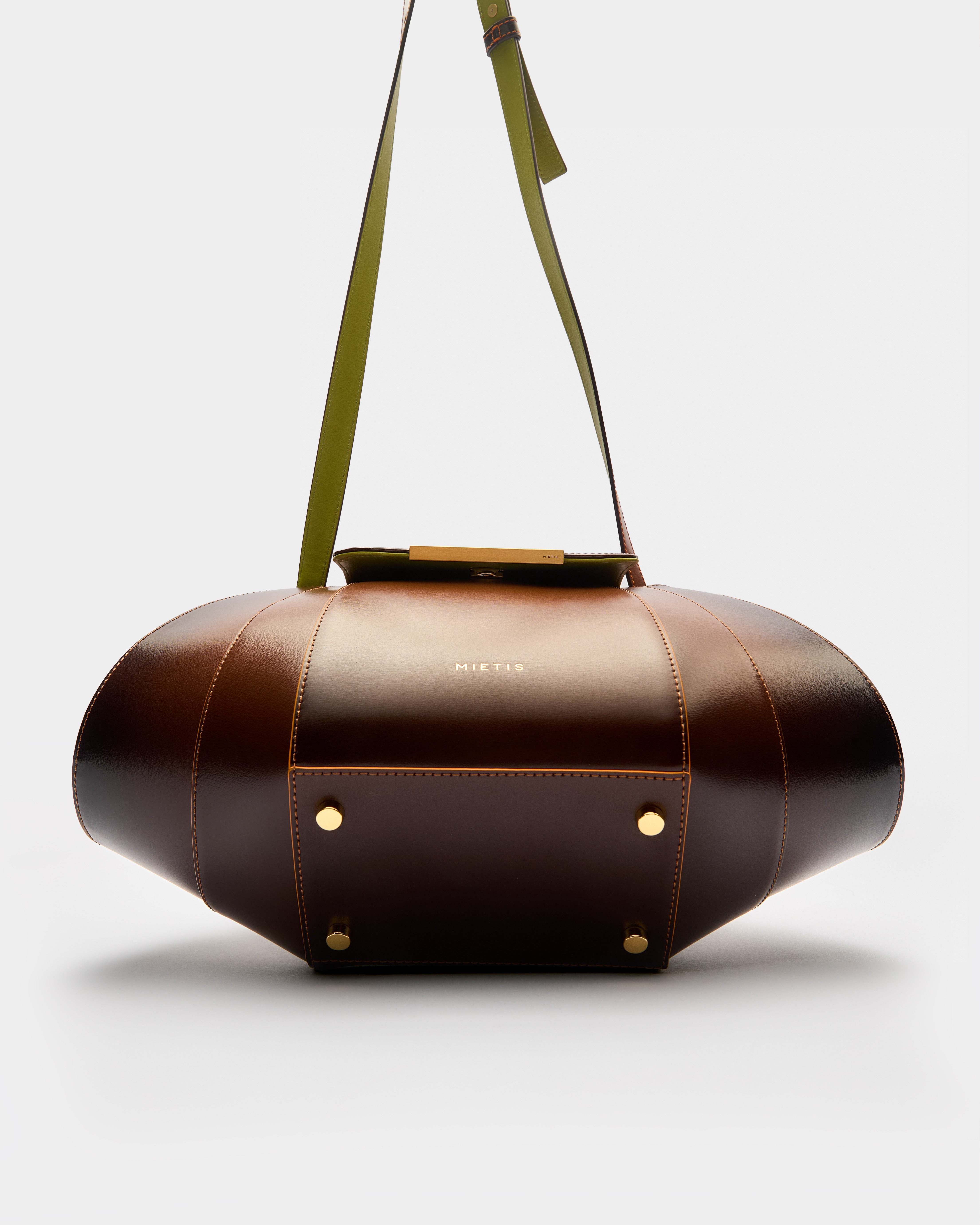 Finished with contrasting hand-painted edges and stitching, this piece captures attention while showcasing Mietis’ meticulous craftsmanship. The polished buckle and protective metallic feet add refined details, making it as durable as it is striking.