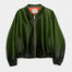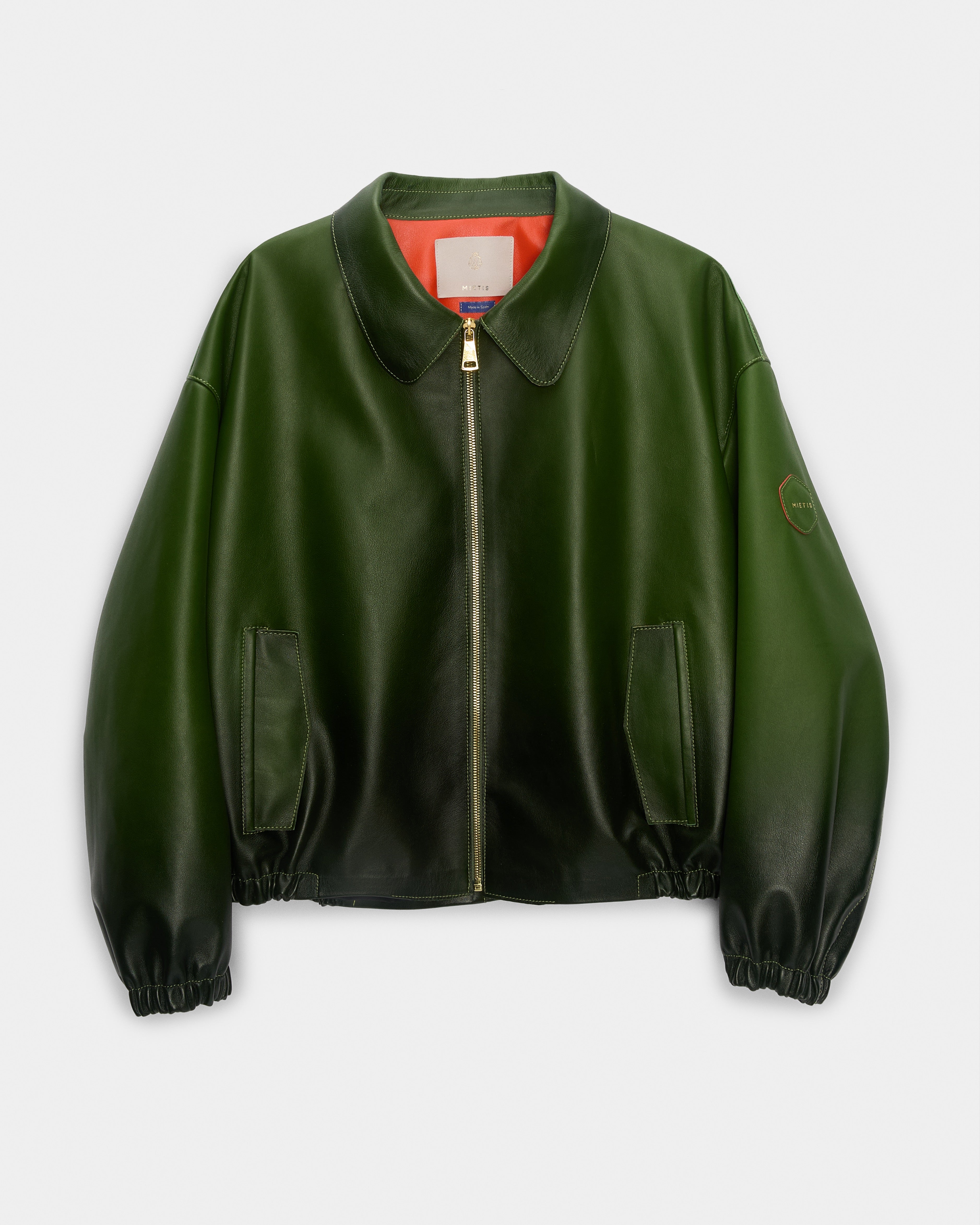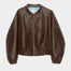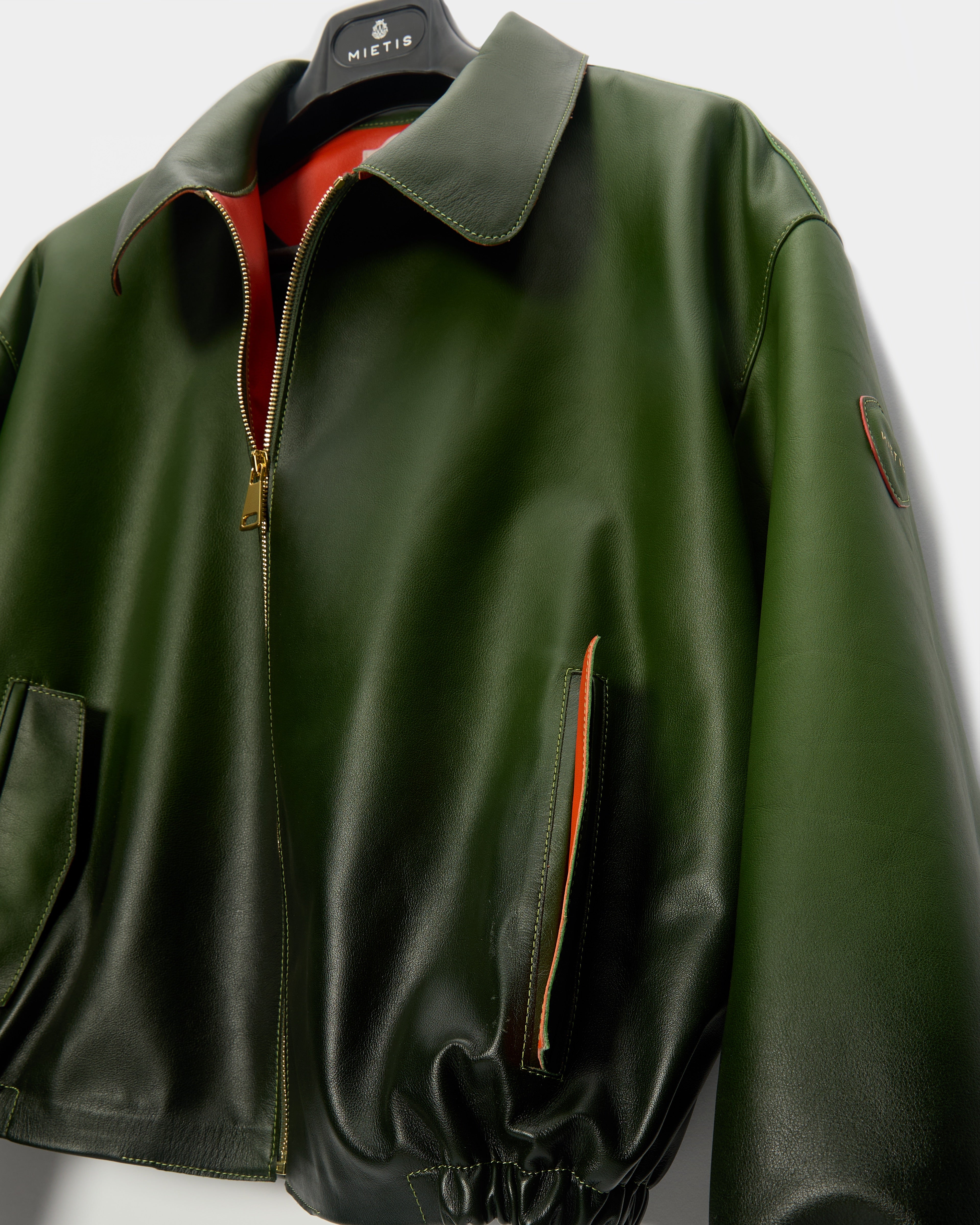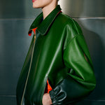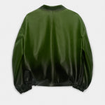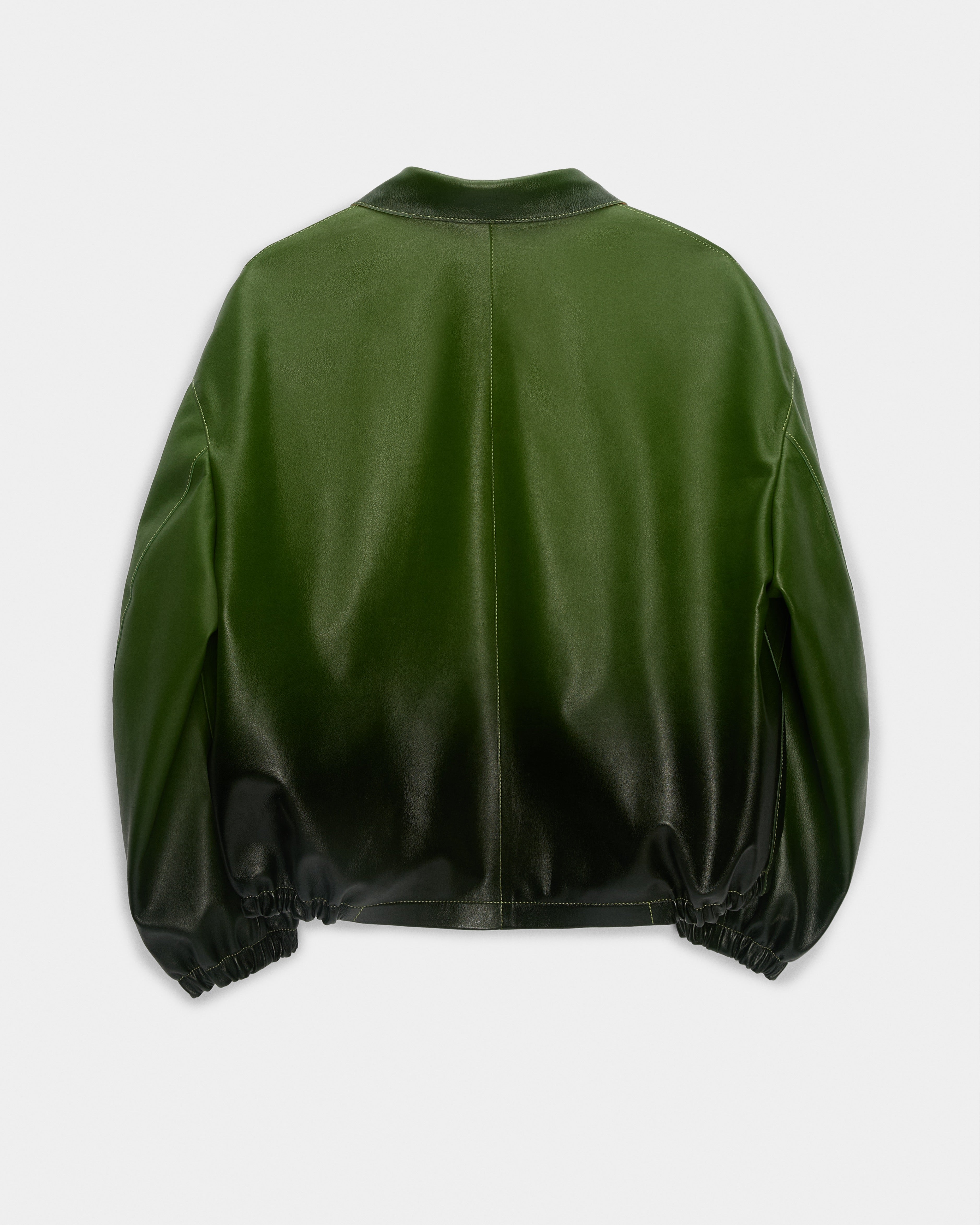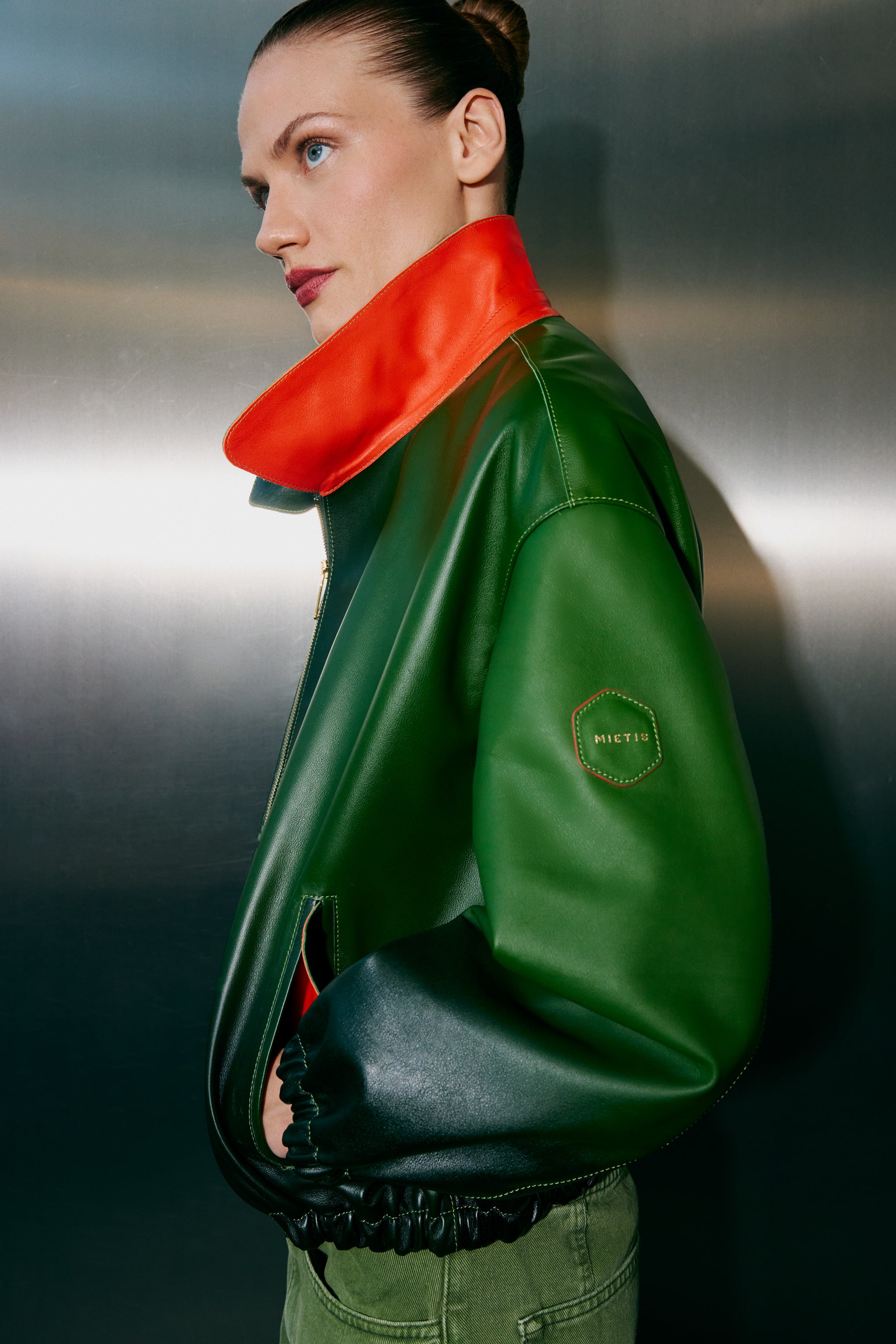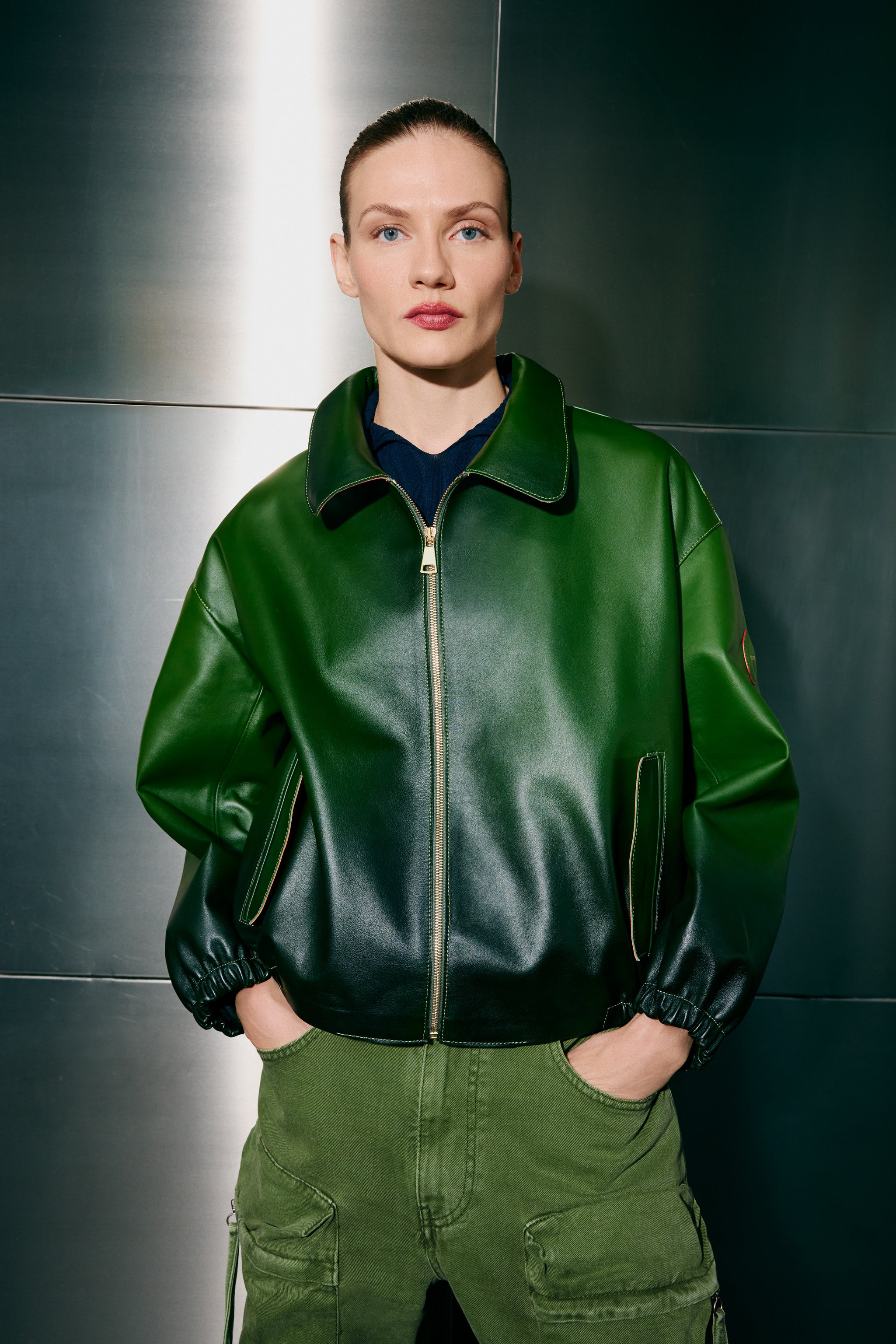 The Oversized Bomber is made from smooth calf leather and viscose lining. The piece features a gold metallic zipper front closure. The design of this garment includes a knitted Bomber collar, as well as gathers with elastic on the sleeves and hem for volume.