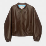 The Oversized Bomber is made from smooth calf leather and viscose lining. The piece features a gold metallic zipper front closure. The design of this garment includes a knitted Bomber collar, as well as gathers with elastic on the sleeves and hem for volume.
