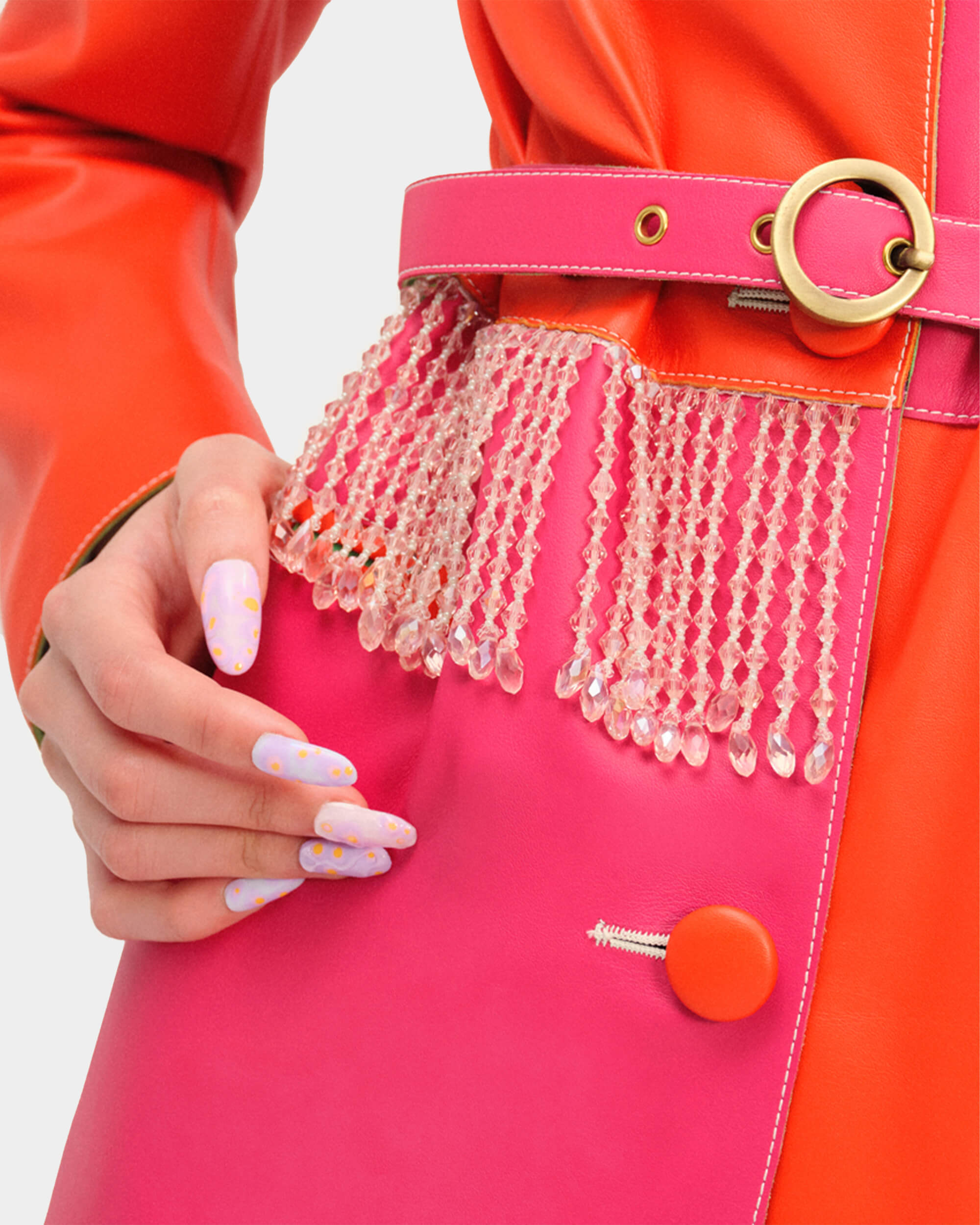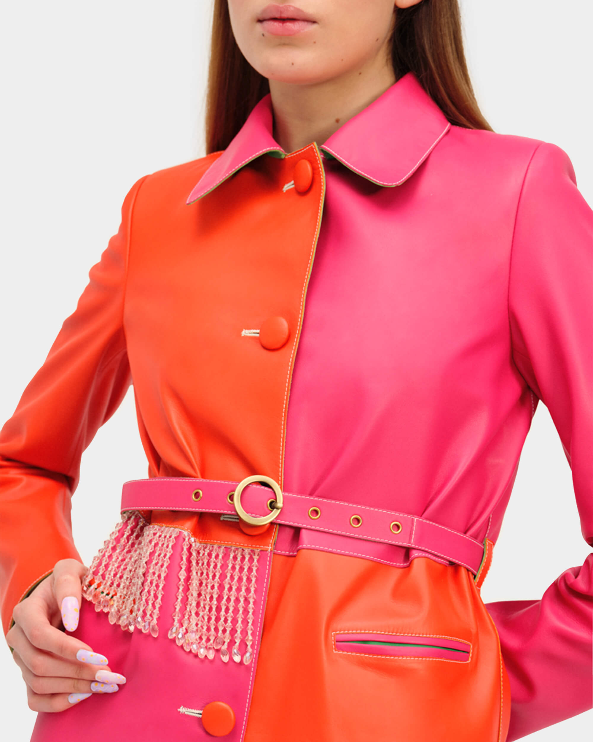 The Dama Trench is crafted from smooth calf leather and viscose lining. The piece features a front closure with leather buttons and a bi-colored puritan collar.