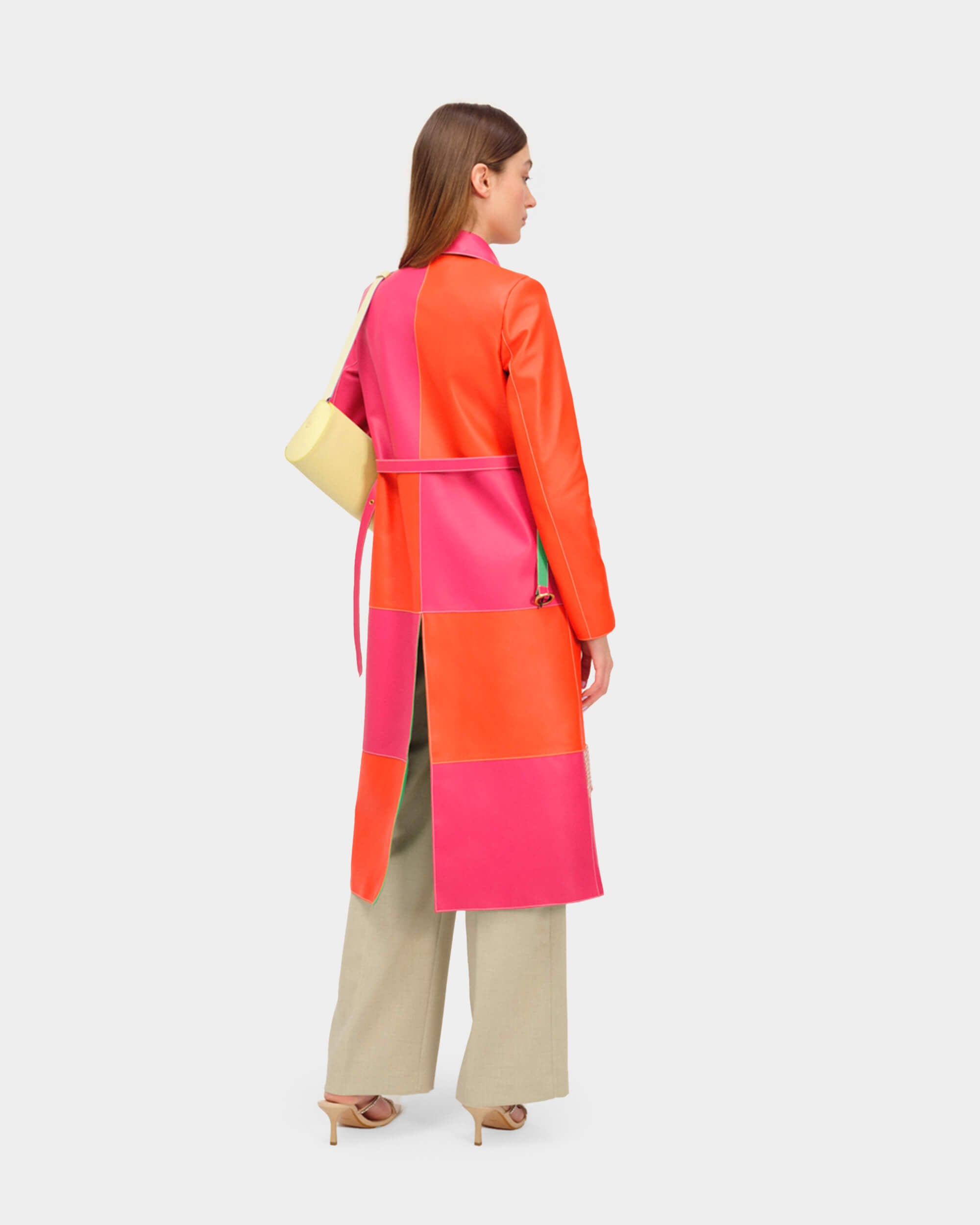 The refined material is showcased in pastel colors and meticulous stitching. The straight cut is modern and elegant.