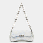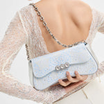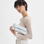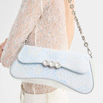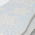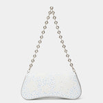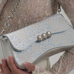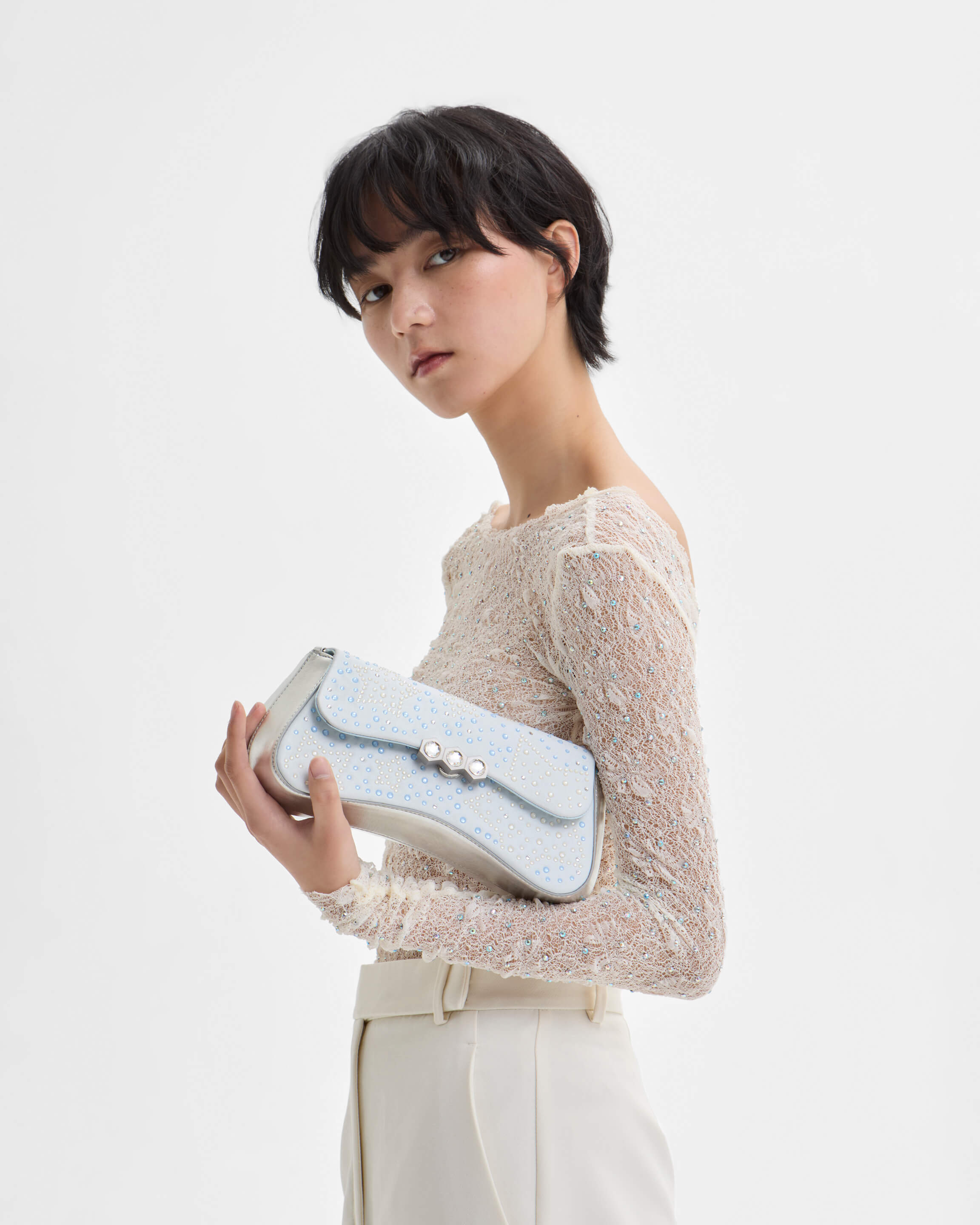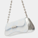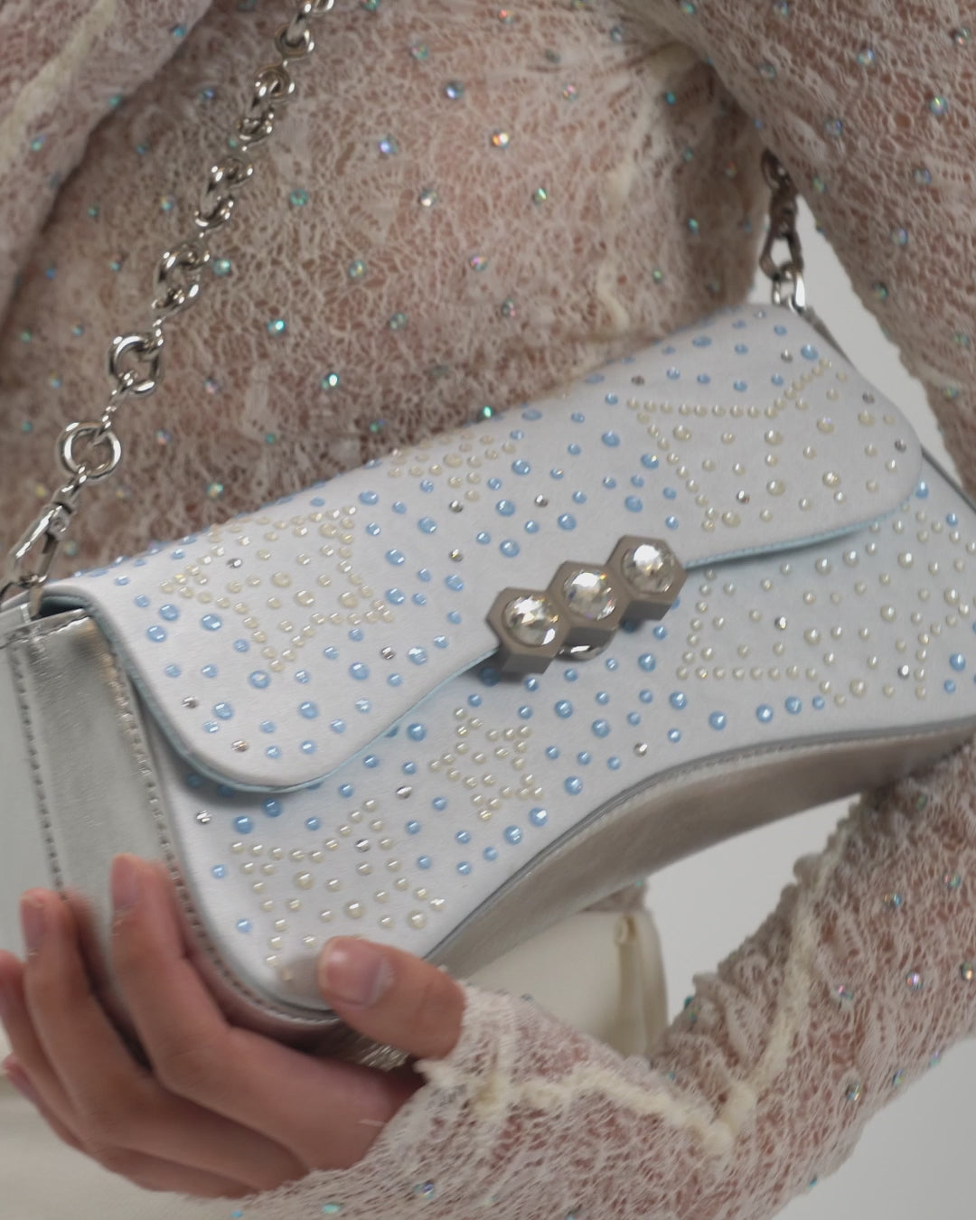 Embellished with Swarovski Crystals and a silver chain, this limited edition version is perfect for evening and night occasions. The striking blend of white and blue pearls form a star, adding an iconic touch to the design.