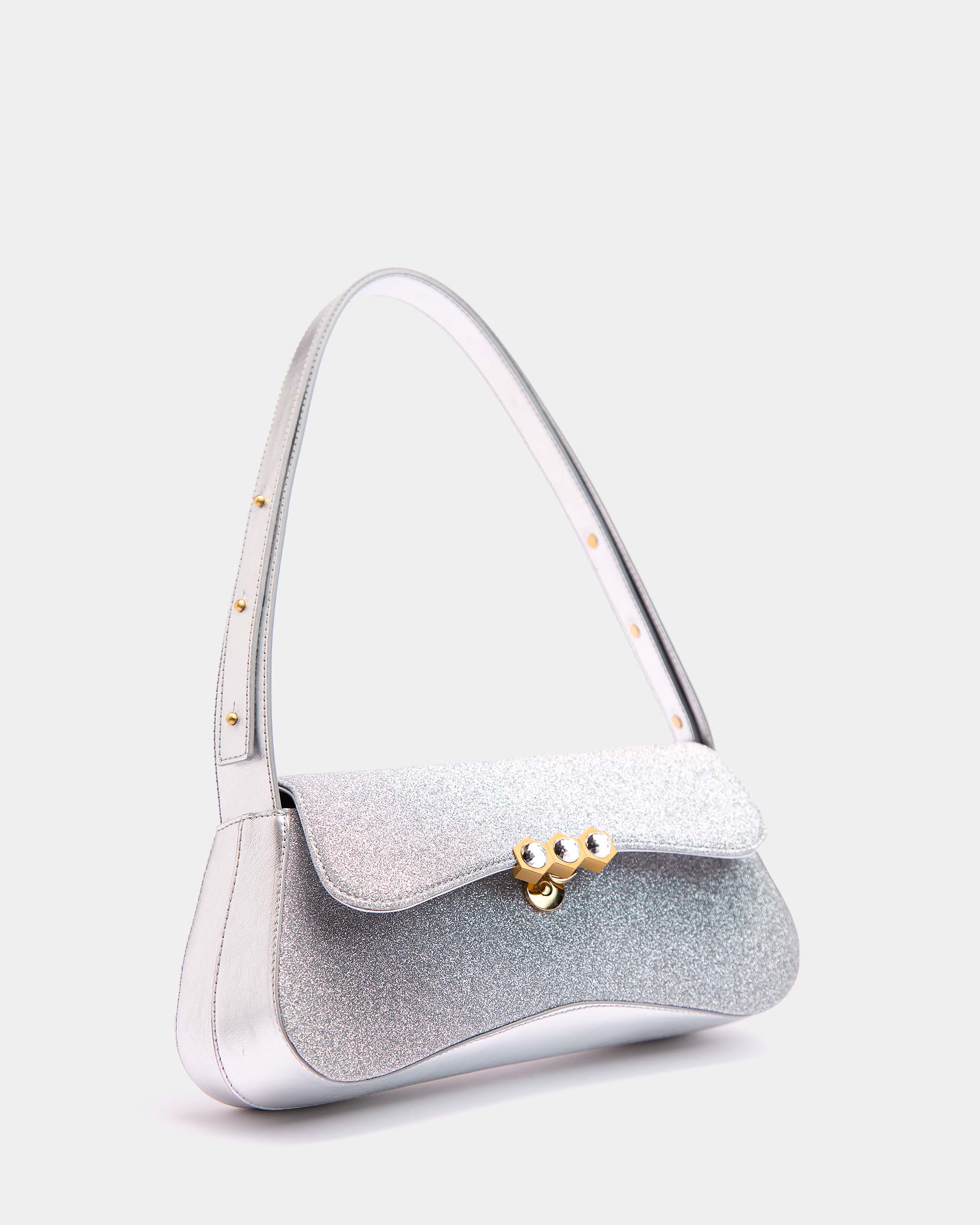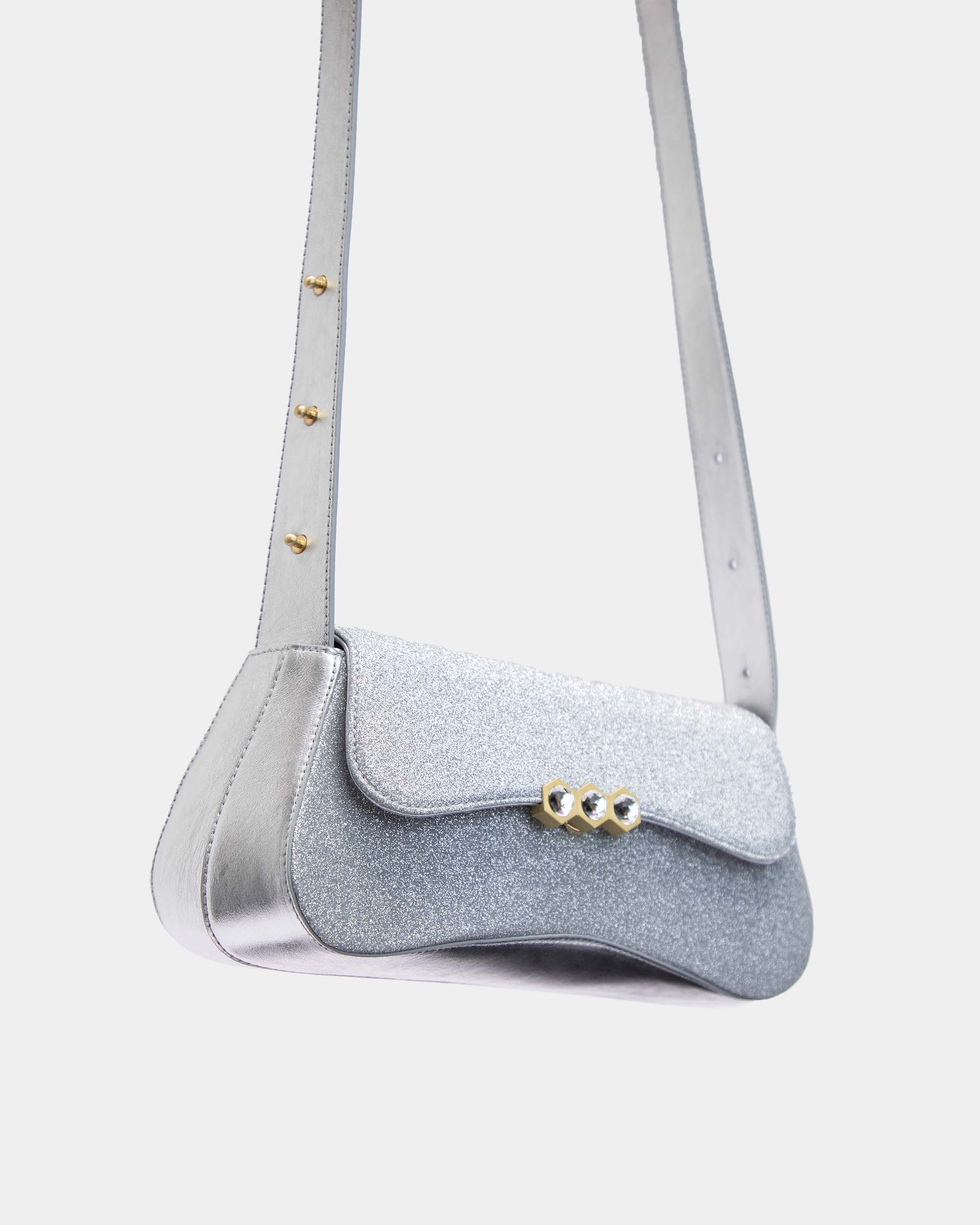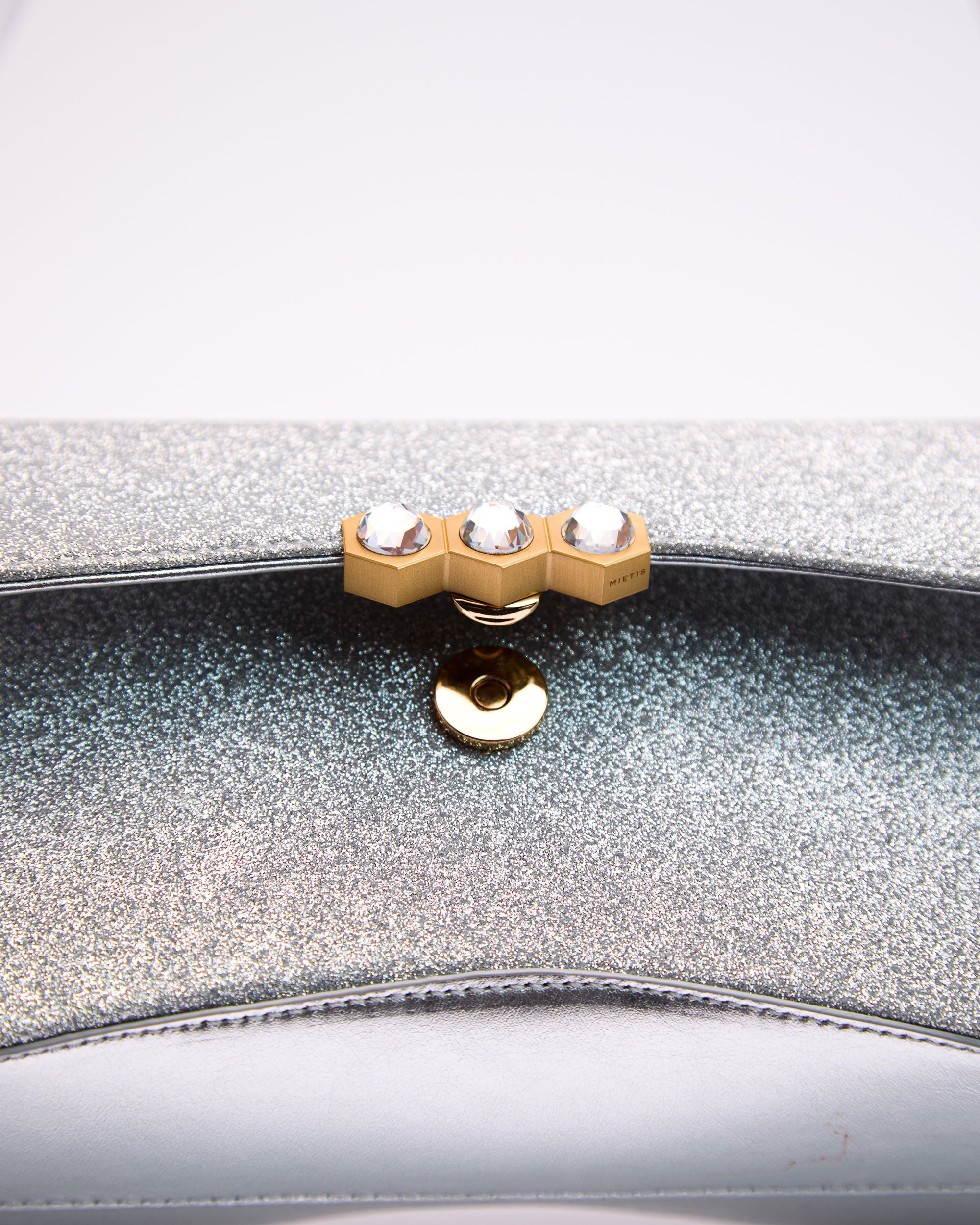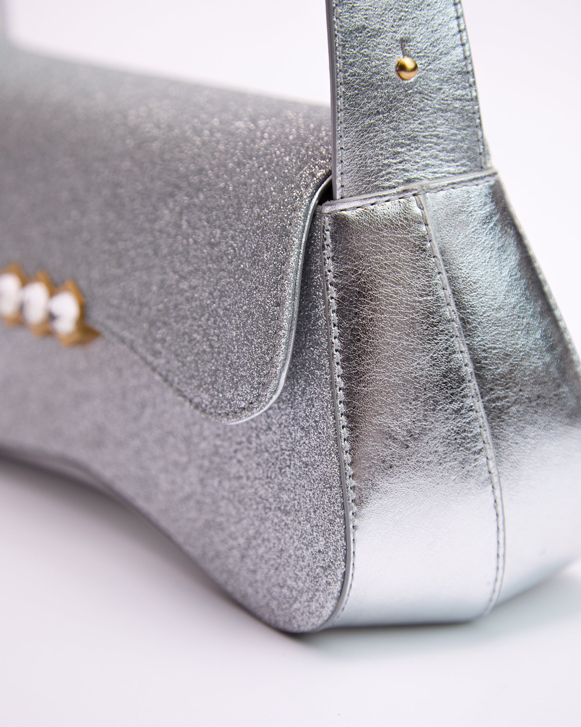 With a bold and luminous twist, Mietis reintroduces the iconic Culita Baguette in a dazzling silver finish. A shimmering blend of smooth silver leather and glittery textures, designed for those who steal the spotlight — without even trying.