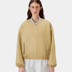 The Oversized Bomber is made from smooth calf leather and viscose lining. The piece features a gold metallic zipper front closure. The design of this garment includes a knitted Bomber collar, as well as gathers with elastic on the sleeves and hem for volume.