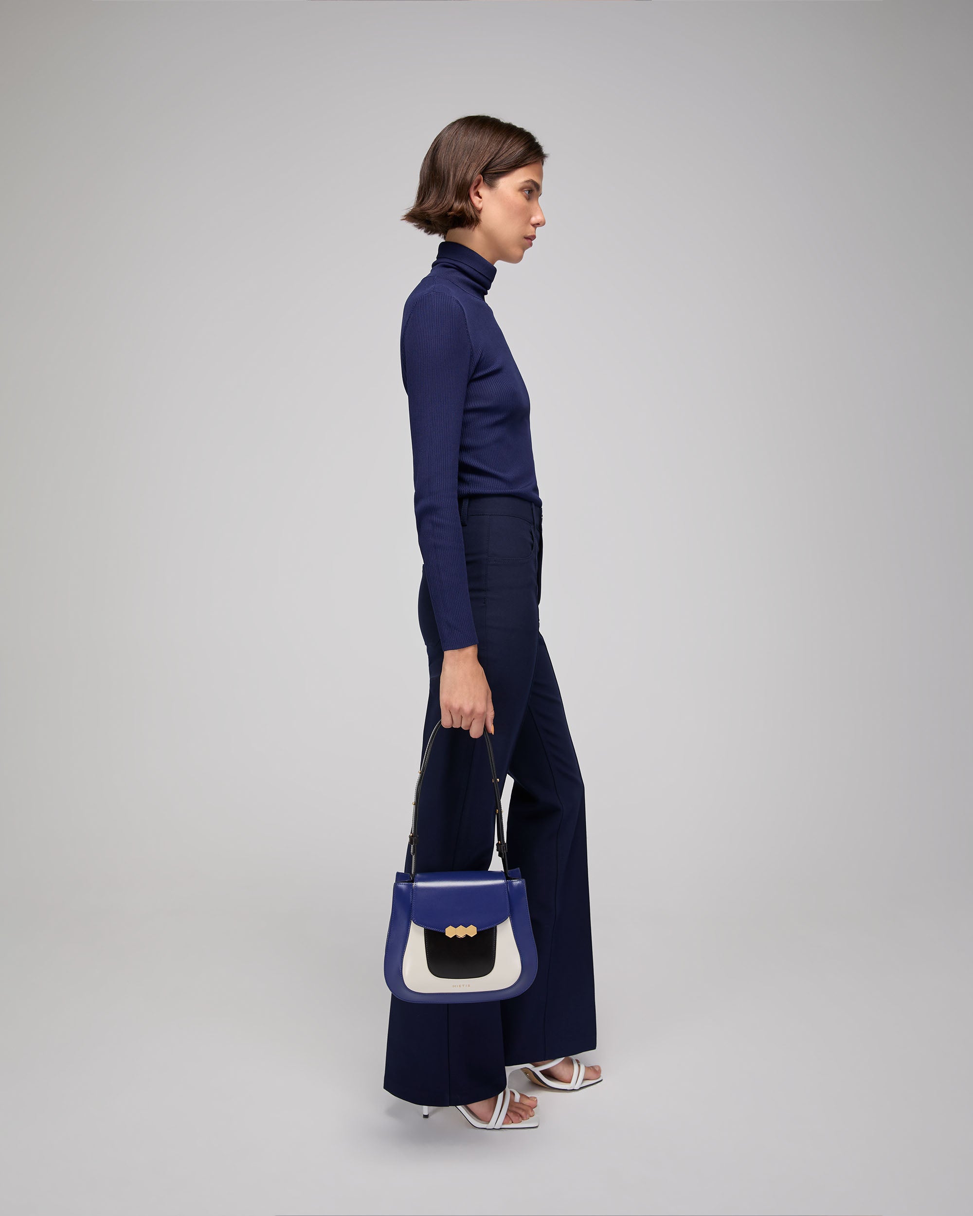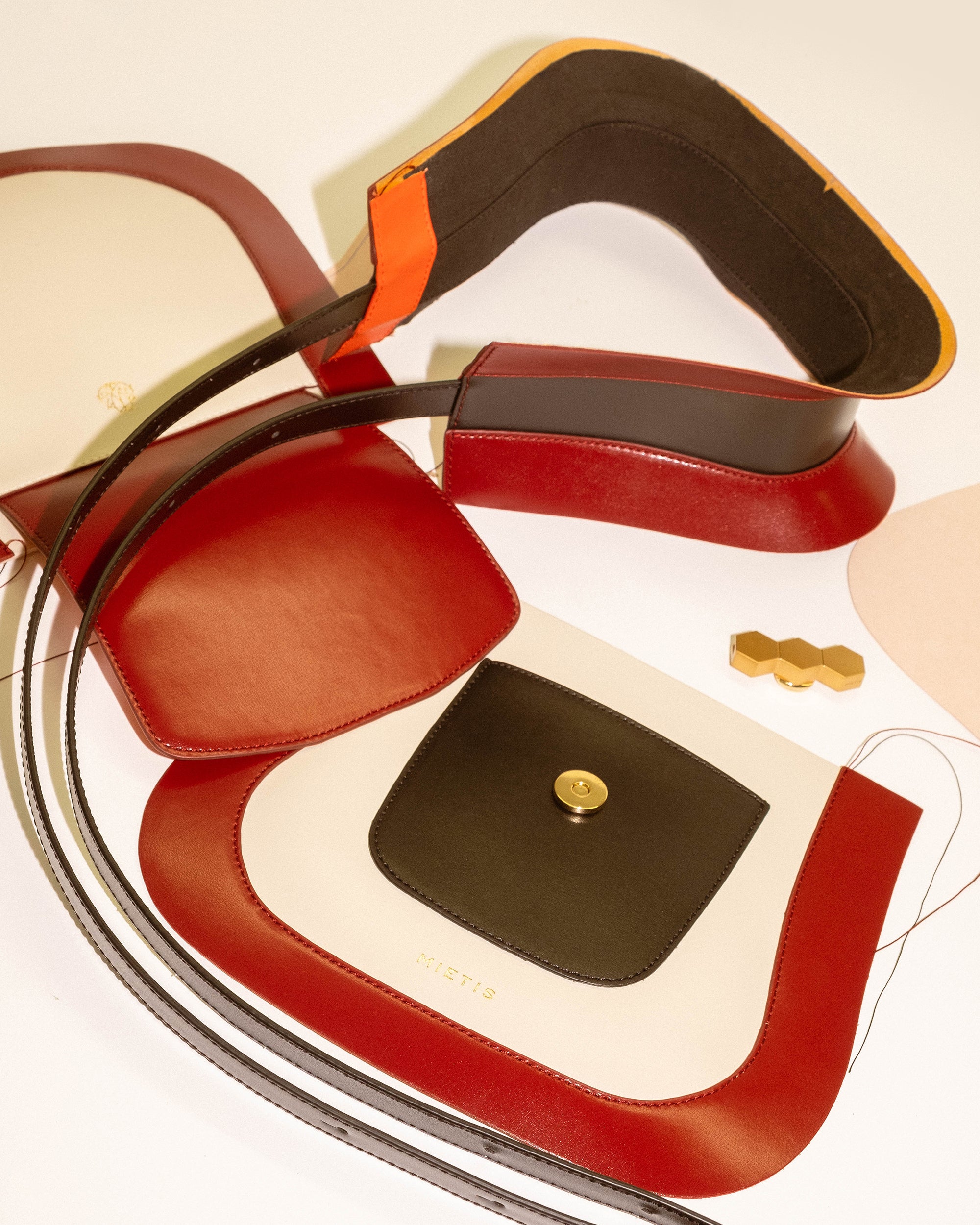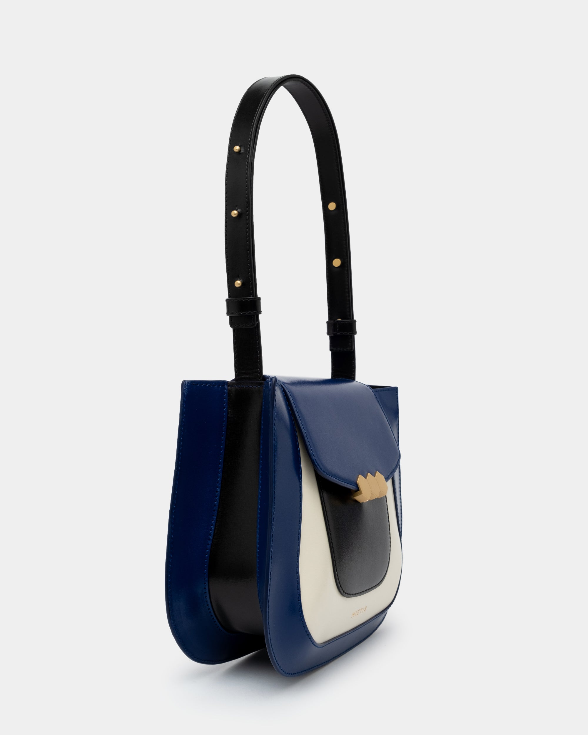 The Jill bag, inspired by the 70s, is a structured bag with a stiffer and shinier cowhide leather, applying the contemporary touch of Mietis with the detail of the hand-painted edges and contrasting stitching. The Jill bag is finished with a custom metallic closure: the three hexagons, which symbolize harmony and balance.