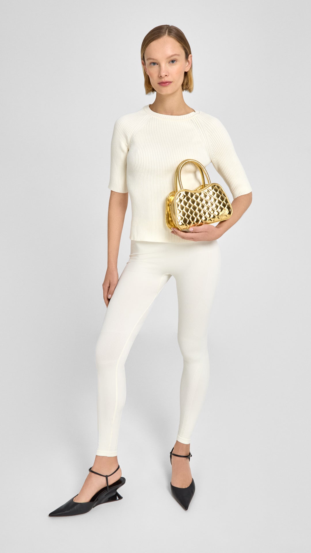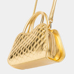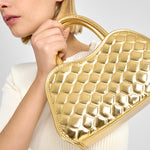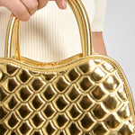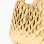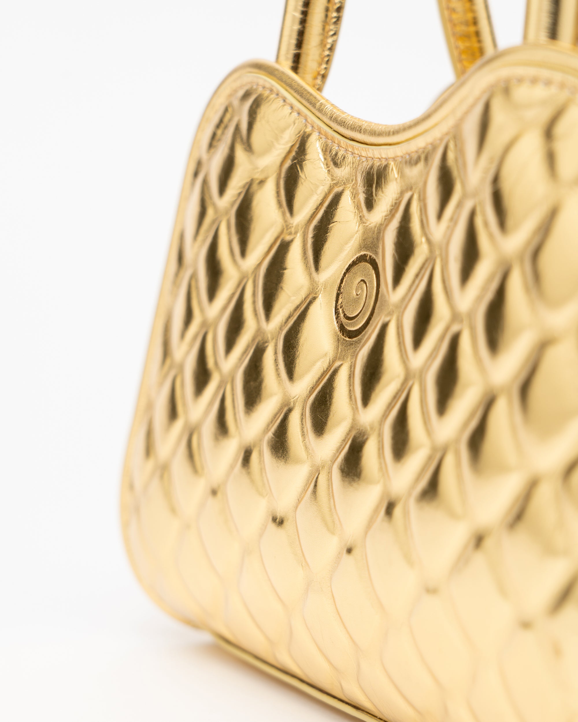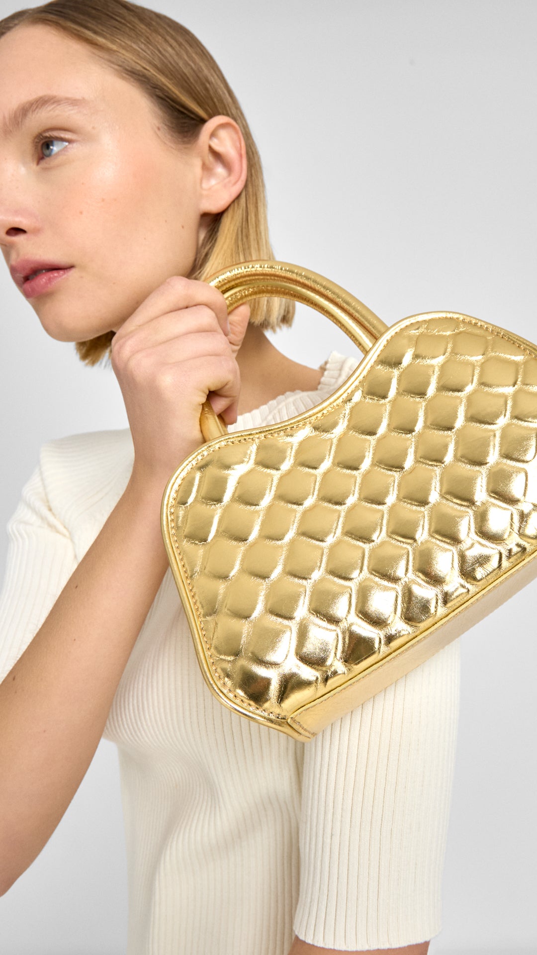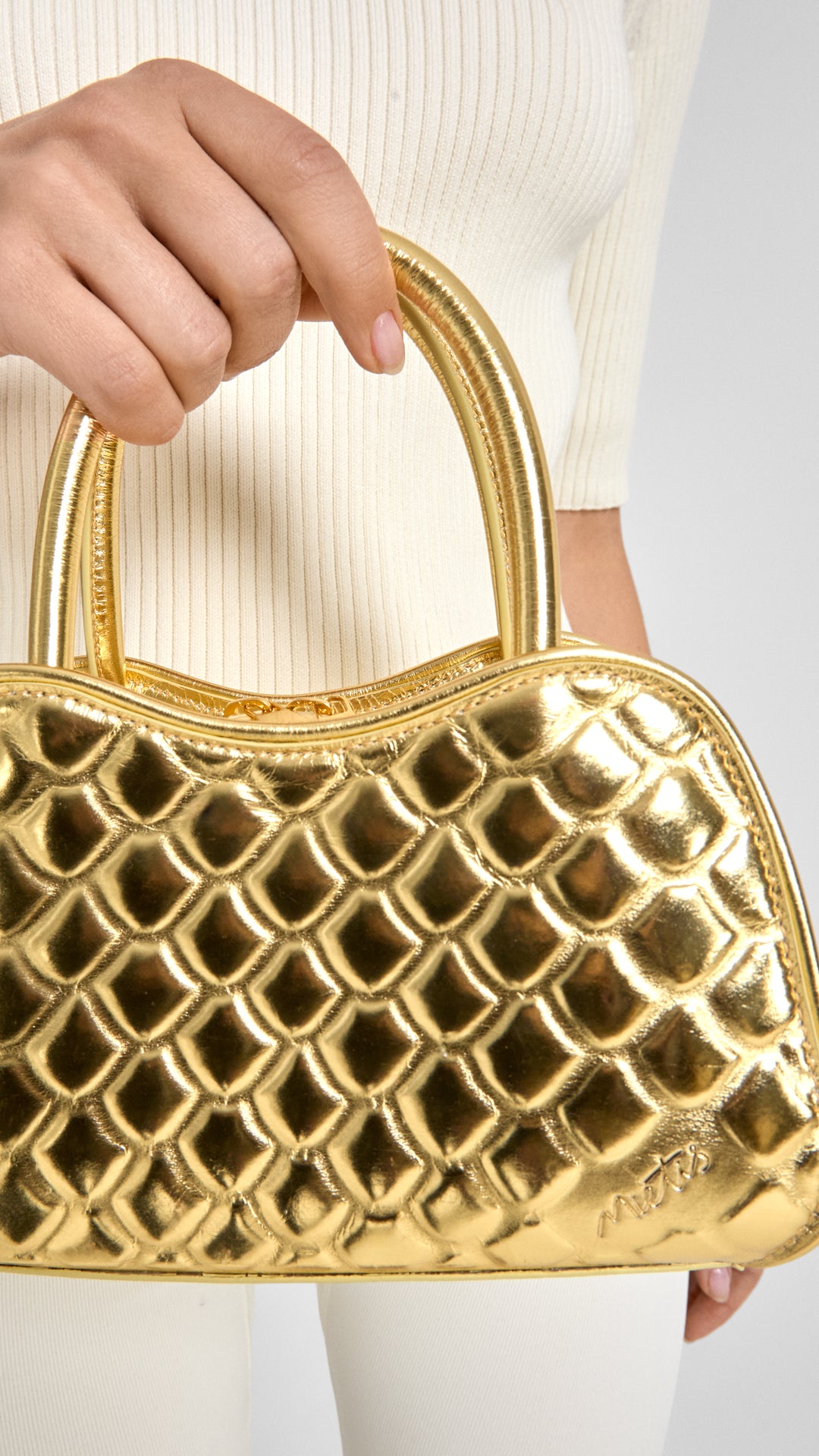 The padded leather details at the bottom echo the essence of the original design, bringing a playful yet refined texture that combines the volumes of artisanal craftsmanship with modern sophistication. The seamless blend of bold geometry and shimmering gold makes this bag a statement of timeless elegance.