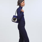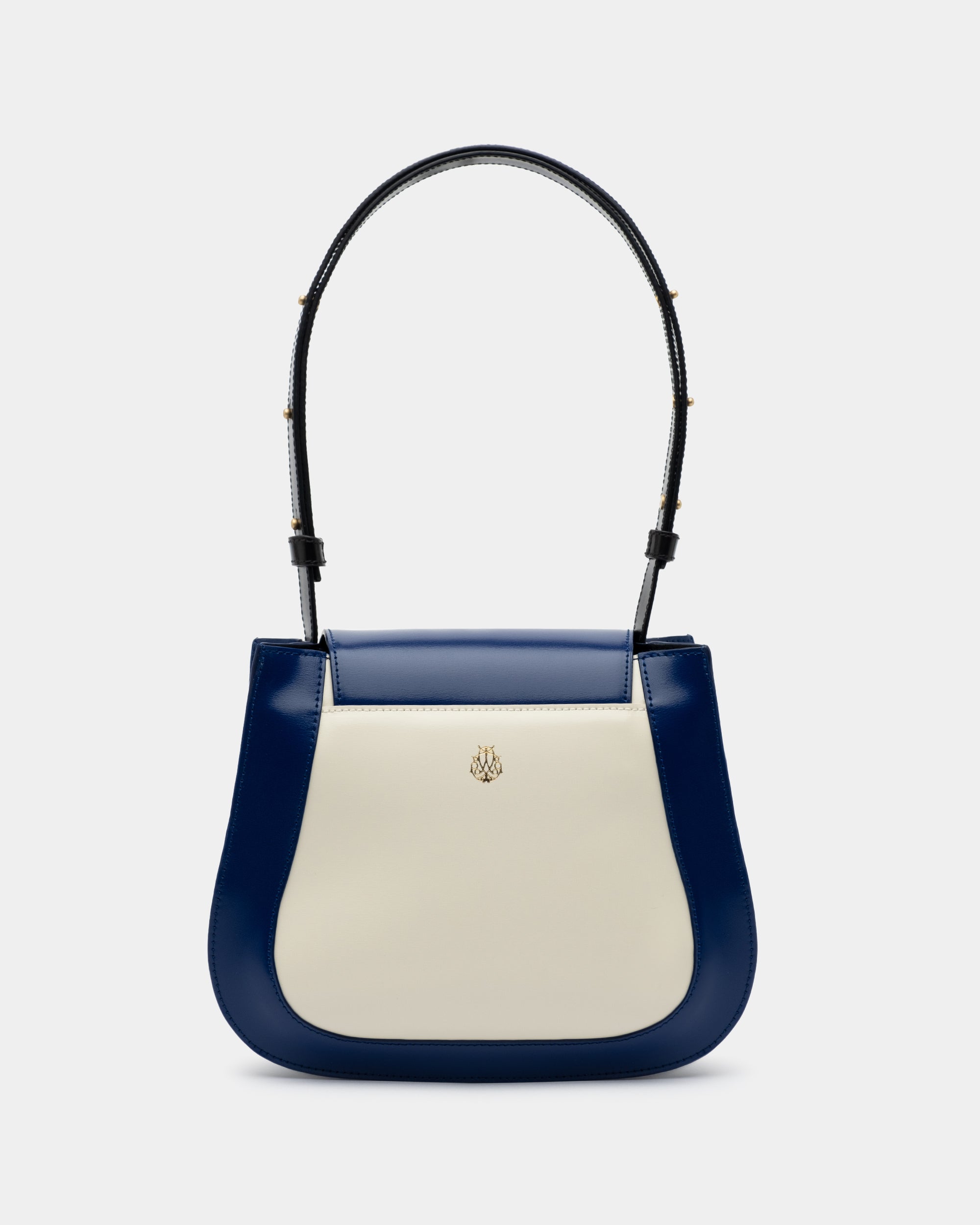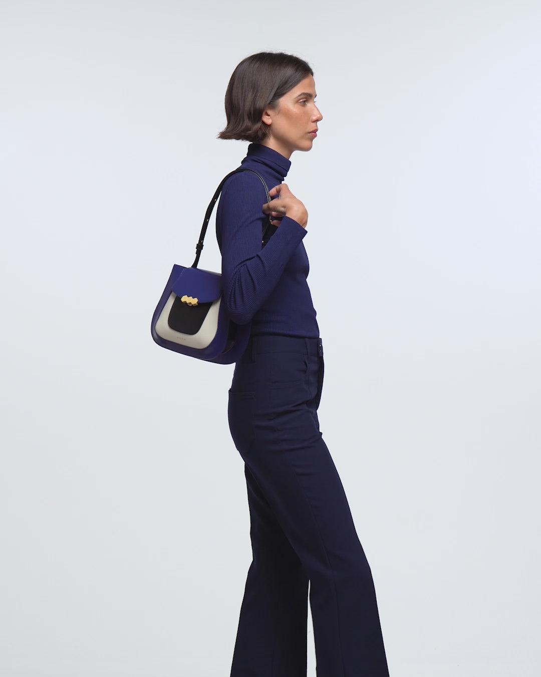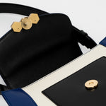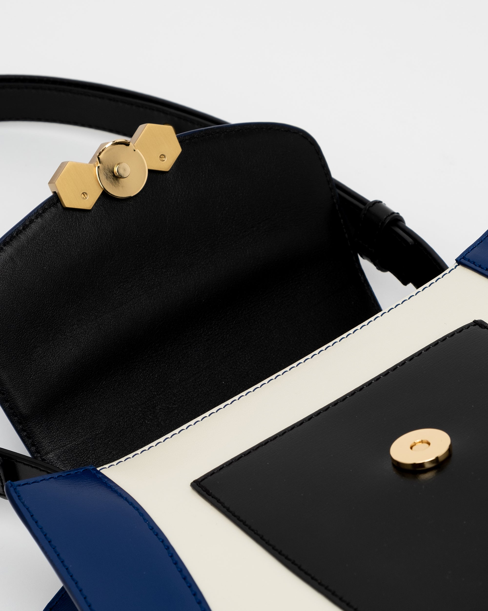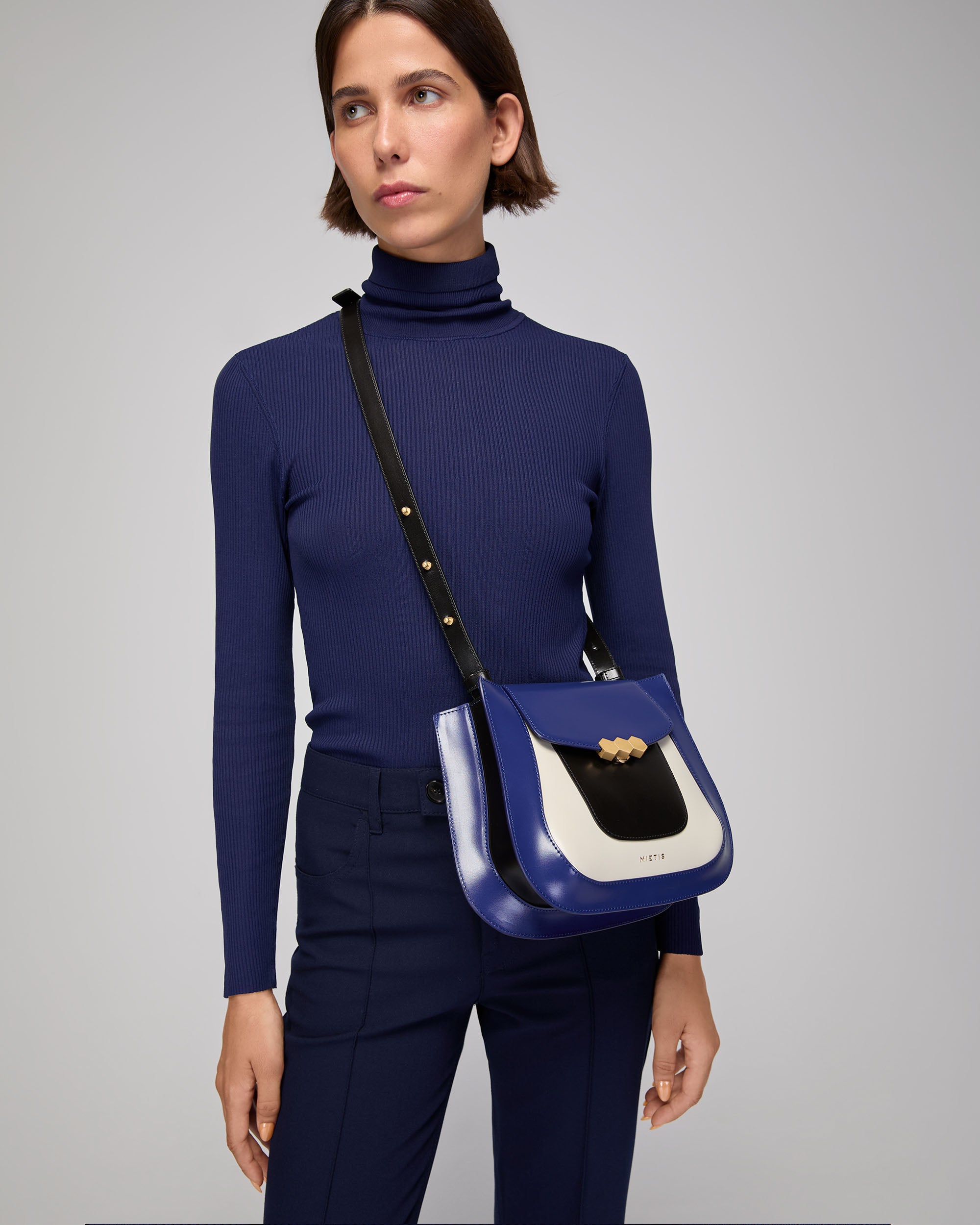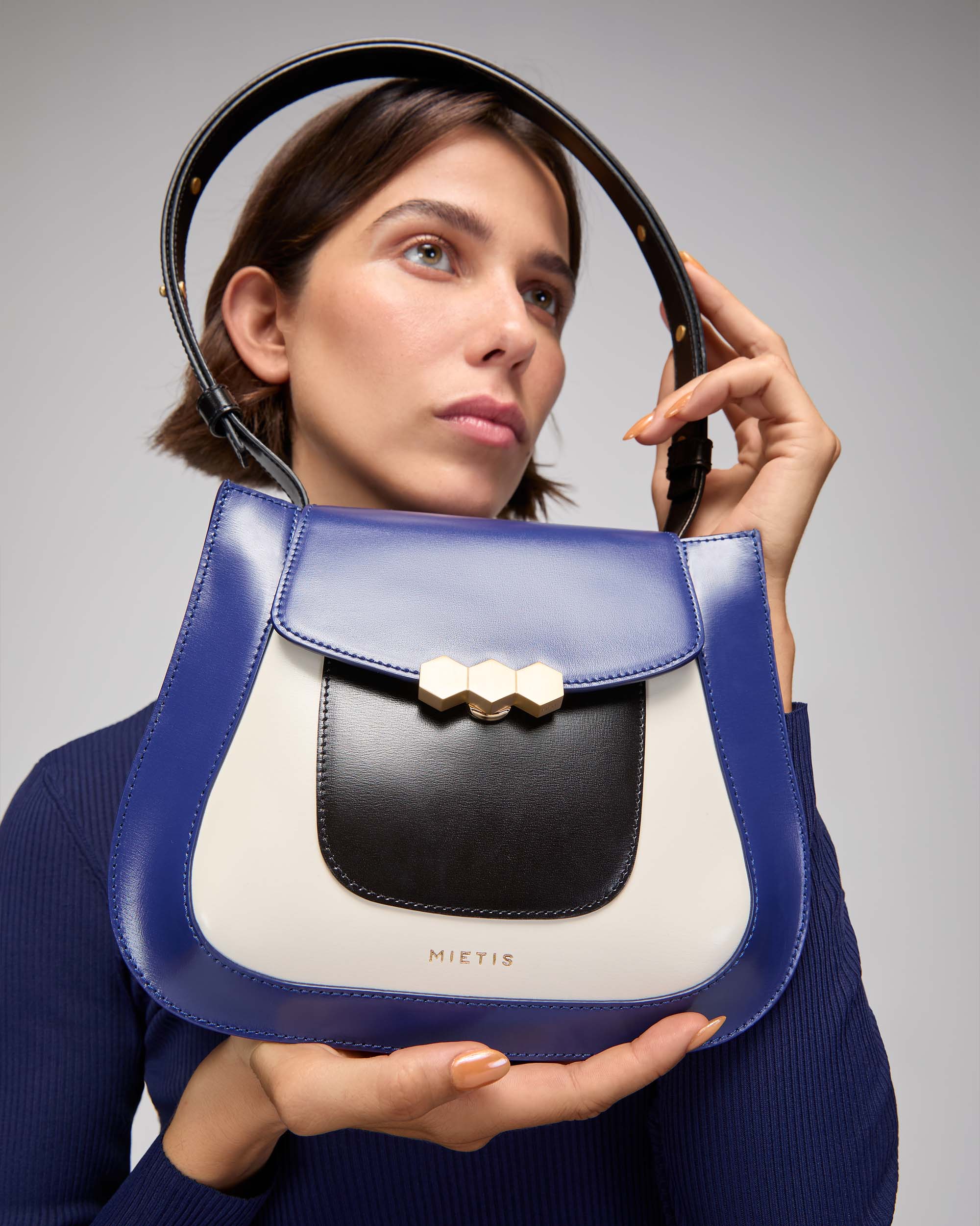 The Jill bag, inspired by the 70s, is a structured bag with a stiffer and shinier cowhide leather, applying the contemporary touch of Mietis with the detail of the hand-painted edges and contrasting stitching. The Jill bag is finished with a custom metallic closure: the three hexagons, which symbolize harmony and balance.