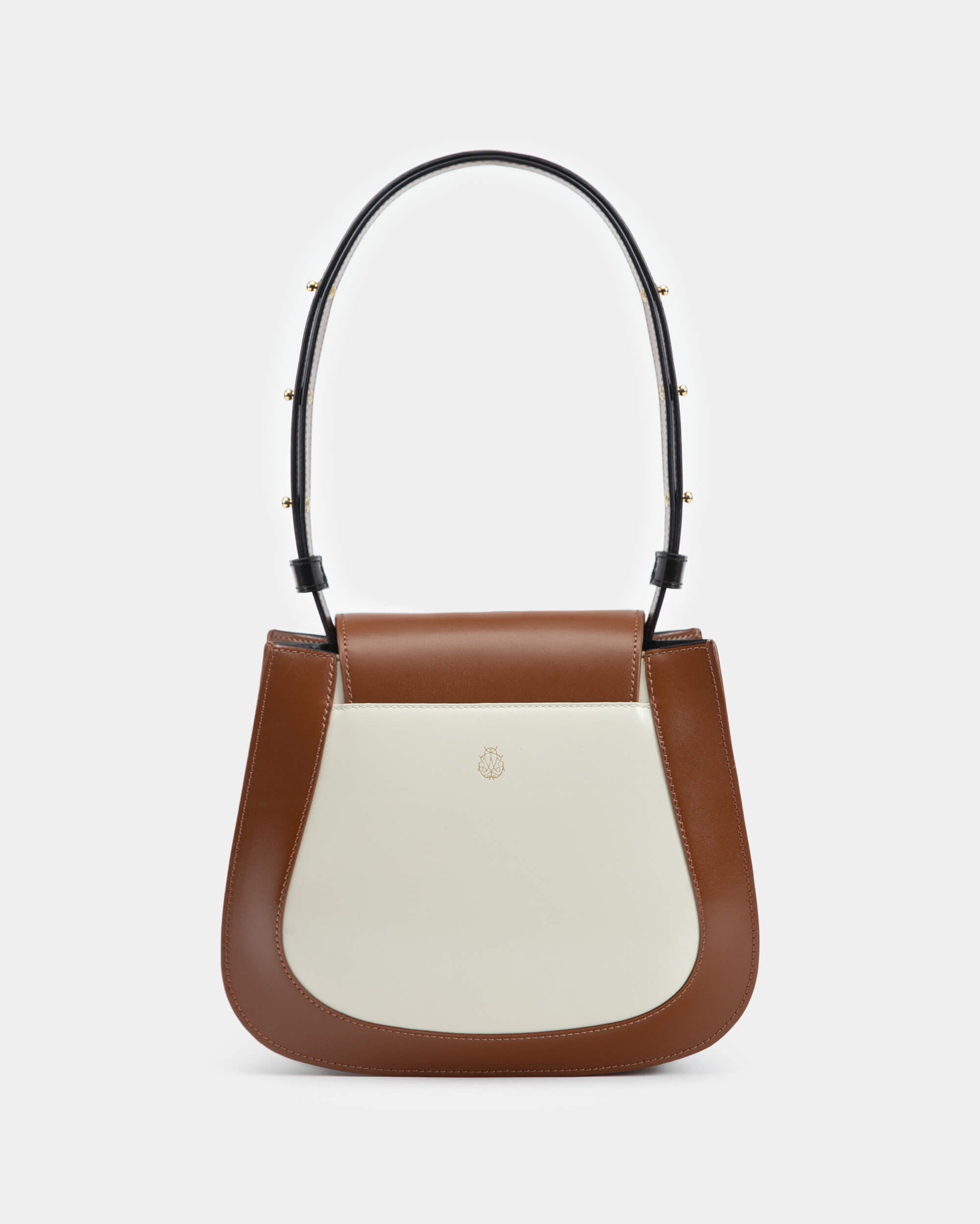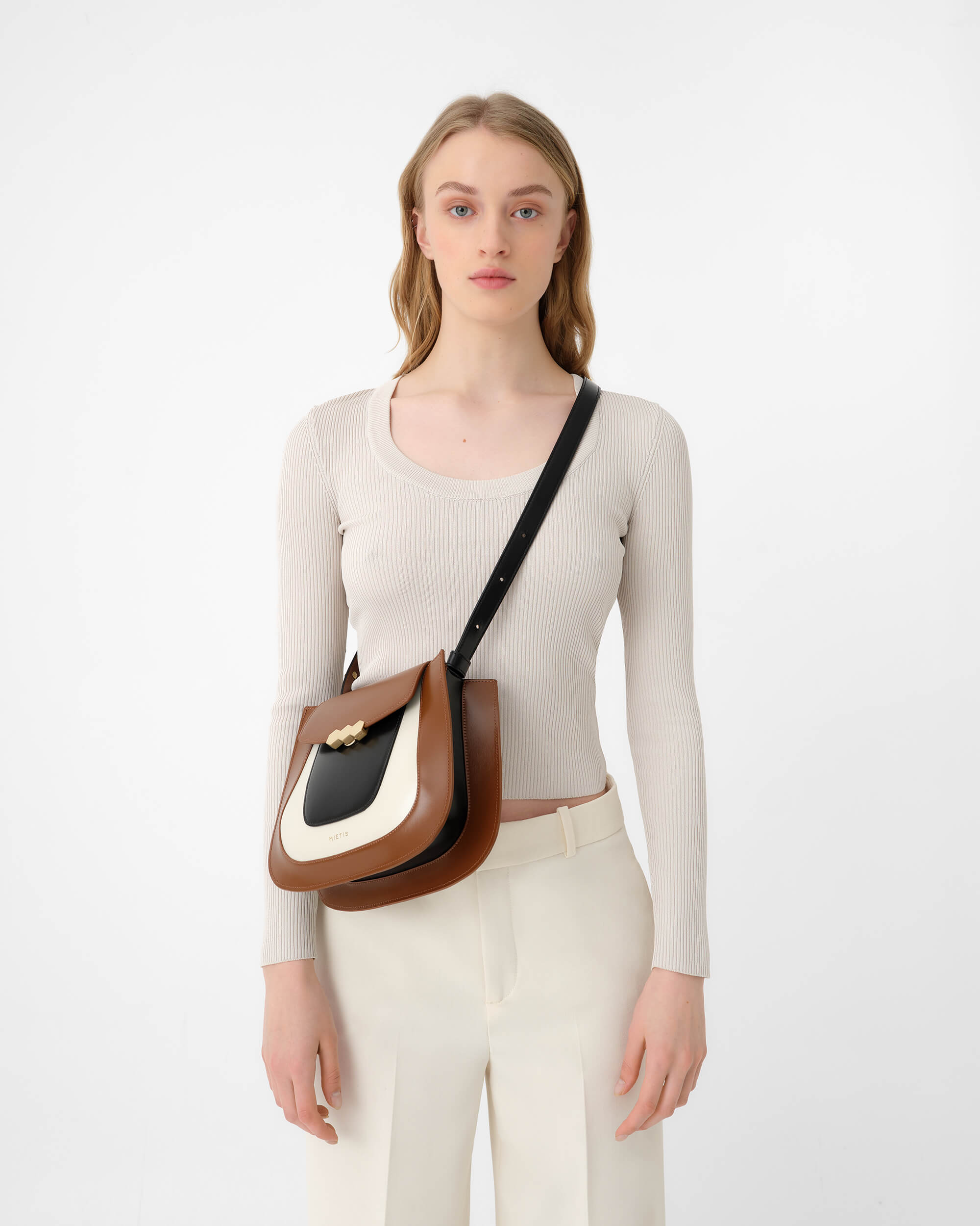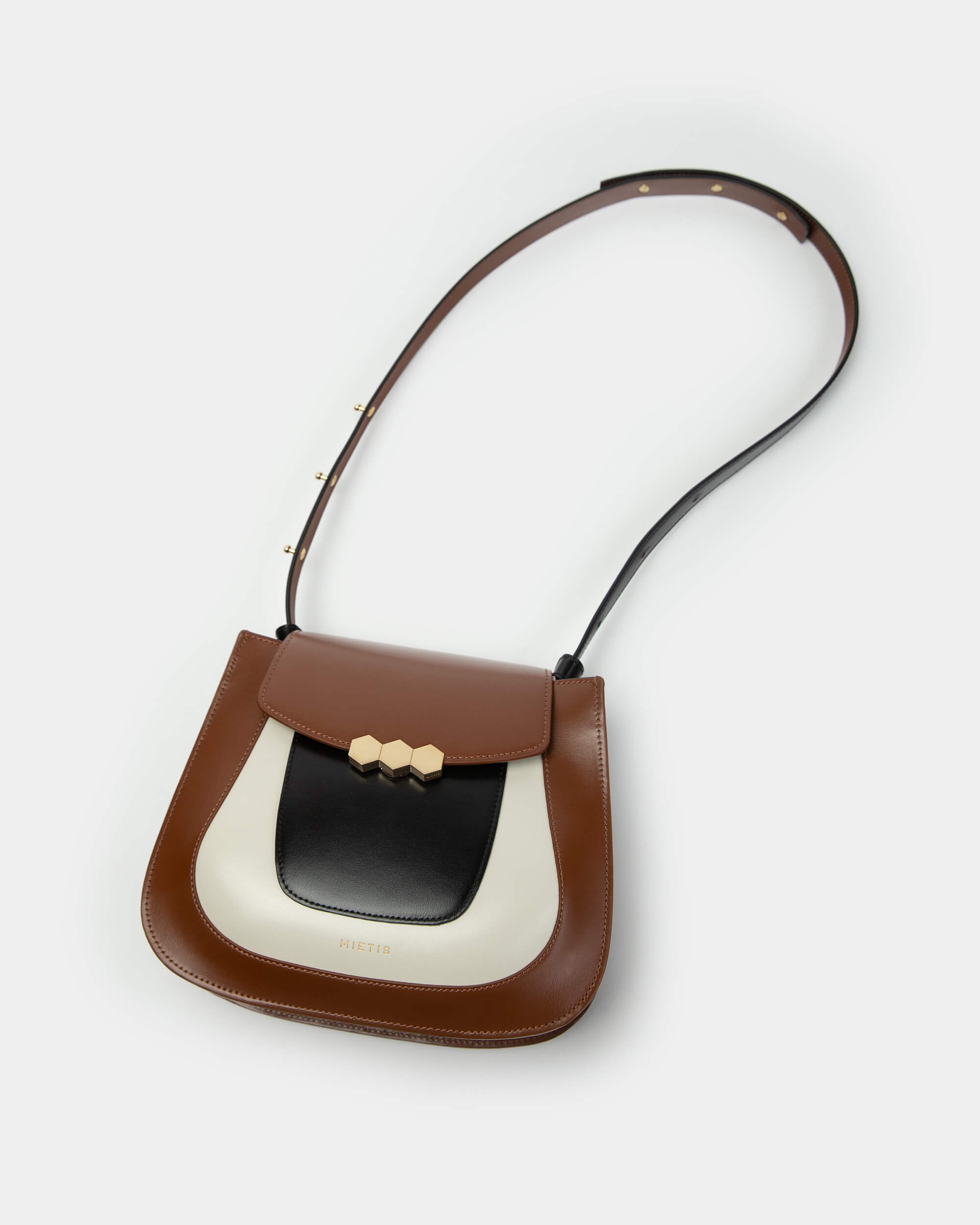 The Jill bag, inspired by the 70s, is a structured bag with a stiffer and shinier cowhide leather, applying the contemporary touch of Mietis with the detail of the hand-painted edges and contrasting stitching. The Jill bag is finished with a custom metallic closure: the three hexagons, which symbolize harmony and balance.