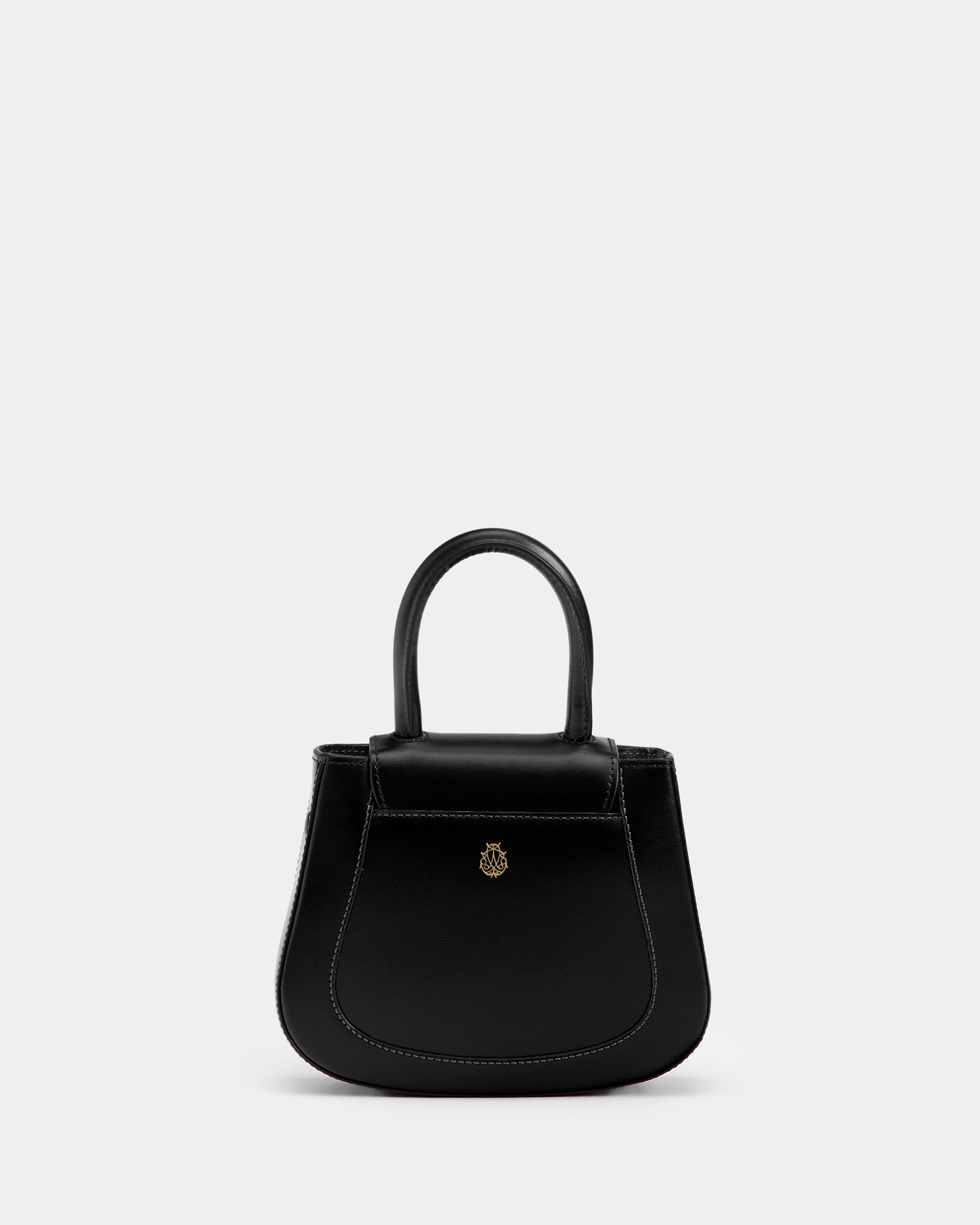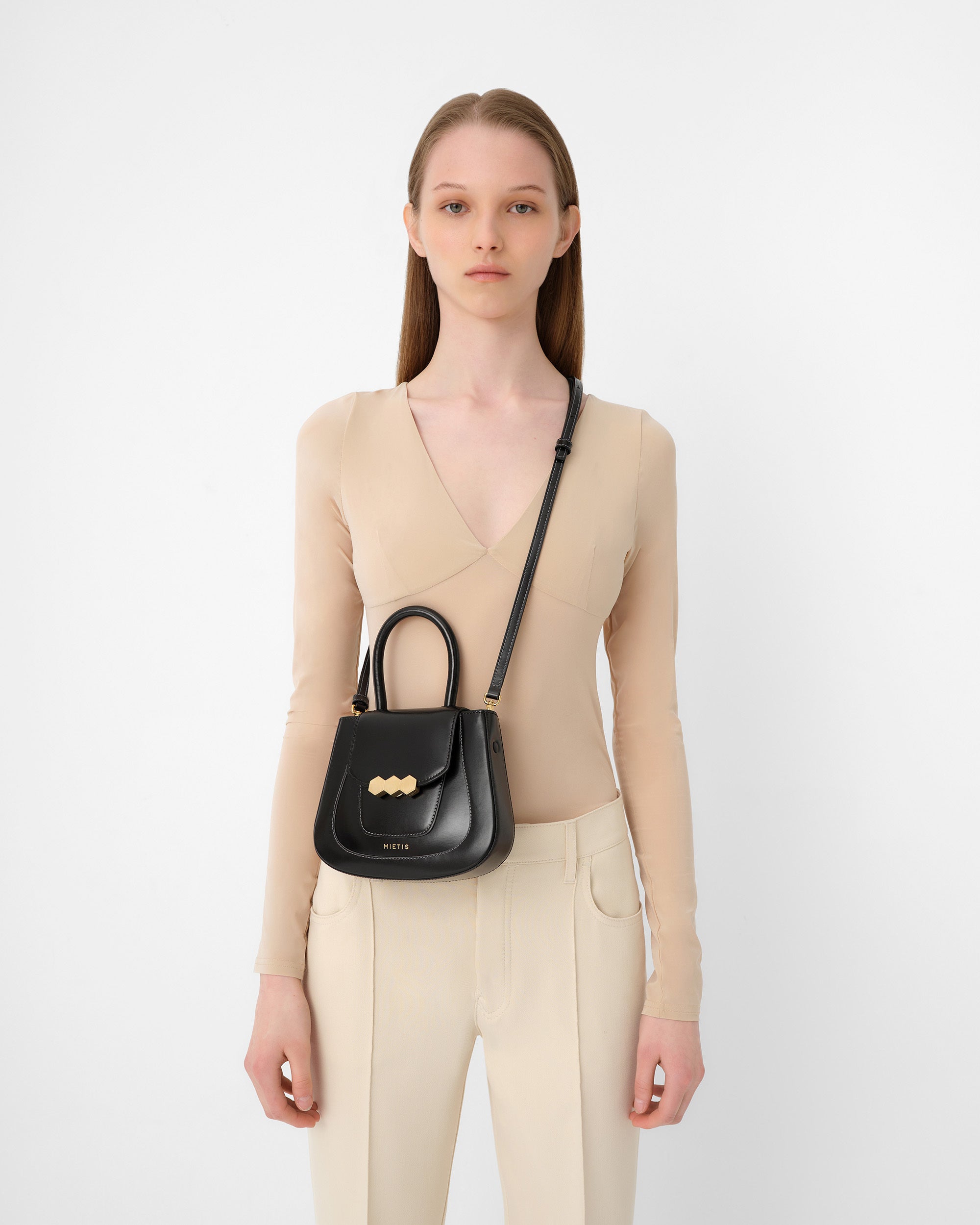The Mini Jill bag, inspired by the 70s, is a structured bag with a stiffer and shinier cowhide leather, applying the contemporary touch of Mietis with the detail of the hand-painted edges and stitching in contrasting colors. The Jill bag is finished with a custom metallic closure: the three hexagons, which symbolize harmony and balance.