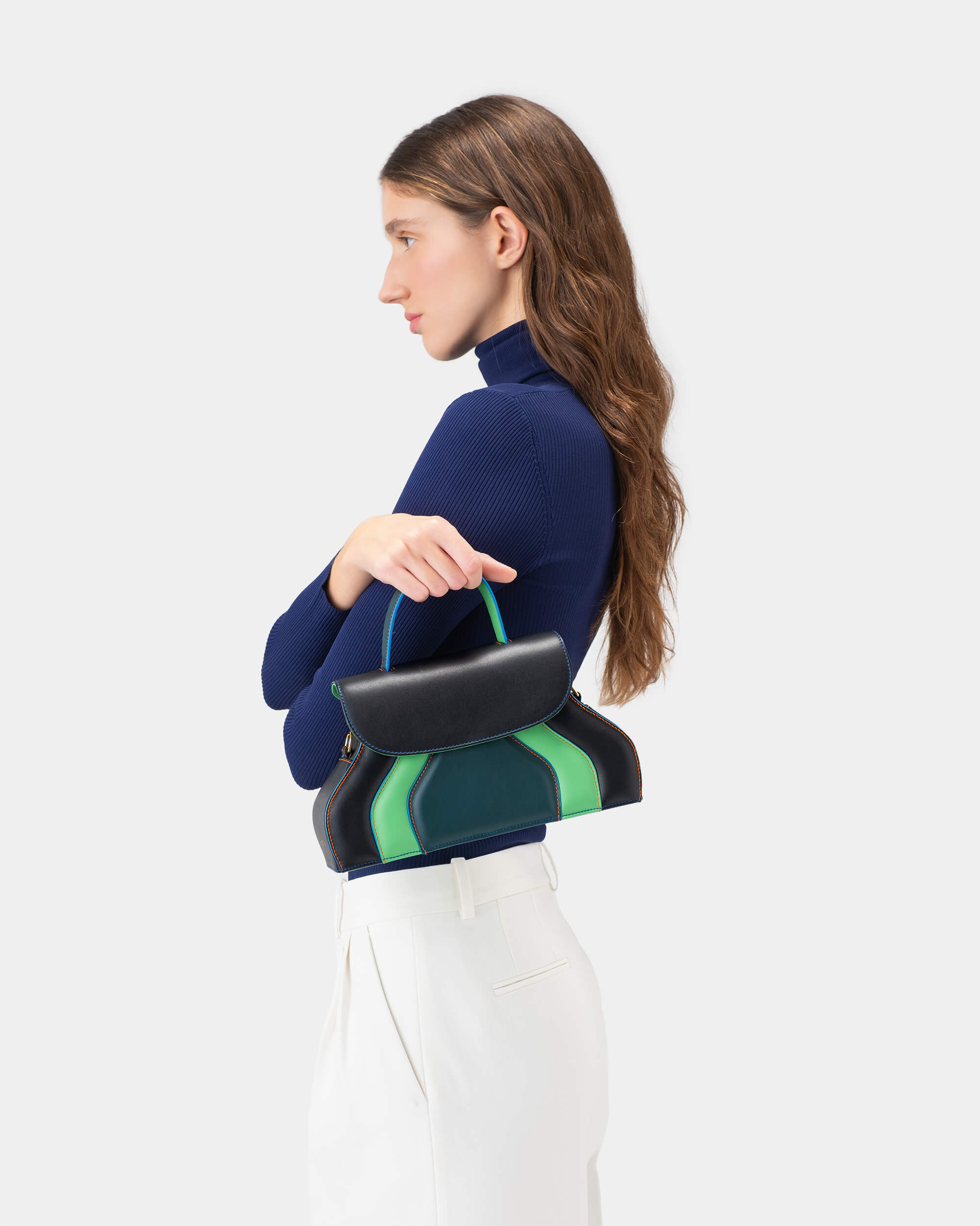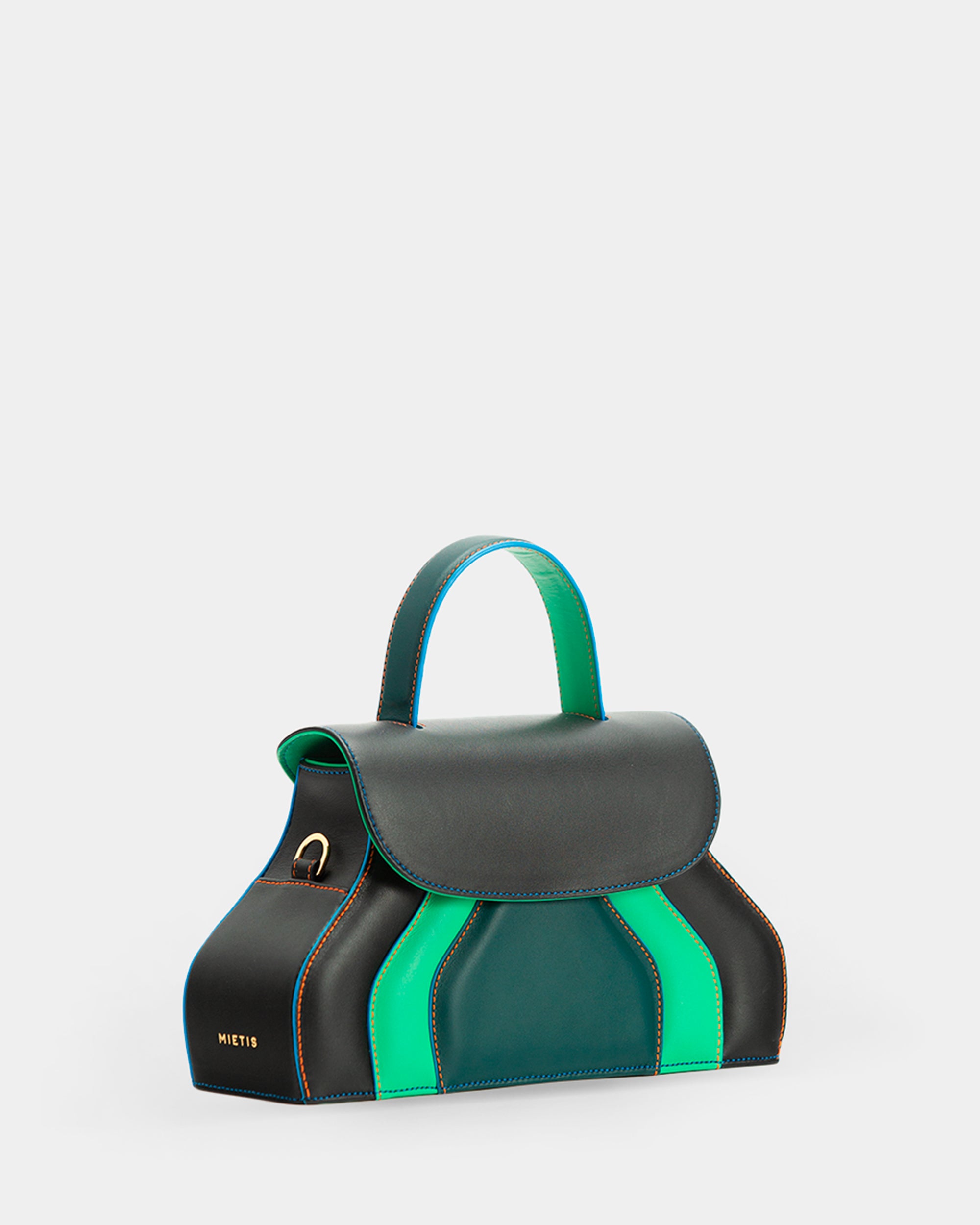 The Marieta handbag presents elegant and playful wavy panels at the front finished with the signature feature of Mietis’ colourful stitching and delicate contrasting edges. It can be worn by the top structured handle or leather shoulder strap. The bag guarantees a modern comfort for different attitudes.