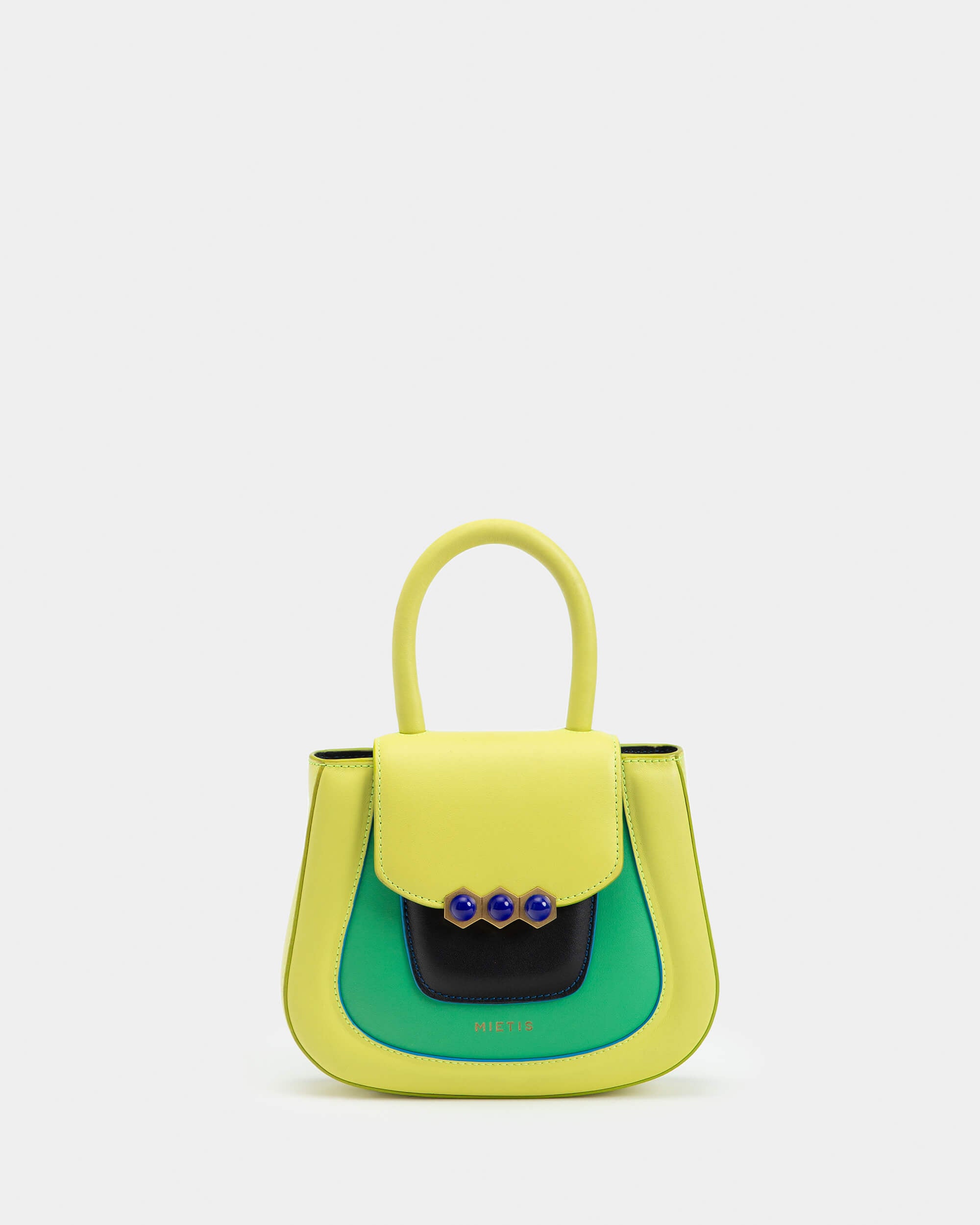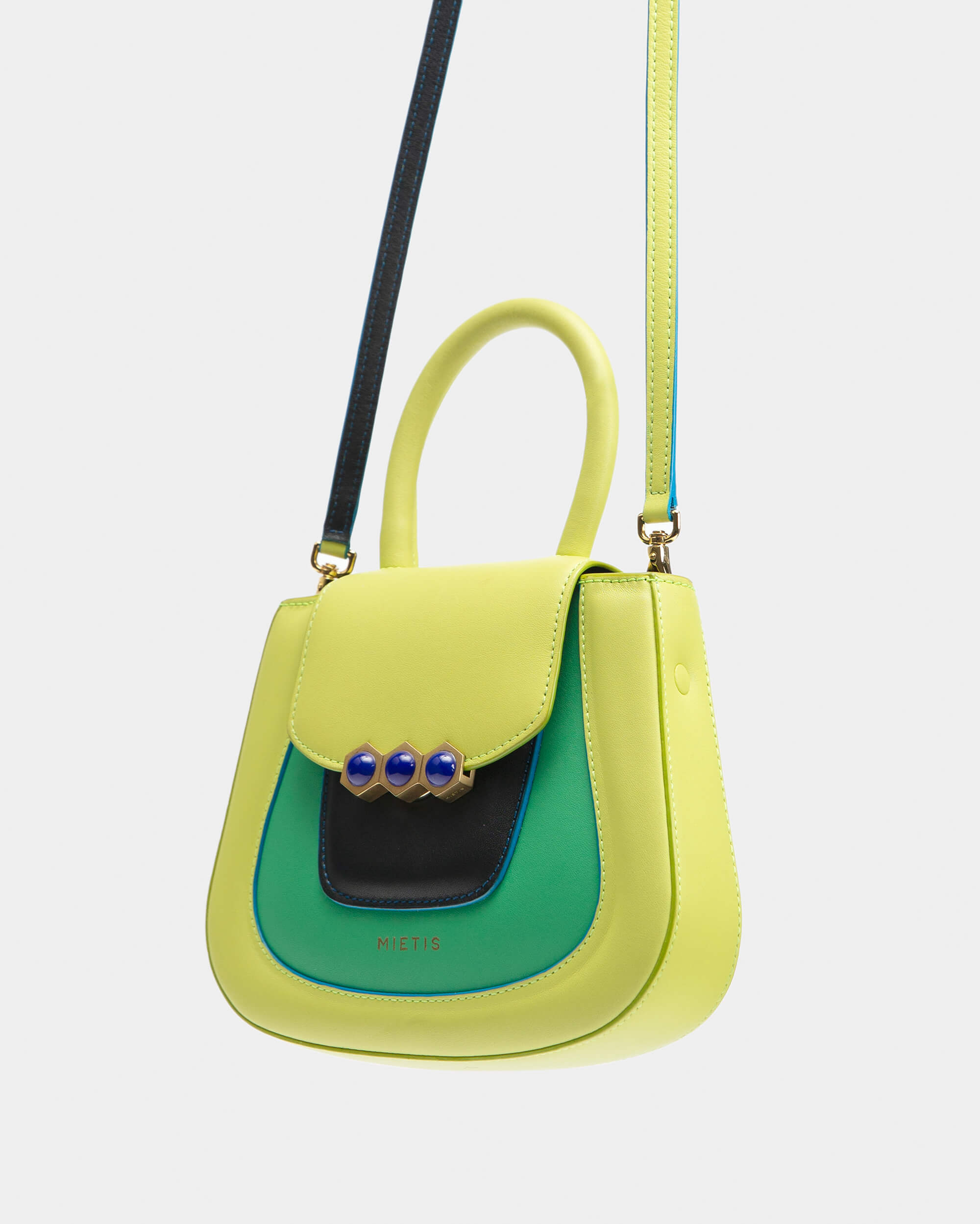 The Mini Jill bag, inspired by the 70s, is a structured bag with soft and padded cowhide leather, applying the contemporary touch of Mietis with the detail of the hand-painted edges and stitching in contrasting colors. The Mini Jill bag is finished with a custom metallic closure: the three hexagons, which symbolize harmony and balance.
