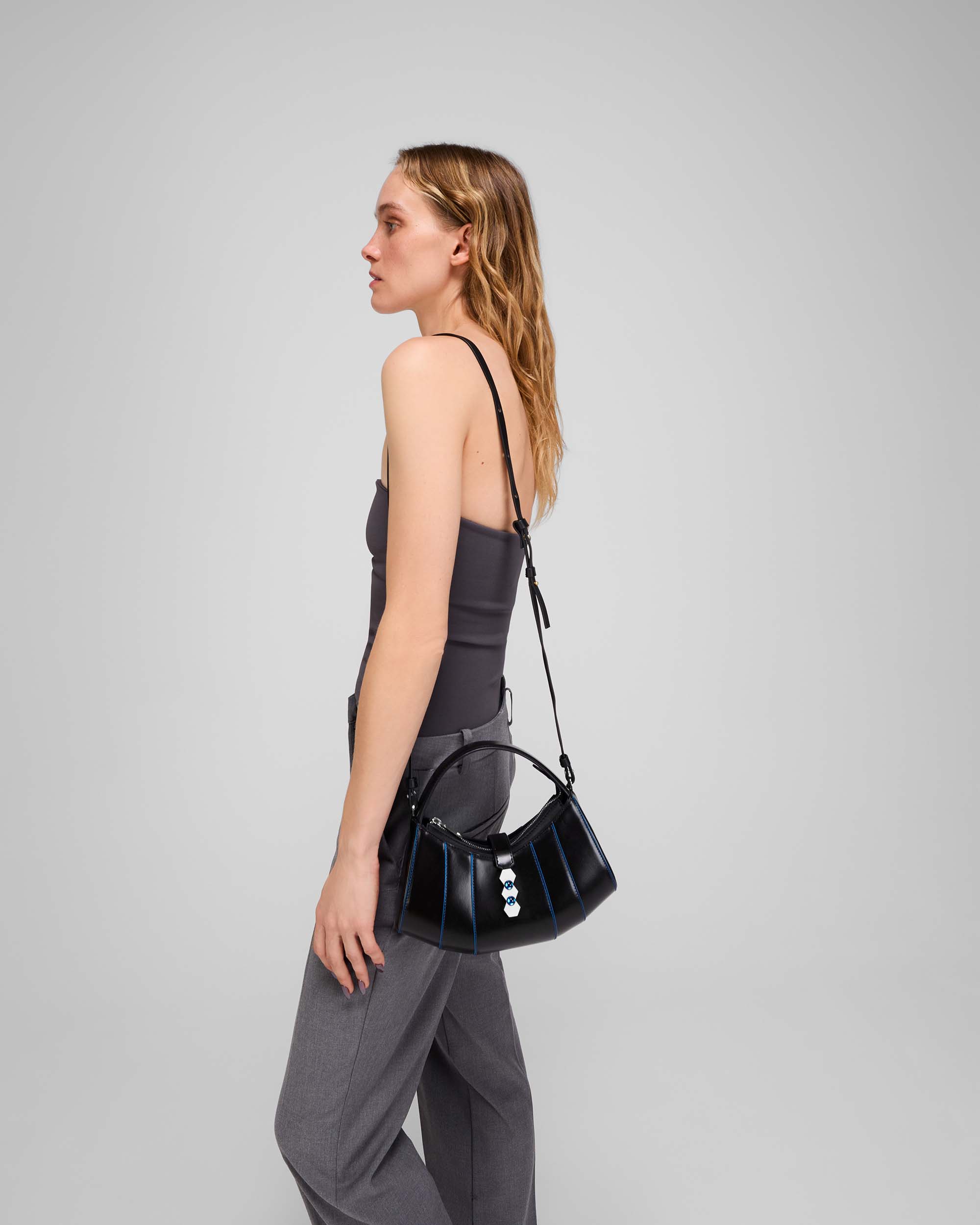 The Tate Petite bag it is a refined, elegant and instantly recognizable sculptural shape to those in love with the brand, as it comes from the family of the iconic Tatu and Tatito Bags. The Tate Petite handbag is assembled from shiny leather and can be carried by the top handle or drape it cross-body. The vibrant color combinations are embellished with the gleaming gold hexagonal Mietis hardware.