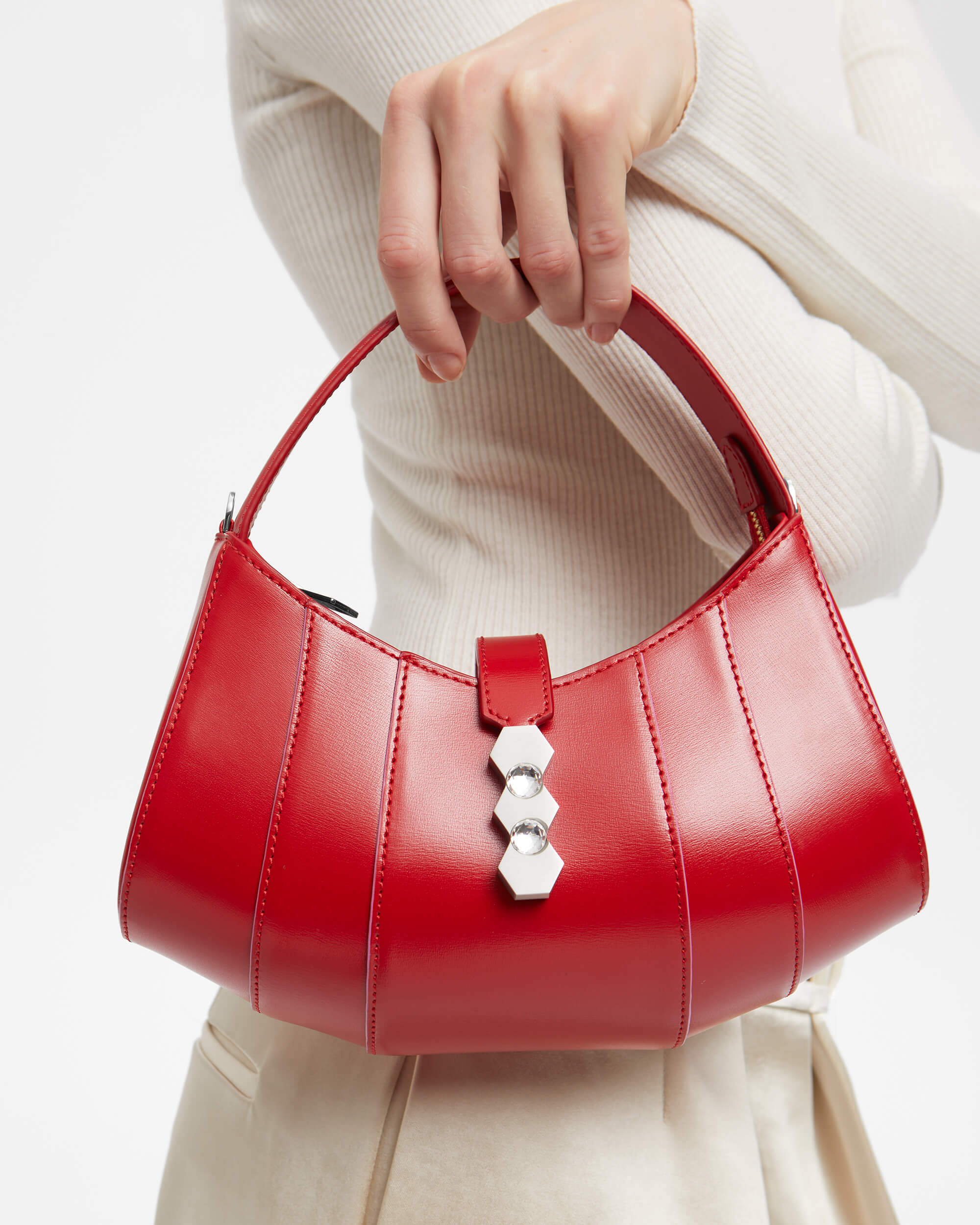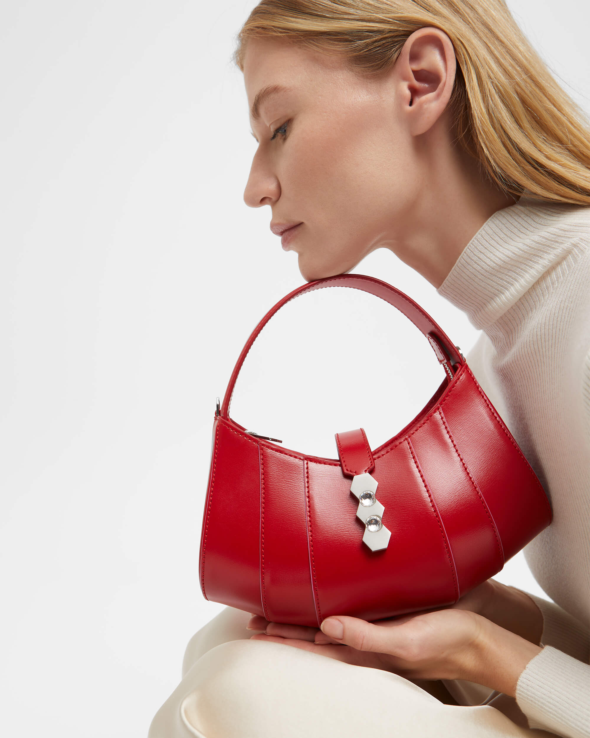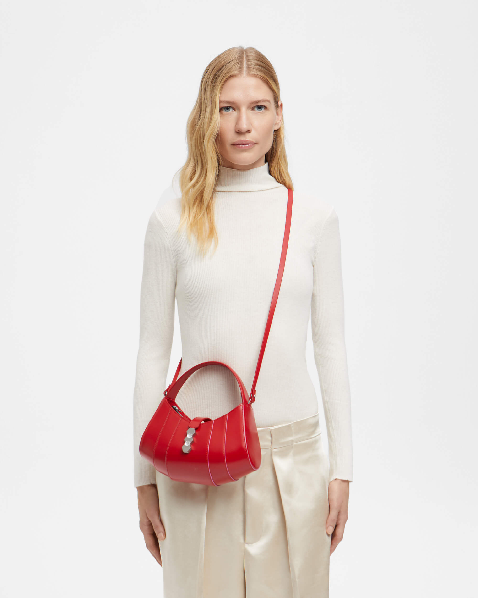 The Tate Petite bag it is a refined, elegant and instantly recognizable sculptural shape to those in love with the brand, as it comes from the family of the iconic Tatu and Tatito Bags. The Tate Petite handbag is assembled from shiny leather and can be carried by the top handle or drape it cross-body. The vibrant color combinations are embellished with the gleaming gold hexagonal Mietis hardware.
