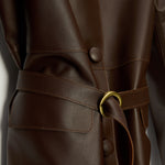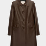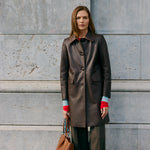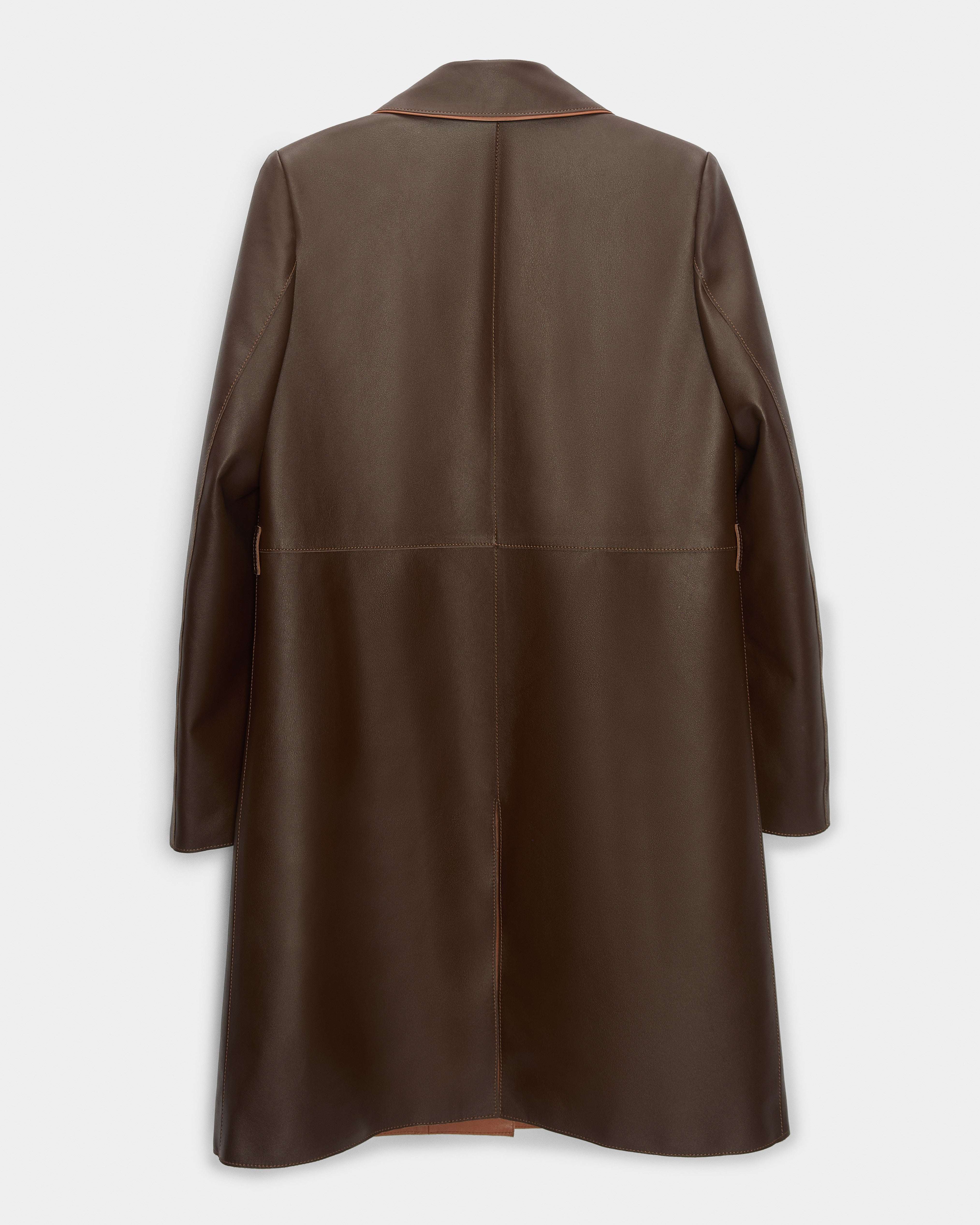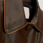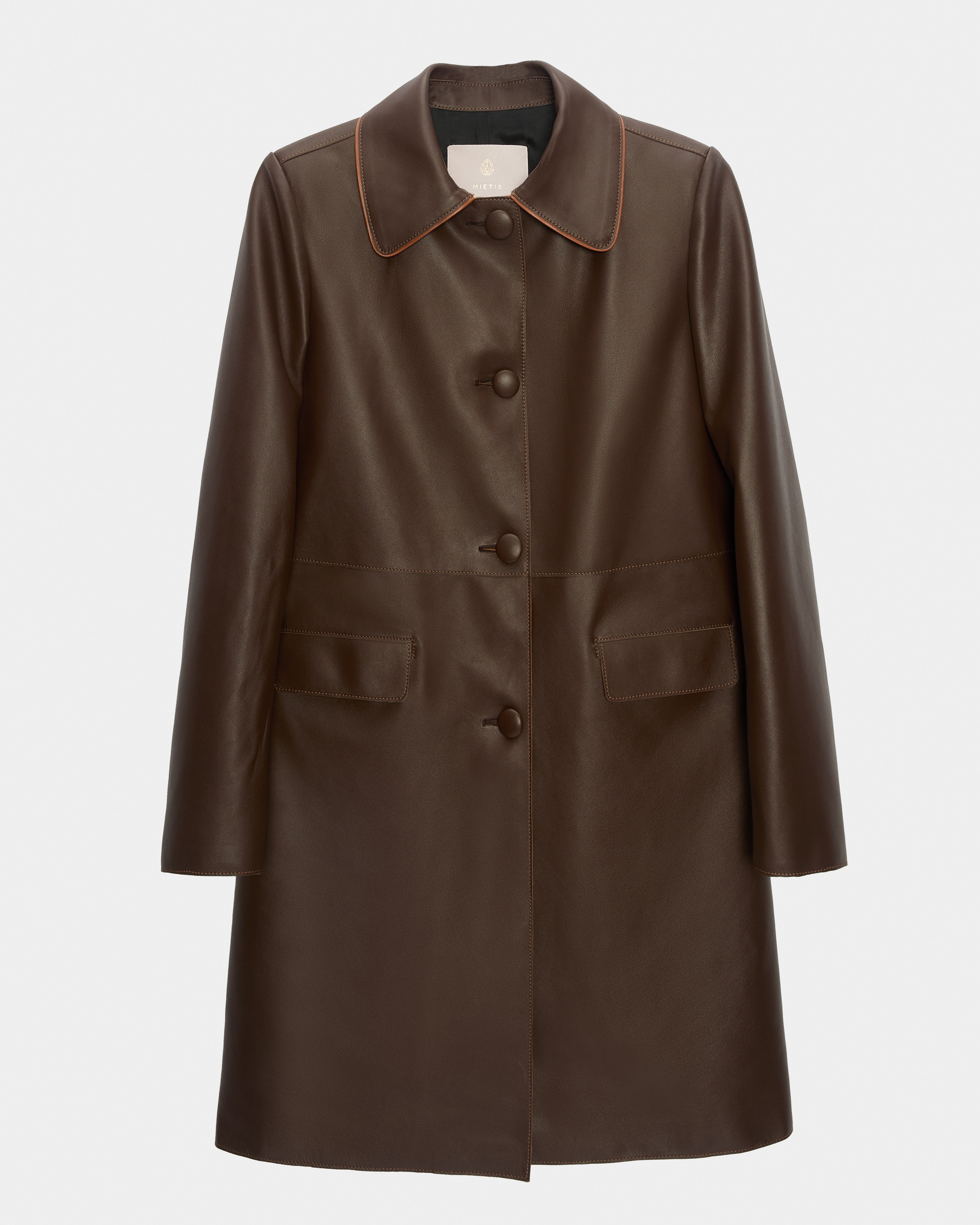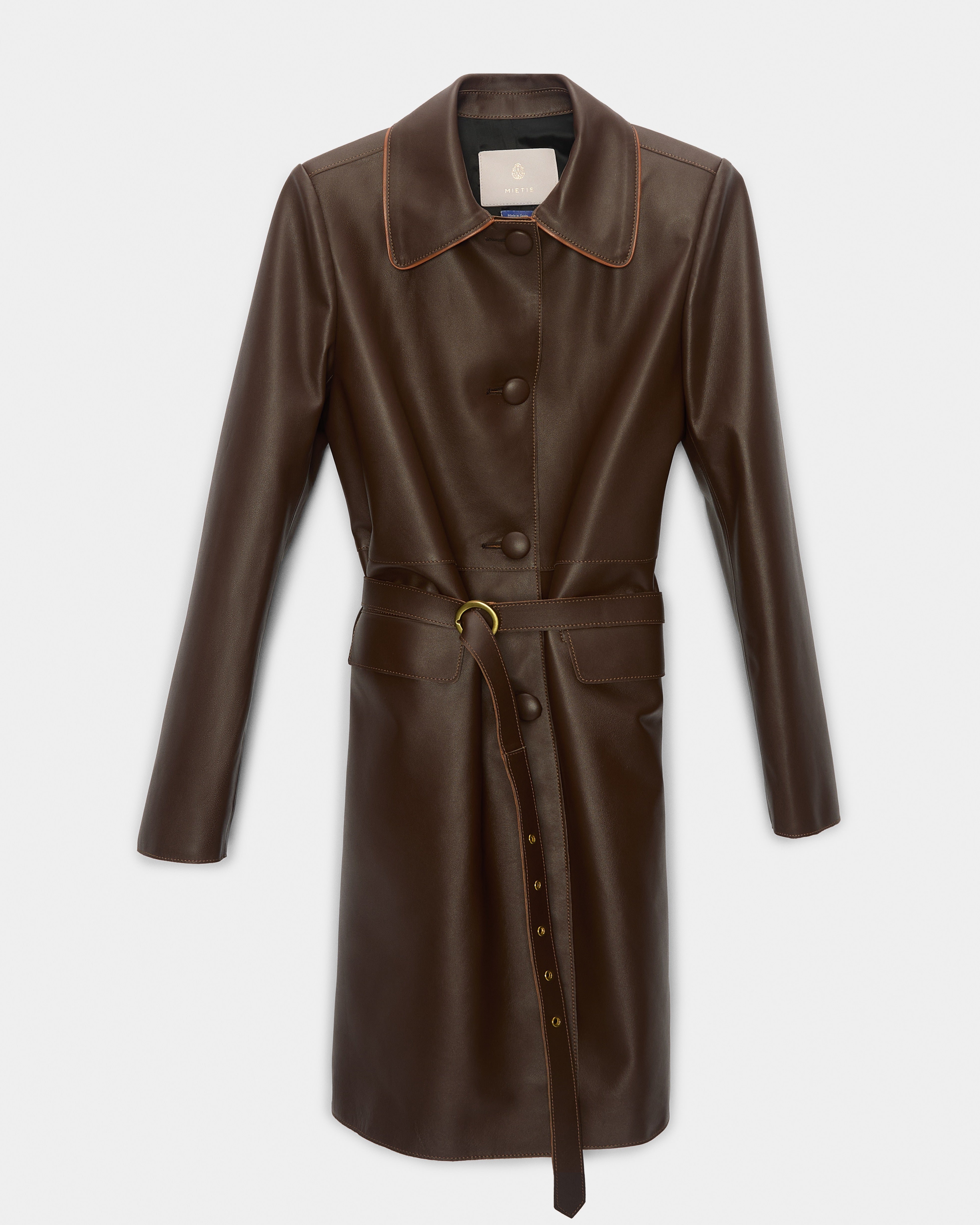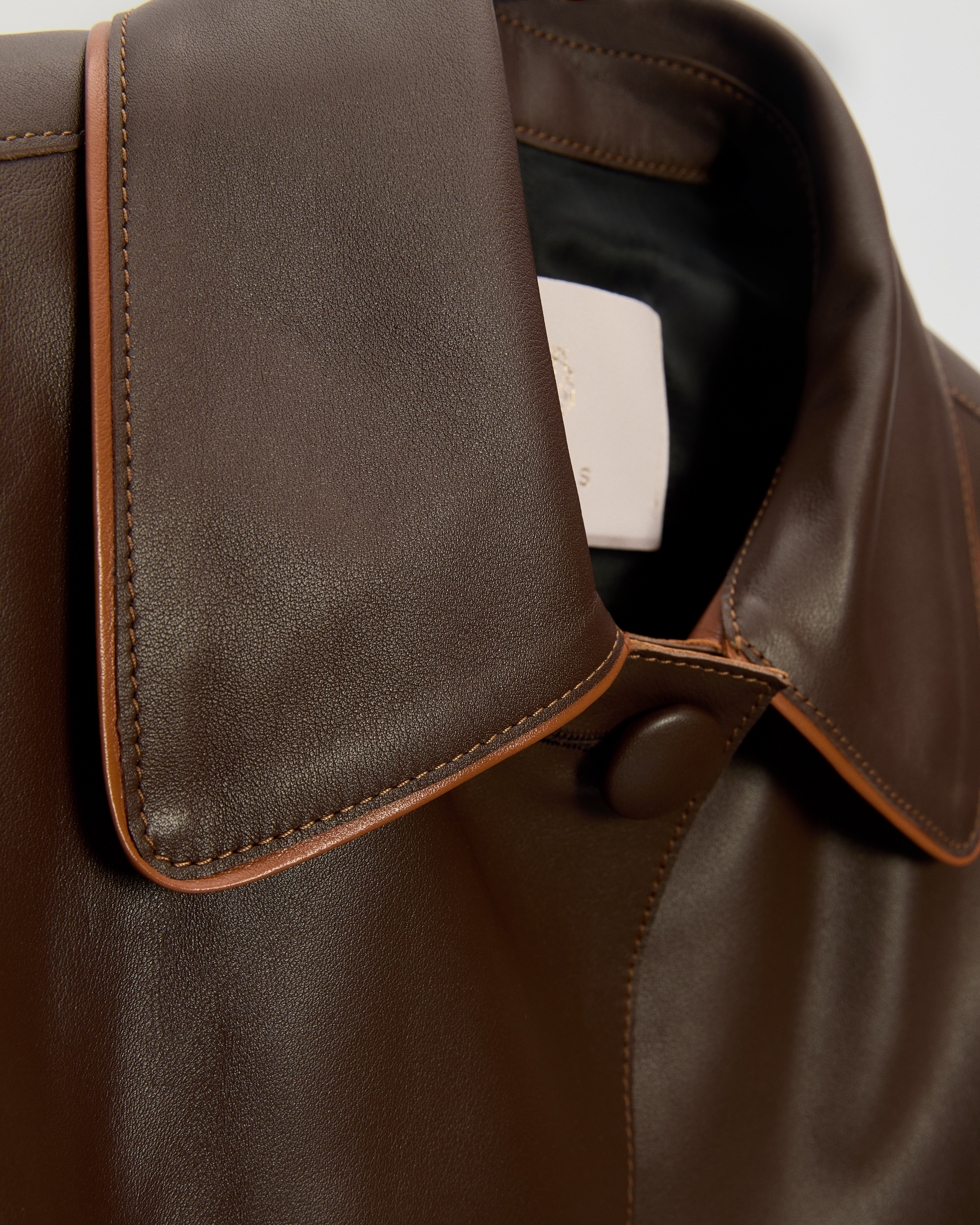 Crafted by hand from premium leather, its structured silhouette and covered buttons recall pure tailoring, while the subtle color contrast on the collar adds that distinctive MIETIS touch.