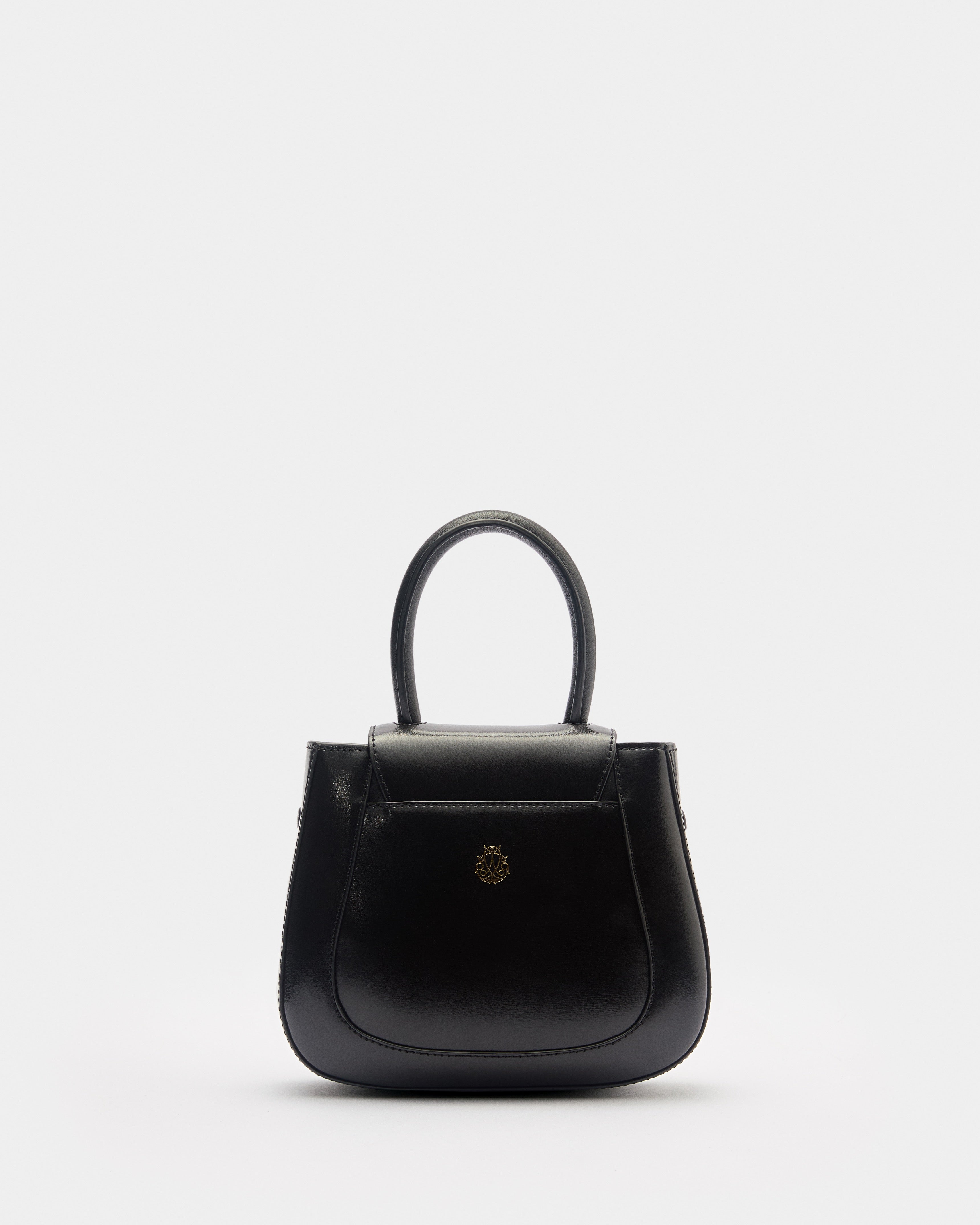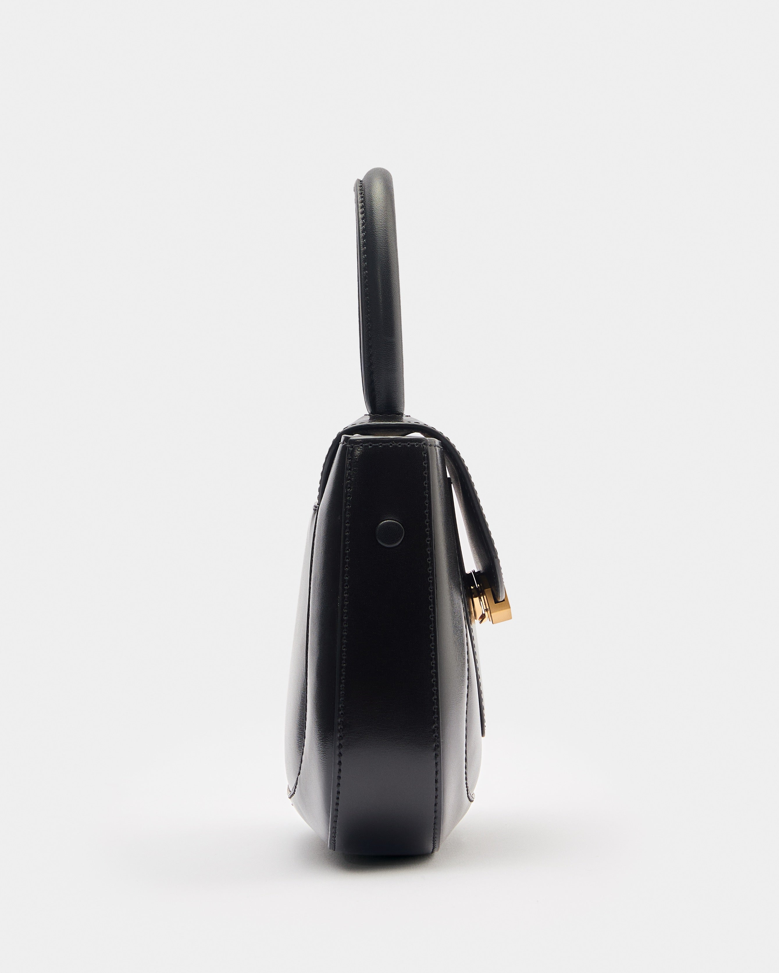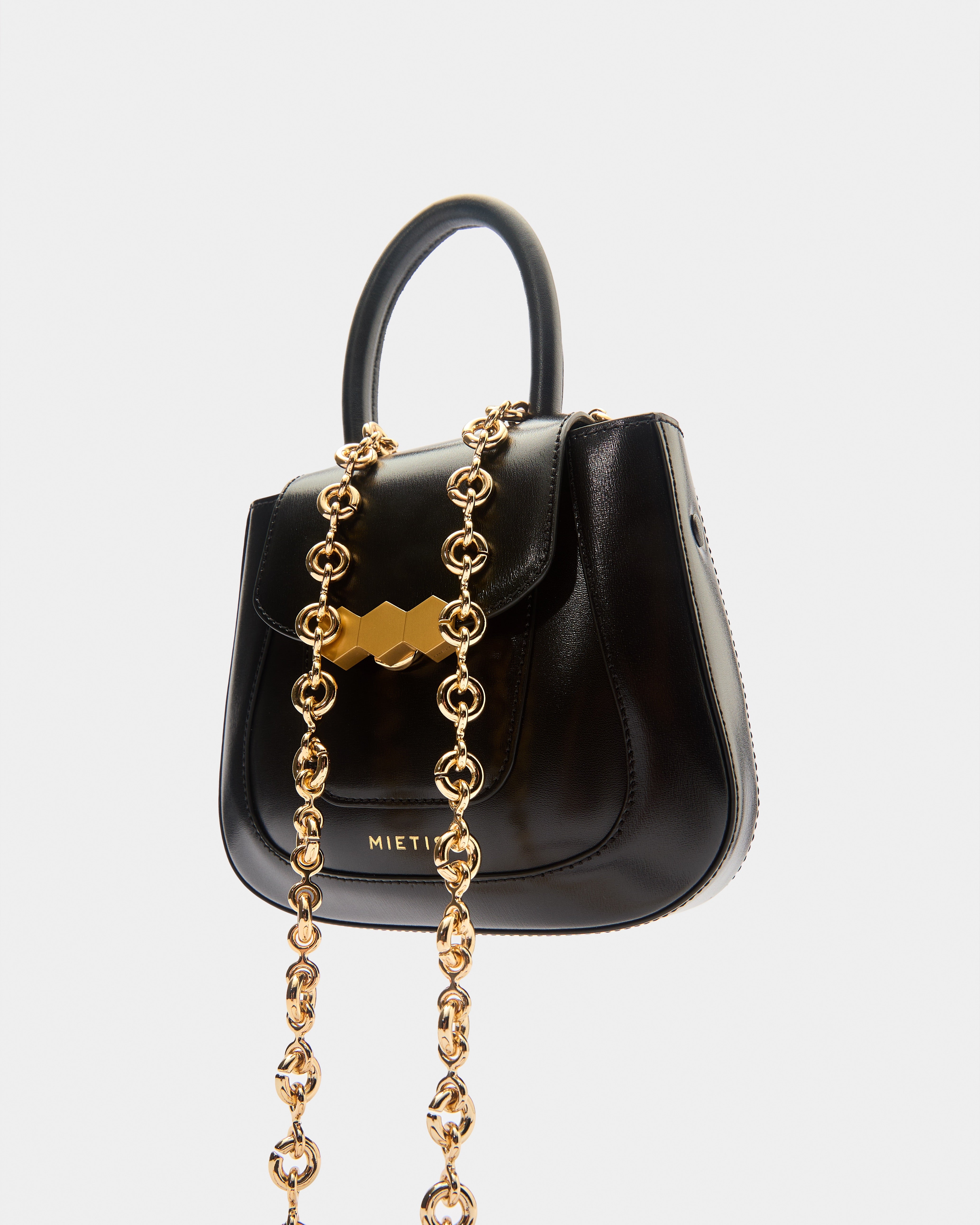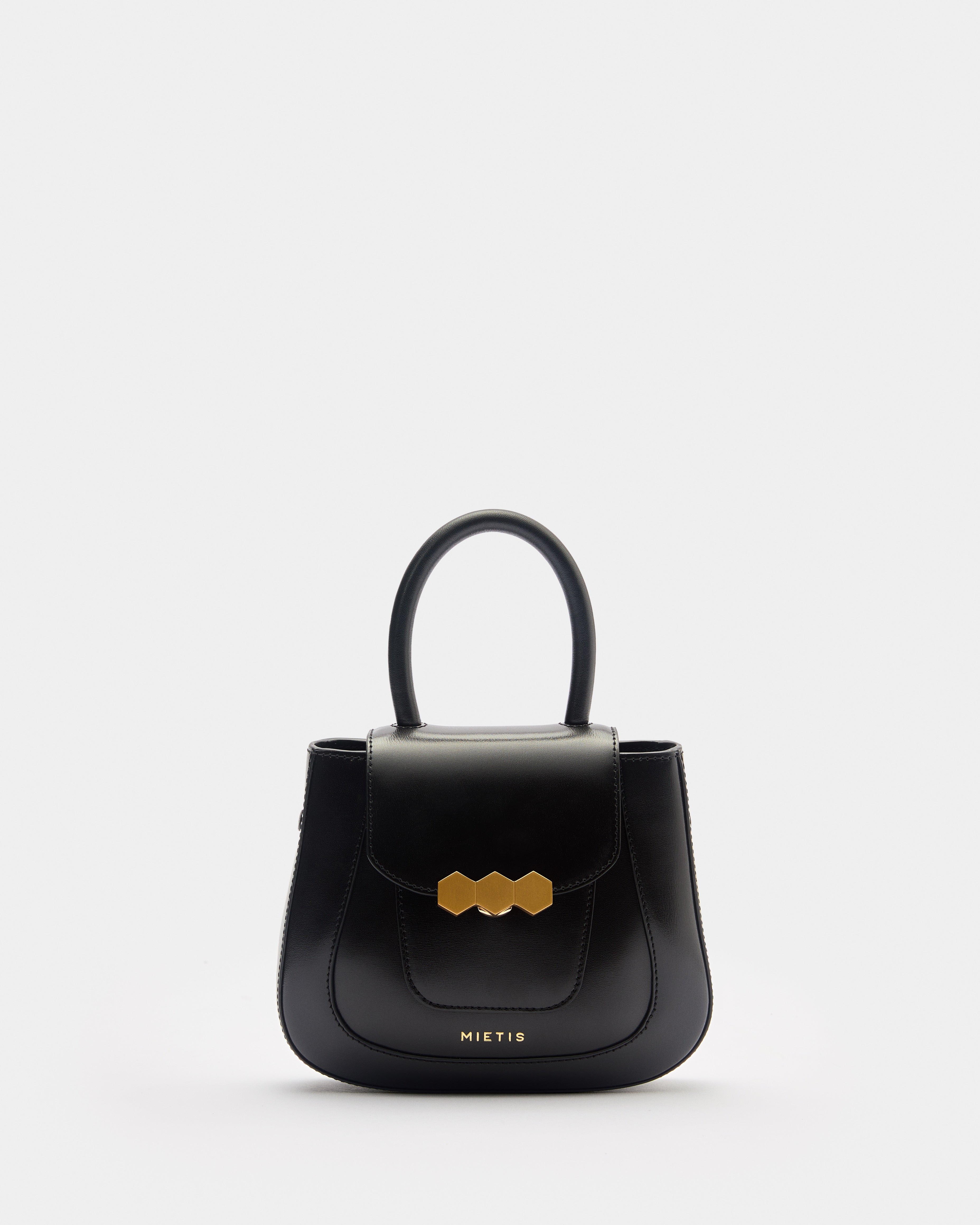 The Mini Jill bag, inspired by the 70s, is a structured bag with a stiffer and shinier cowhide leather, applying the contemporary touch of Mietis with the detail of the hand-painted edges and stitching in contrasting colors. The Jill bag is finished with a custom metallic closure: the three hexagons, which symbolize harmony and balance.
