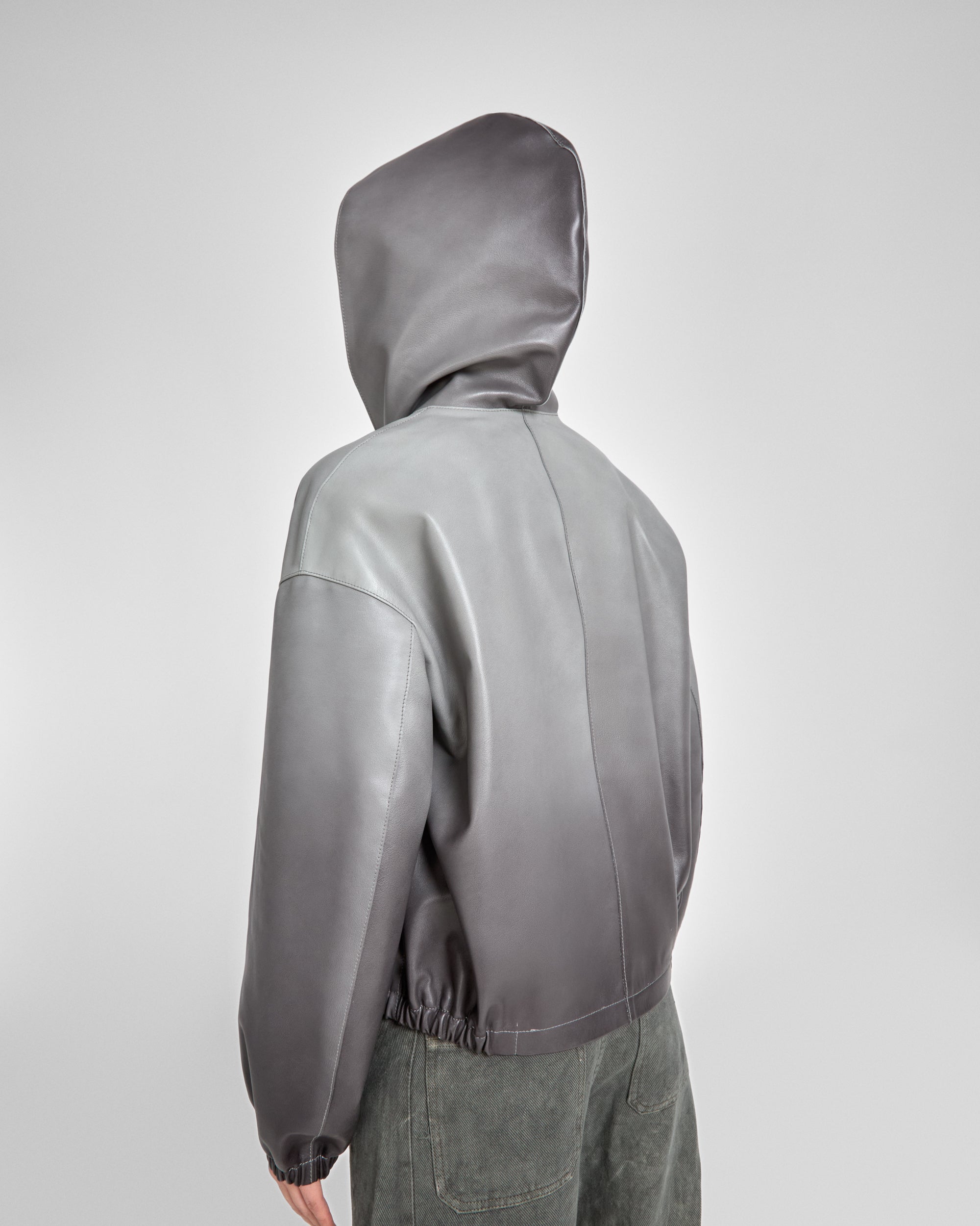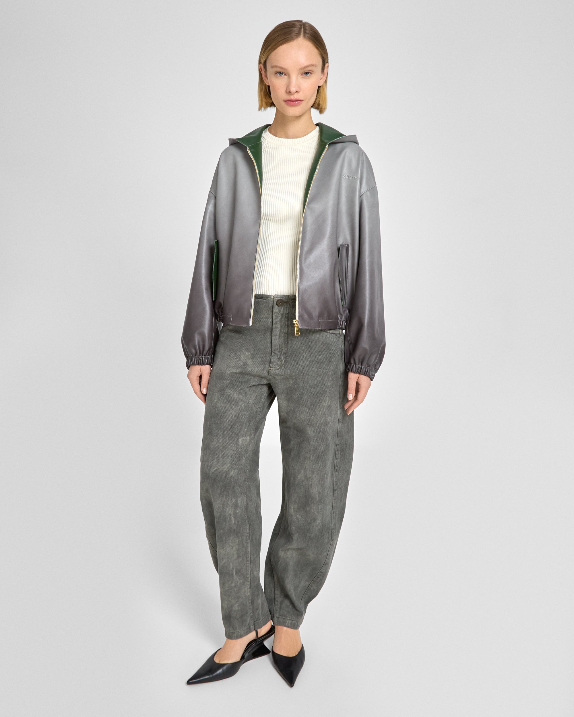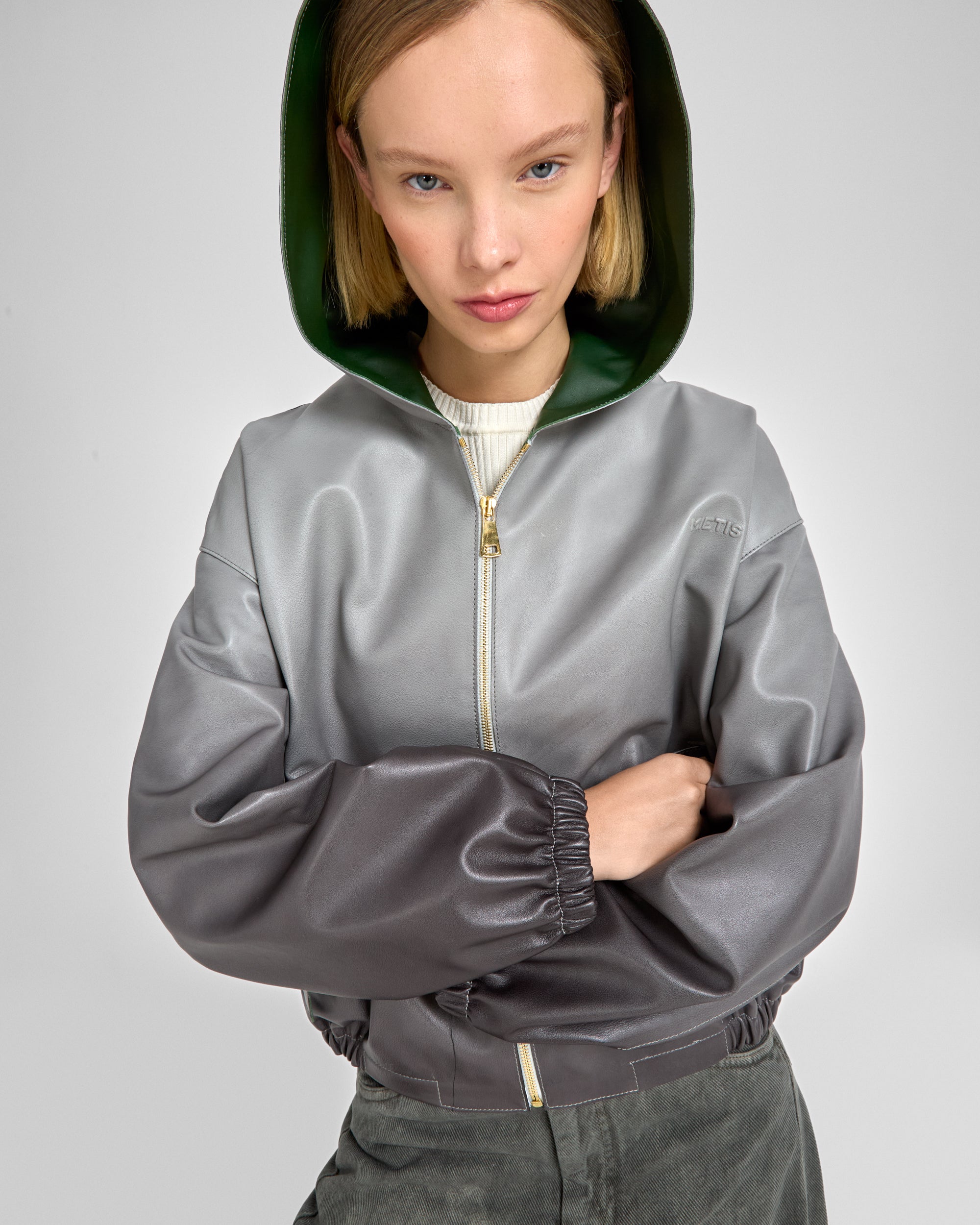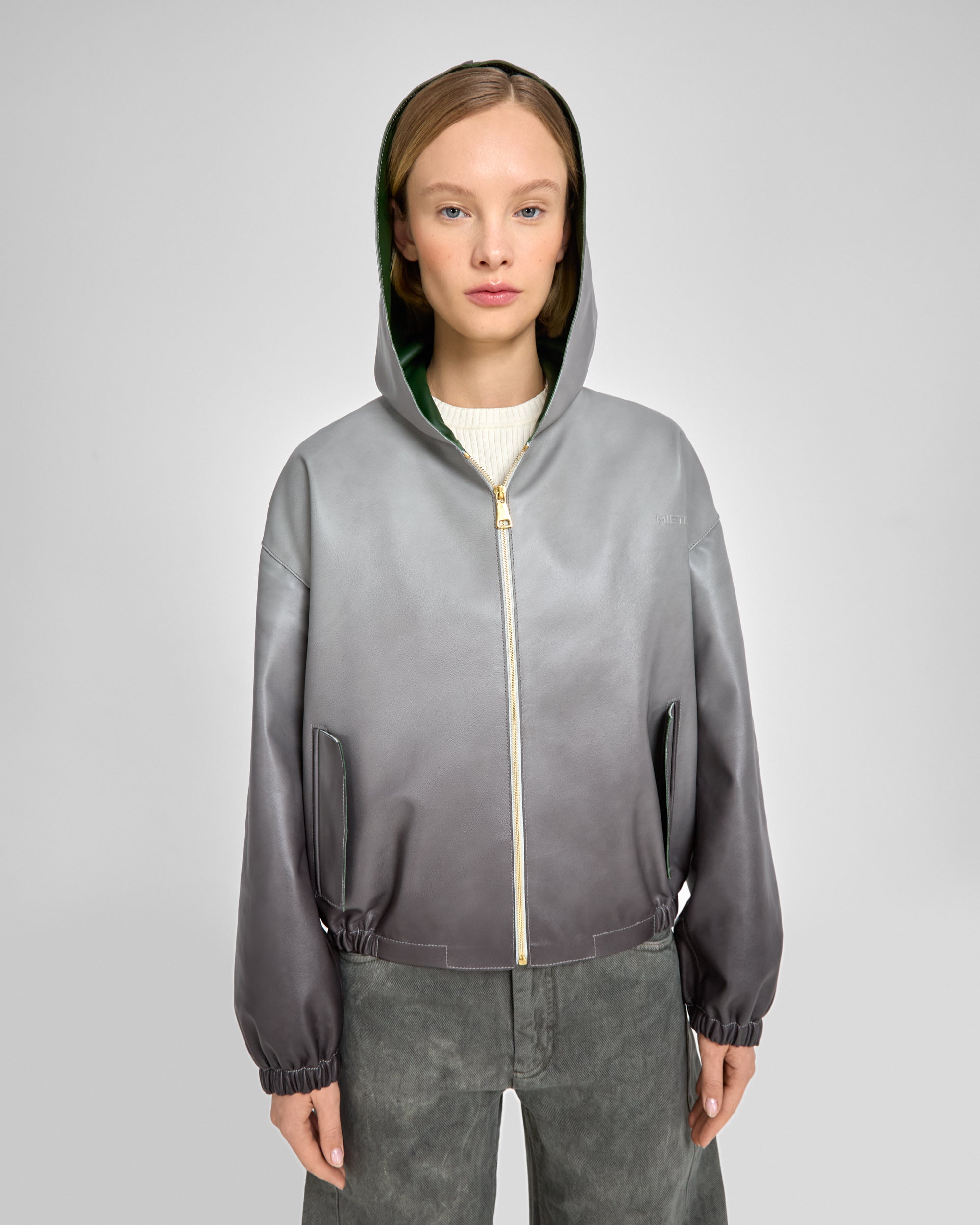 La chaqueta bomber oversize está confeccionada en suave piel de becerro y forro de viscosa. Cuenta con un cierre frontal con cremallera metálica dorada. El diseño incluye cuello bomber de punto, así como frunces con elástico en las mangas y el bajo para mayor volumen.