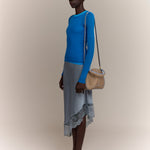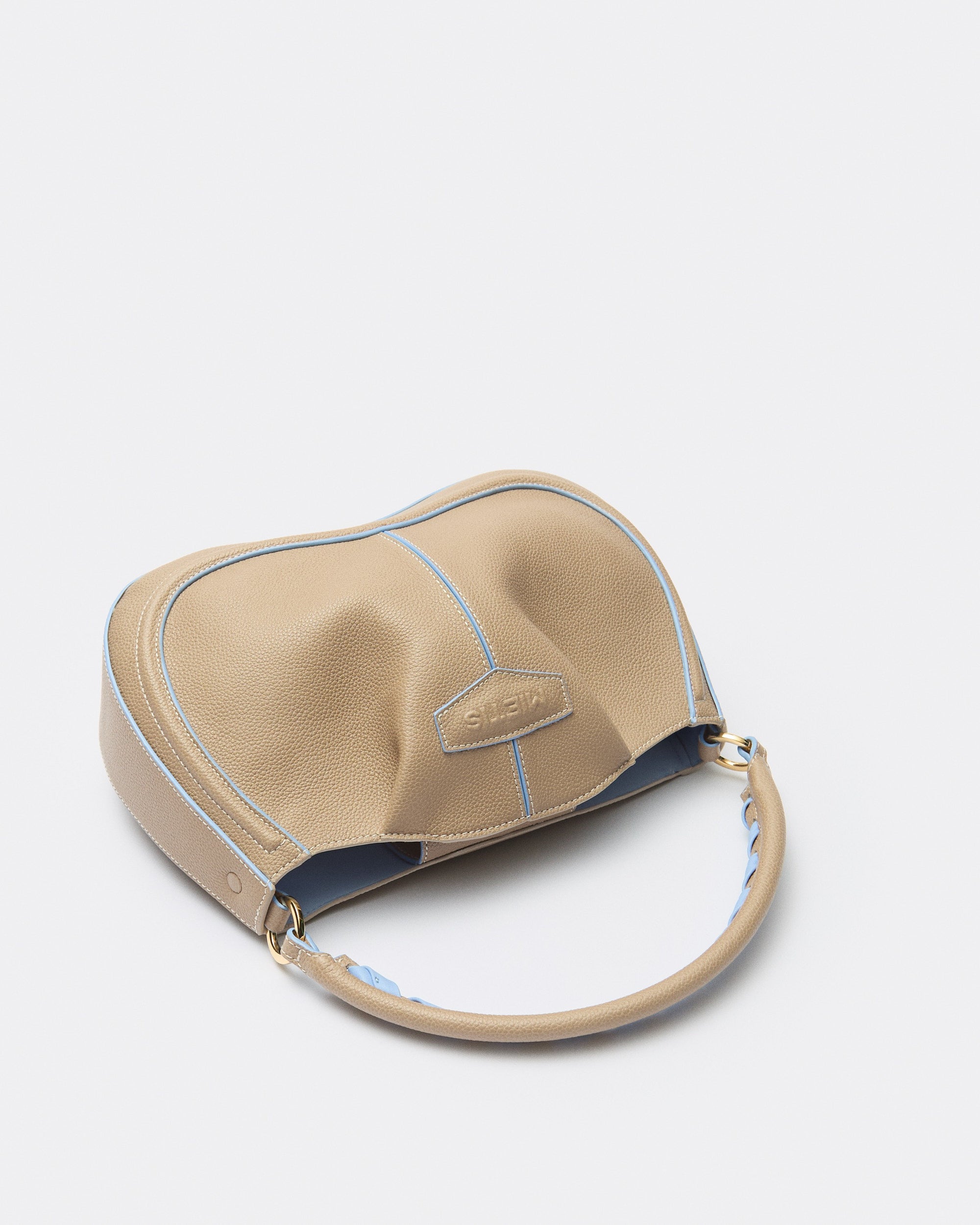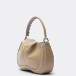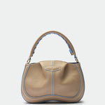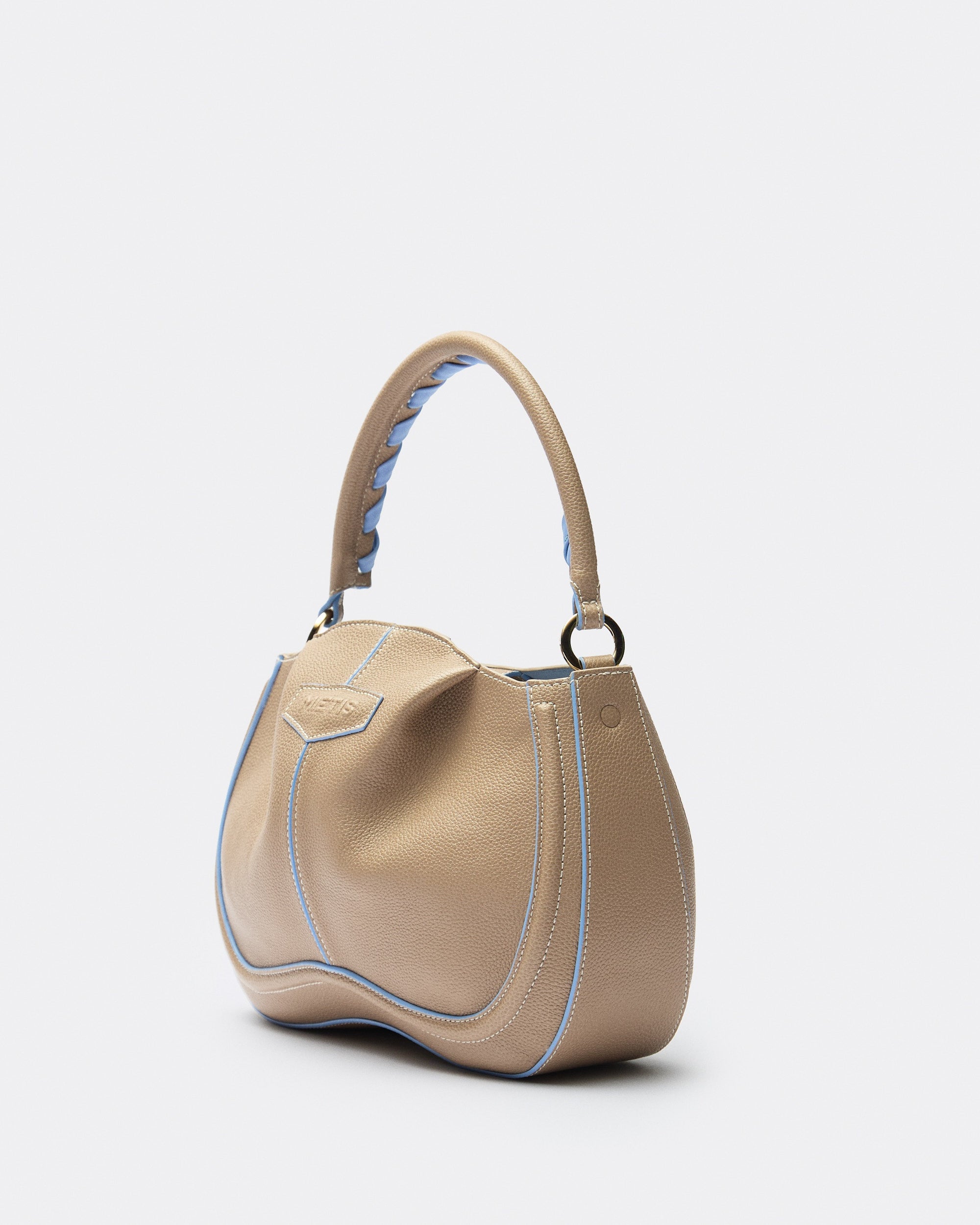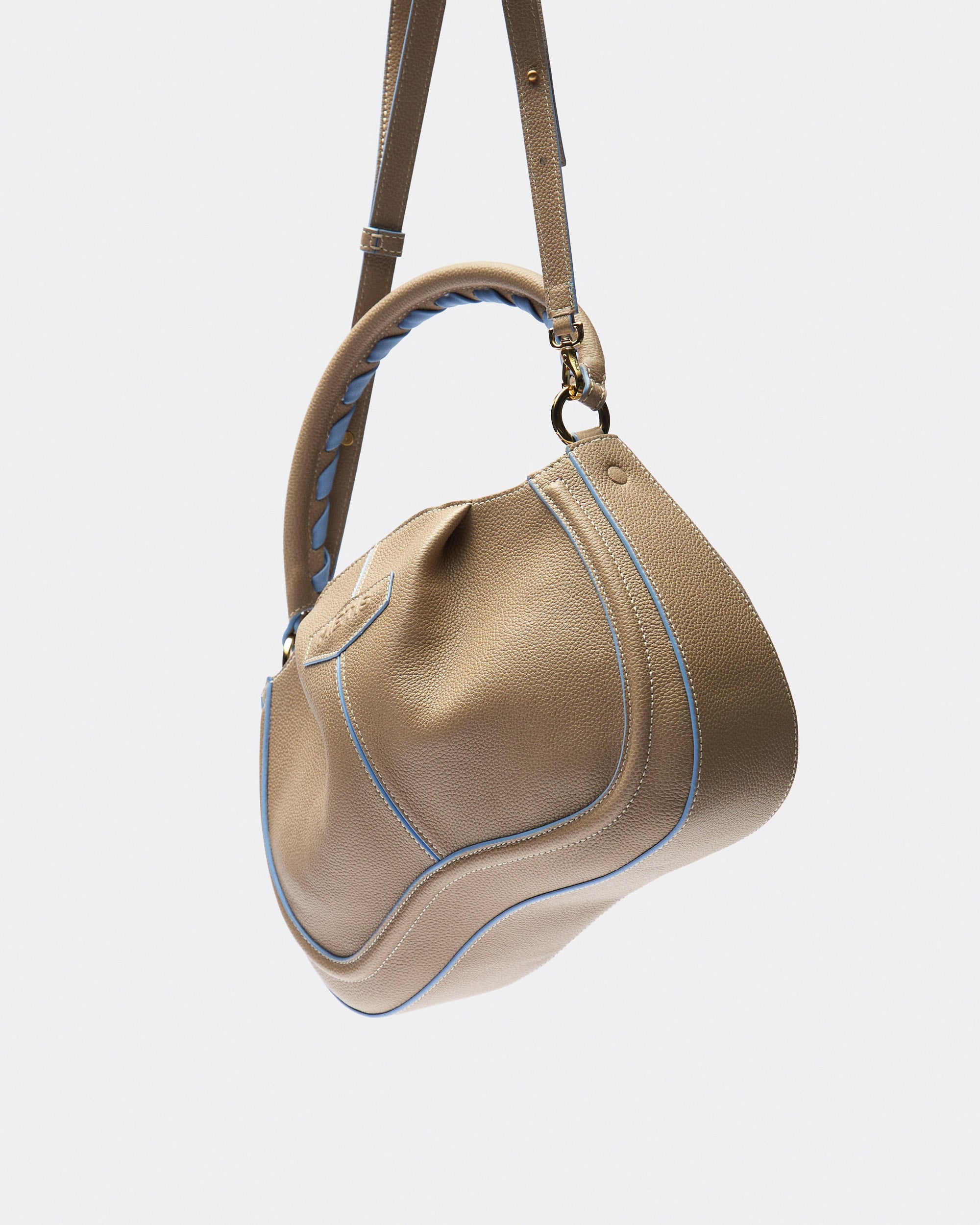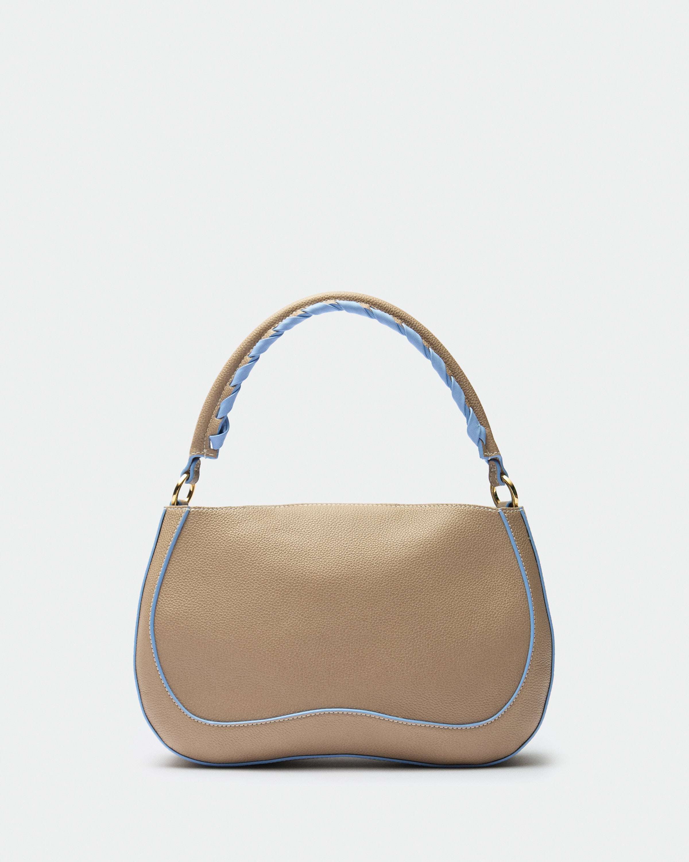 Compact, soft and essential, it is designed to move naturally with you. Its grained leather construction gives it durability and comfort, while the contrast piping and braided handle detail add a subtle graphic edge. The result is an everyday bag that feels practical, refined and quietly fresh.