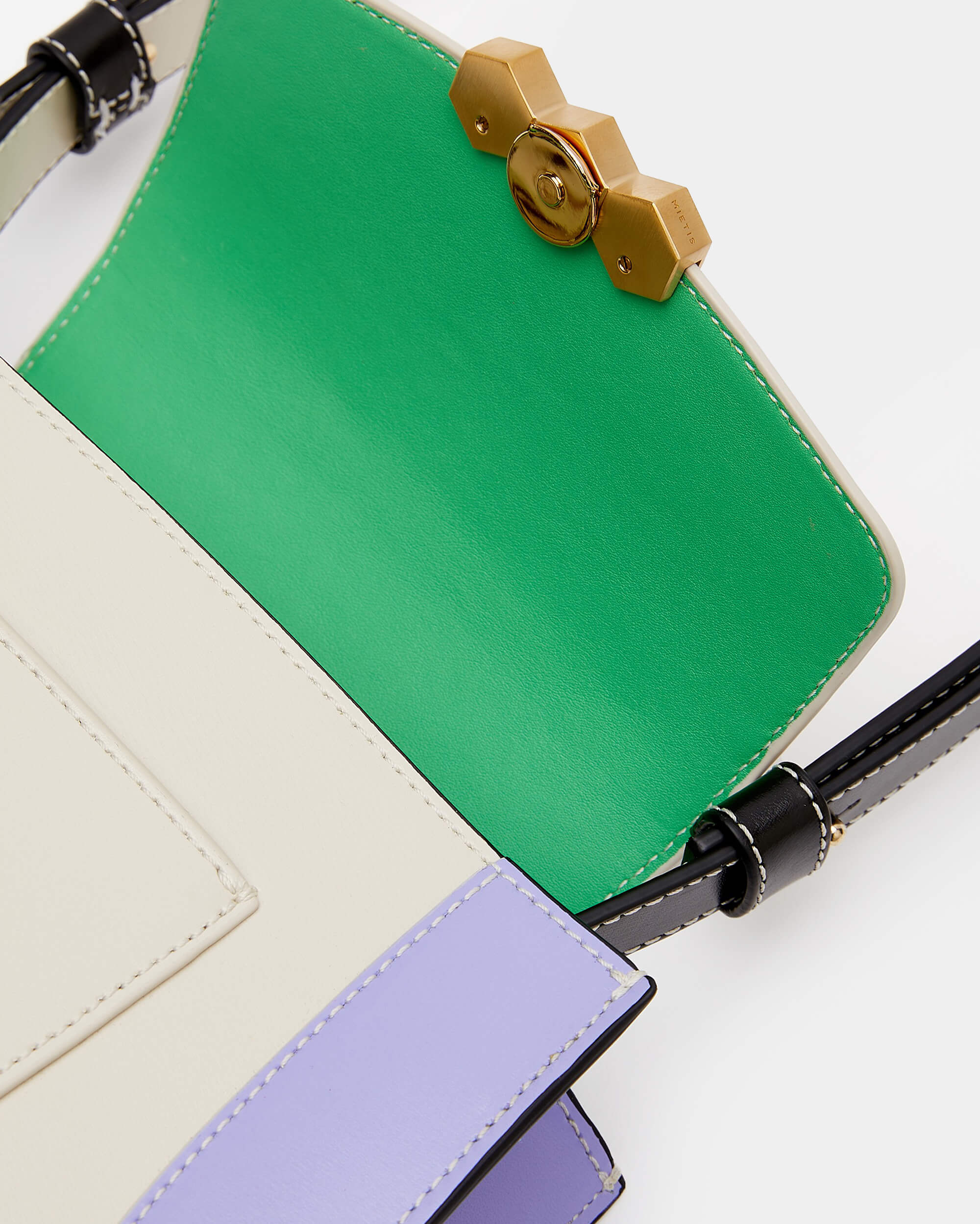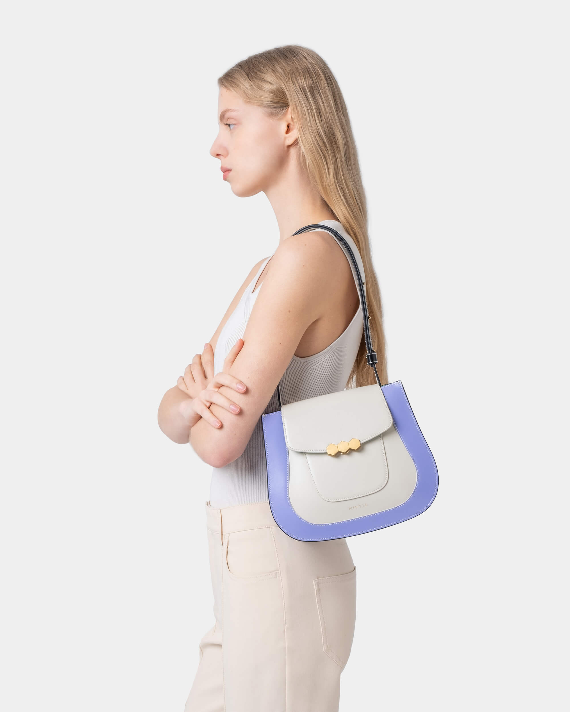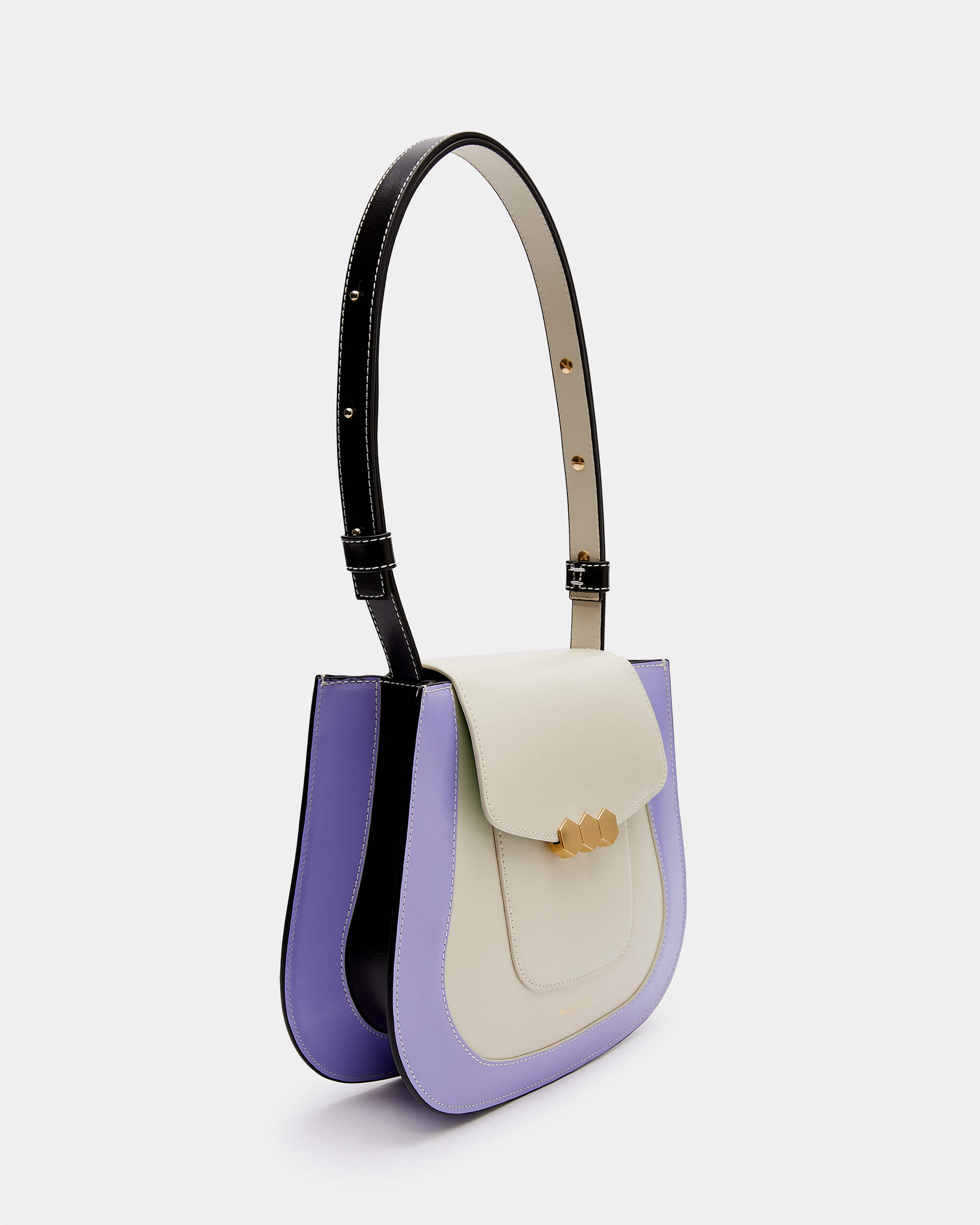 The Jill bag, inspired by the 70s, is a structured bag with a stiffer and shinier cowhide leather, applying the contemporary touch of Mietis with the detail of the hand-painted edges and contrasting stitching. The Jill bag is finished with a custom metallic closure: the three hexagons, which symbolize harmony and balance.