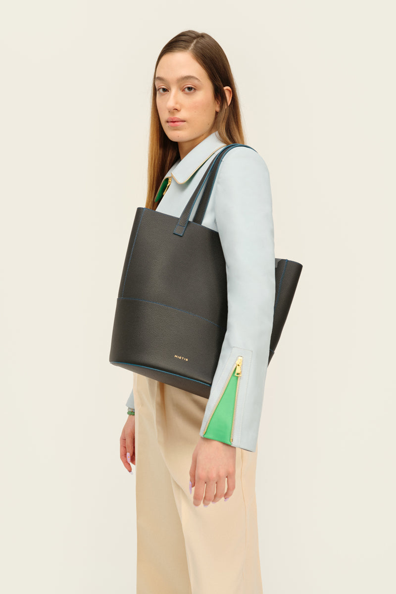 Soho tote bag in a small grain calf leather with a great resistance. Leather handles and two internal slip compartments. Its interior twin leather finishing for the interior gives an elegant touch. The hand-painted edges embodies Mietis’s artisanal know-how with a modern sensibility.