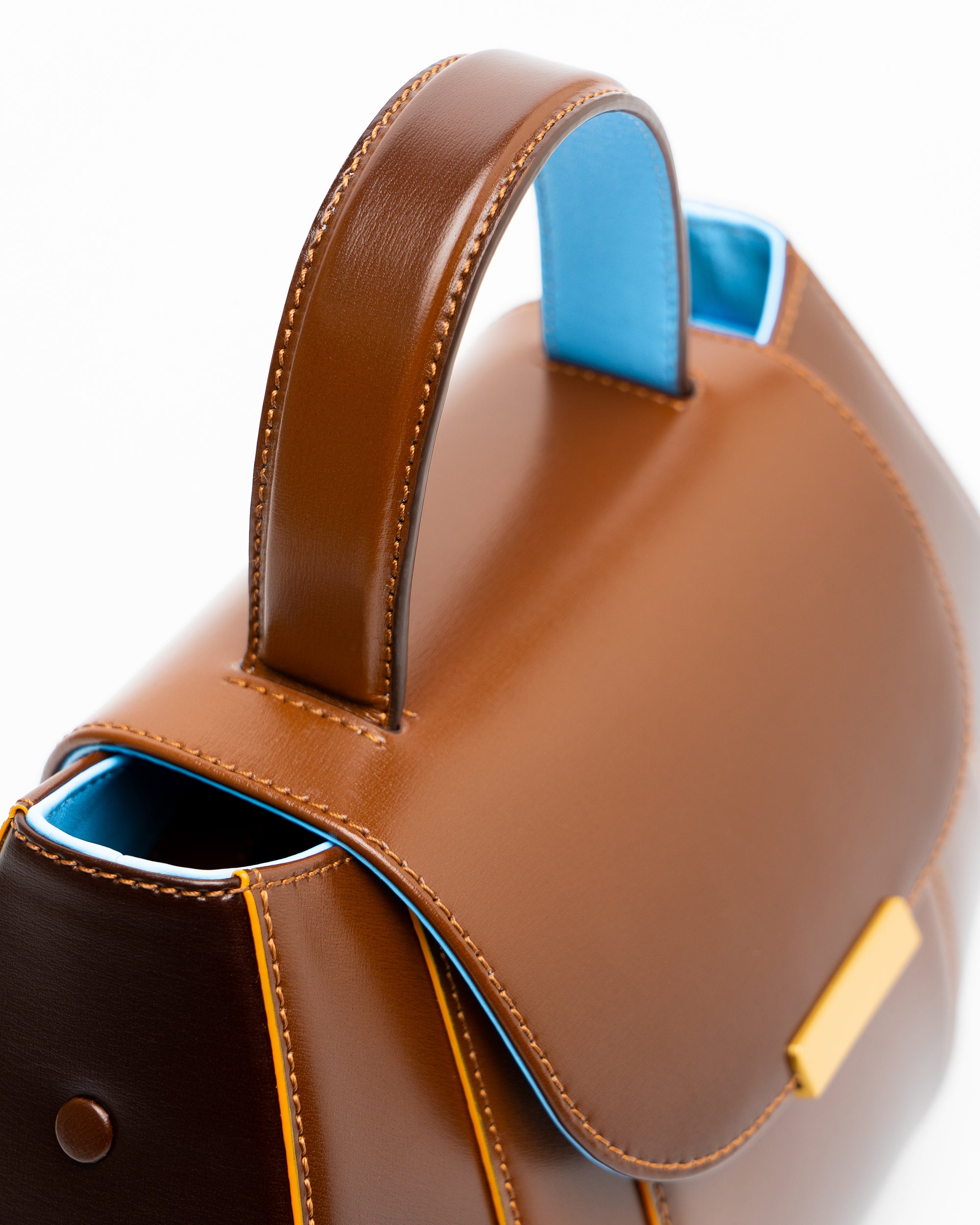 • Signature geometric lines with contrasting hand-painted edges and stitching