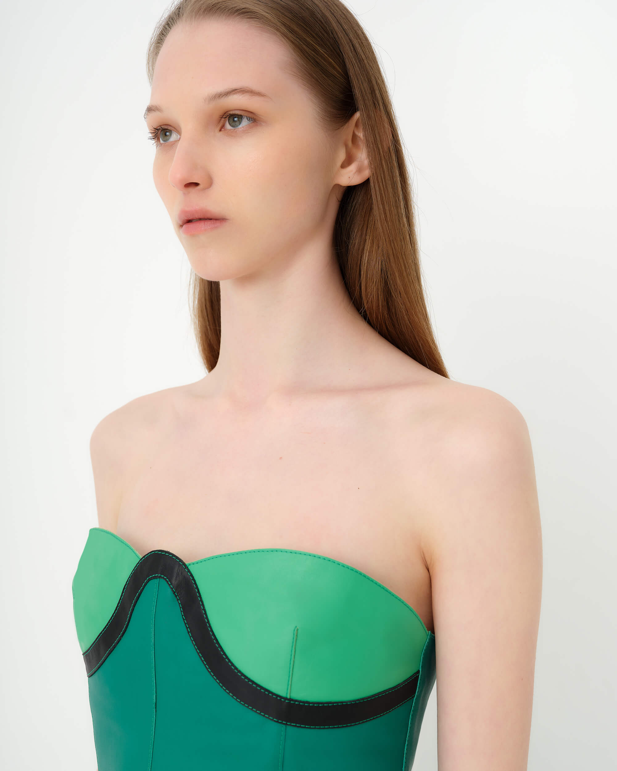 The Cleo Bustier is crafted from smooth calf leather. The design accentuates an assertive feminine silhouette, featuring a contrasting wave at the top.