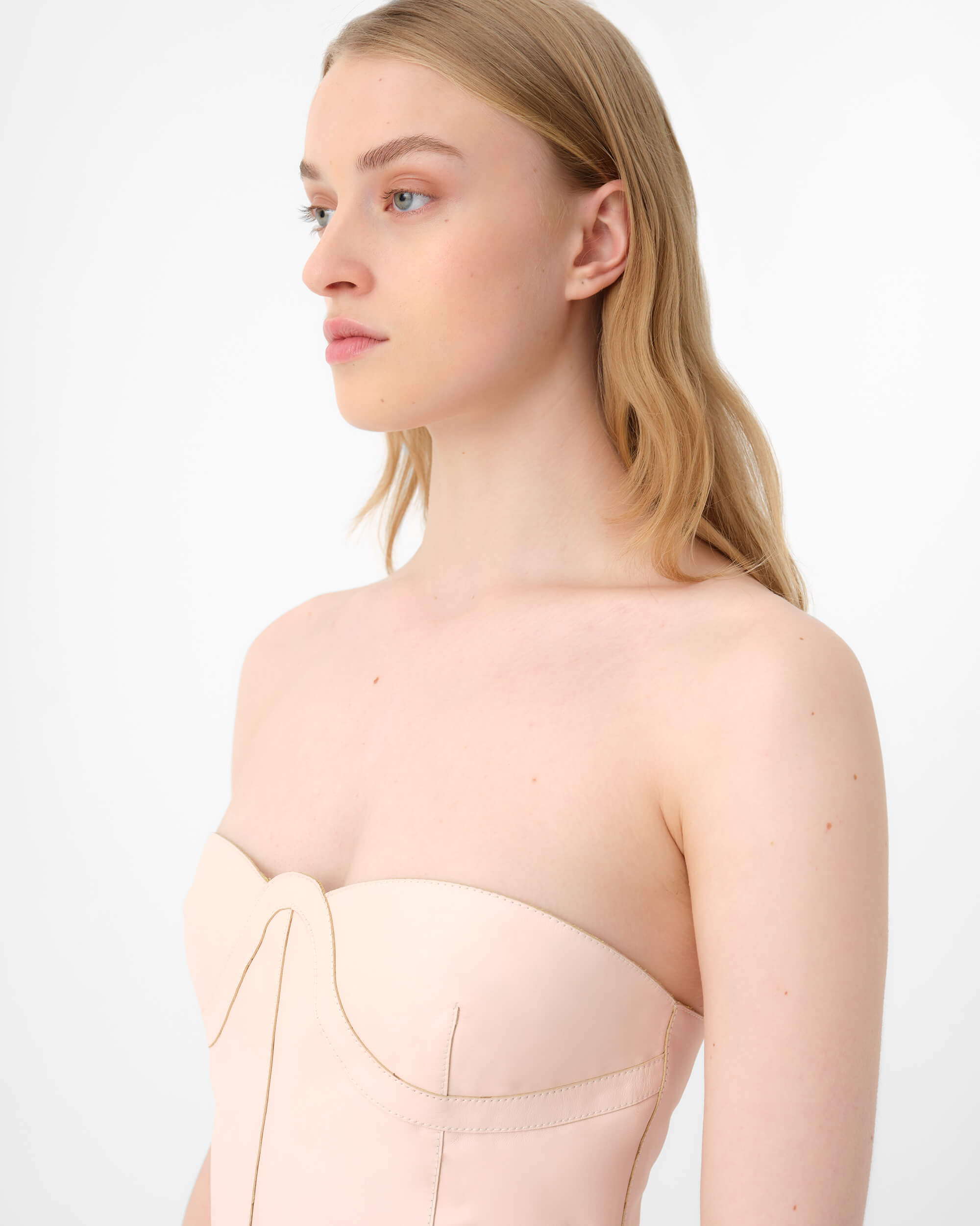 The Cleo Bustier is crafted from smooth calf leather. The design accentuates an assertive feminine silhouette, featuring a contrasting wave at the top.