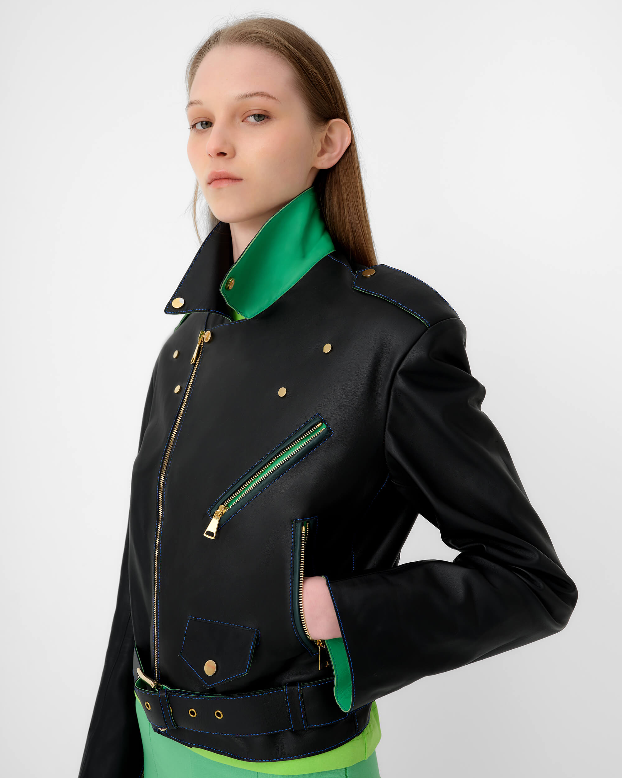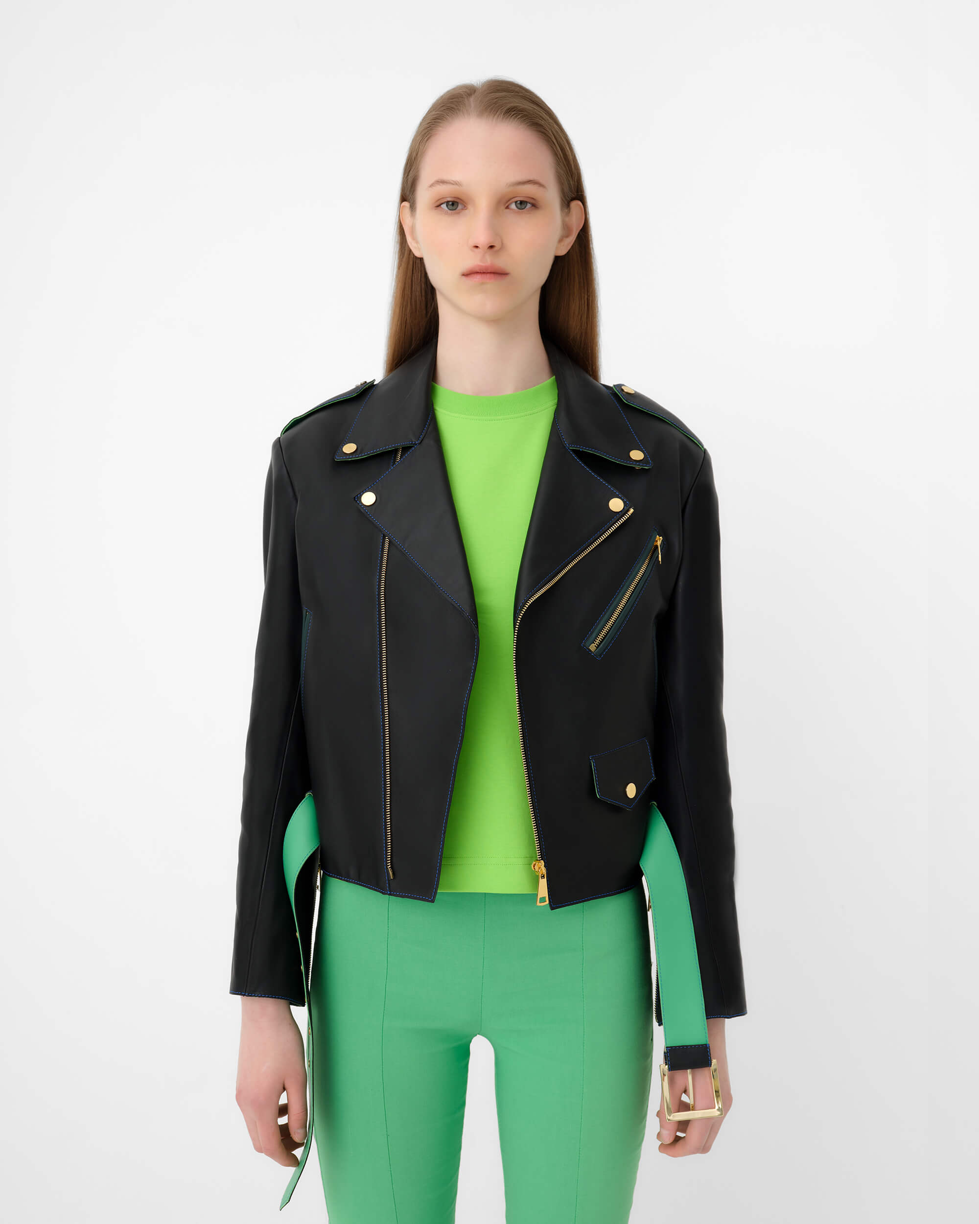 The Classic Biker is made with 100% calf leather. The design features a notched lapel collar with press-stud fastening. Offset zip closure and side pockets. Integrated adjustable belt at waist.