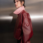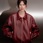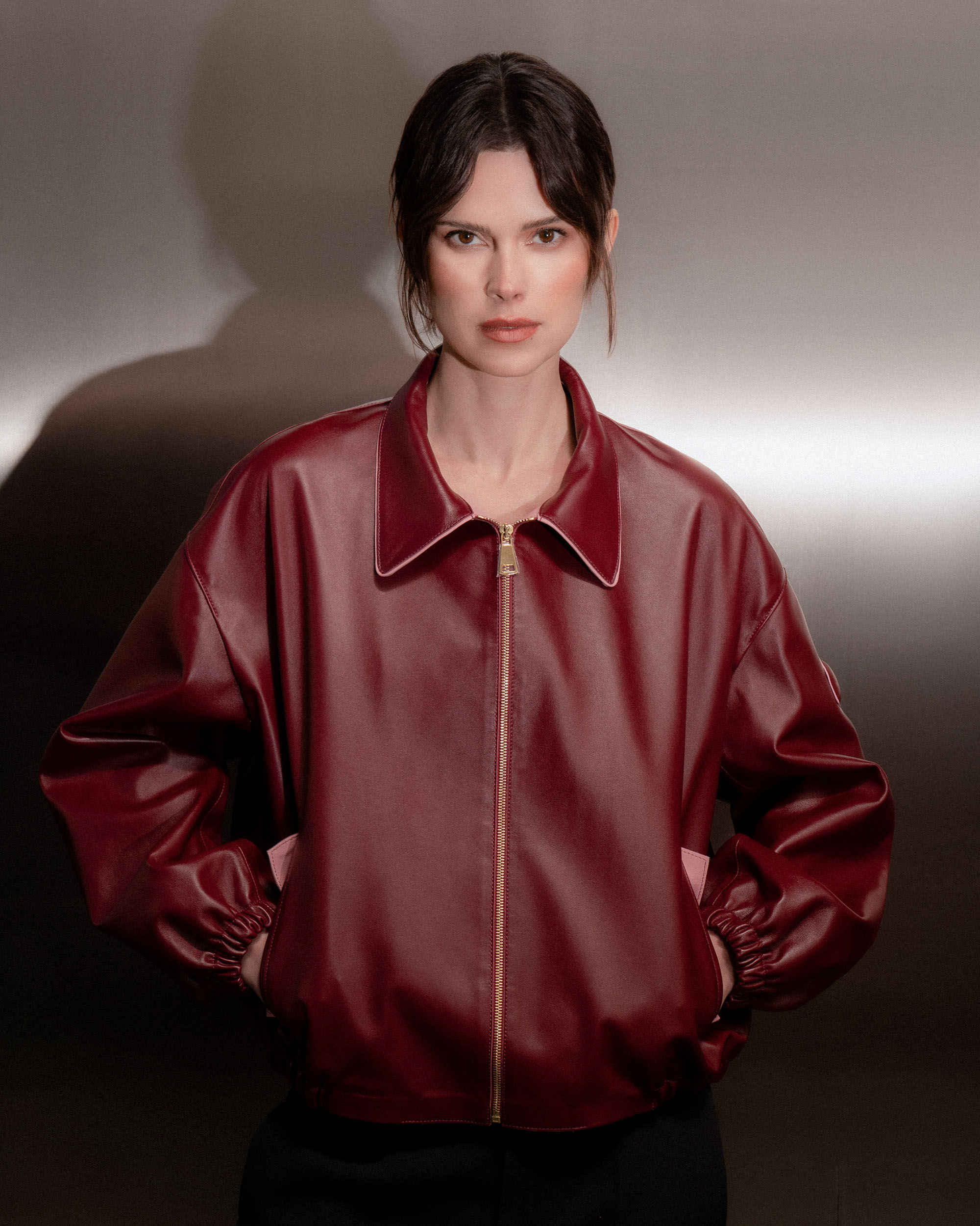 The Oversized Bomber is made from smooth calf leather and viscose lining. The piece features a gold metallic zipper front closure. The design of this garment includes a knitted Bomber collar, as well as gathers with elastic on the sleeves and hem for volume.