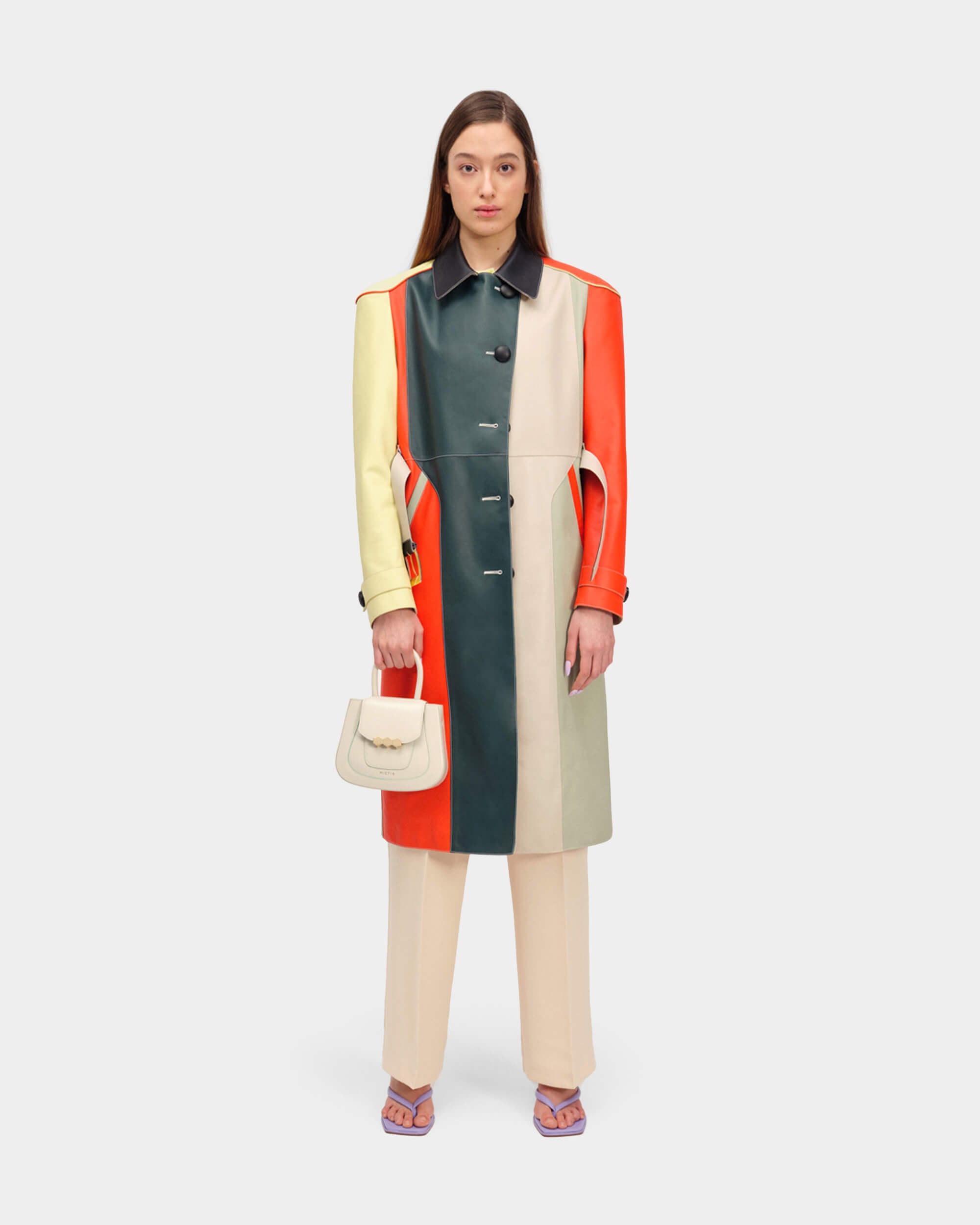 The refined material is showcased in pastel colors and meticulous stitching. The straight cut is modern and elegant.